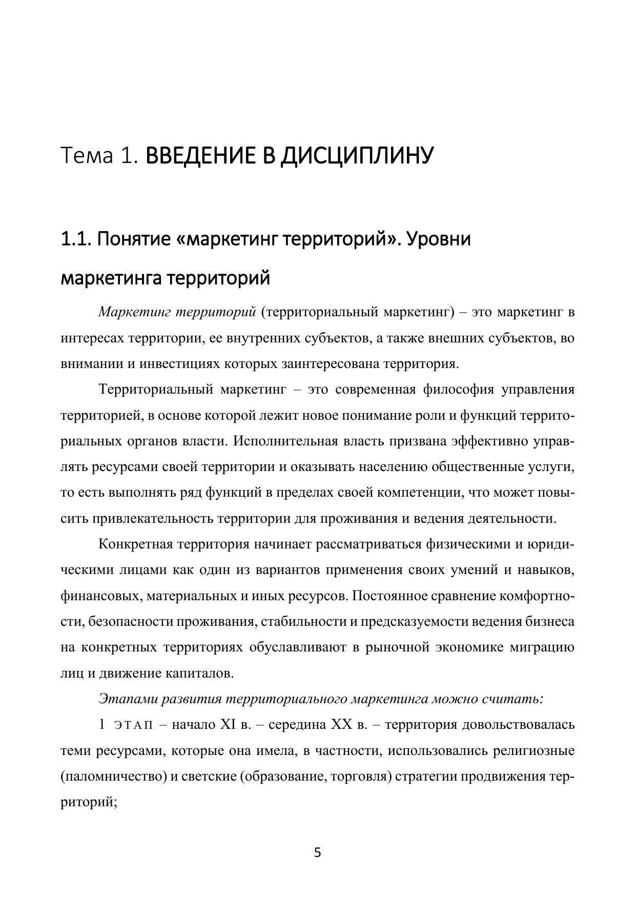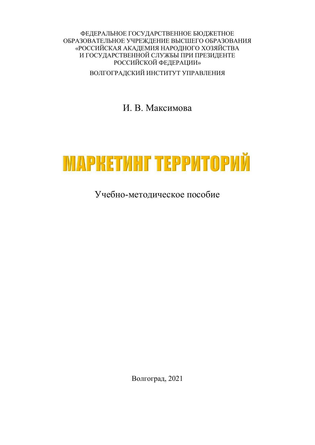 В учебно-методическом пособии освещены проблемы становления и развития маркетинга территорий в РФ. Рассмотрены вопросы планирования стратегии маркетинга и комплекса маркетинг-микс. Освещены особенности и принципы организации маркетинга страны, маркетинга региона, маркетинга города, маркетинга места, маркетинга личности. Учебное пособие предназначено для студентов, обучающихся по специальности «Государственное и муниципальное управление» в высших учебных заведениях, а также для специалистов по государственному и муниципальному управлению.