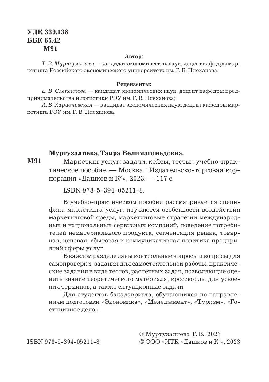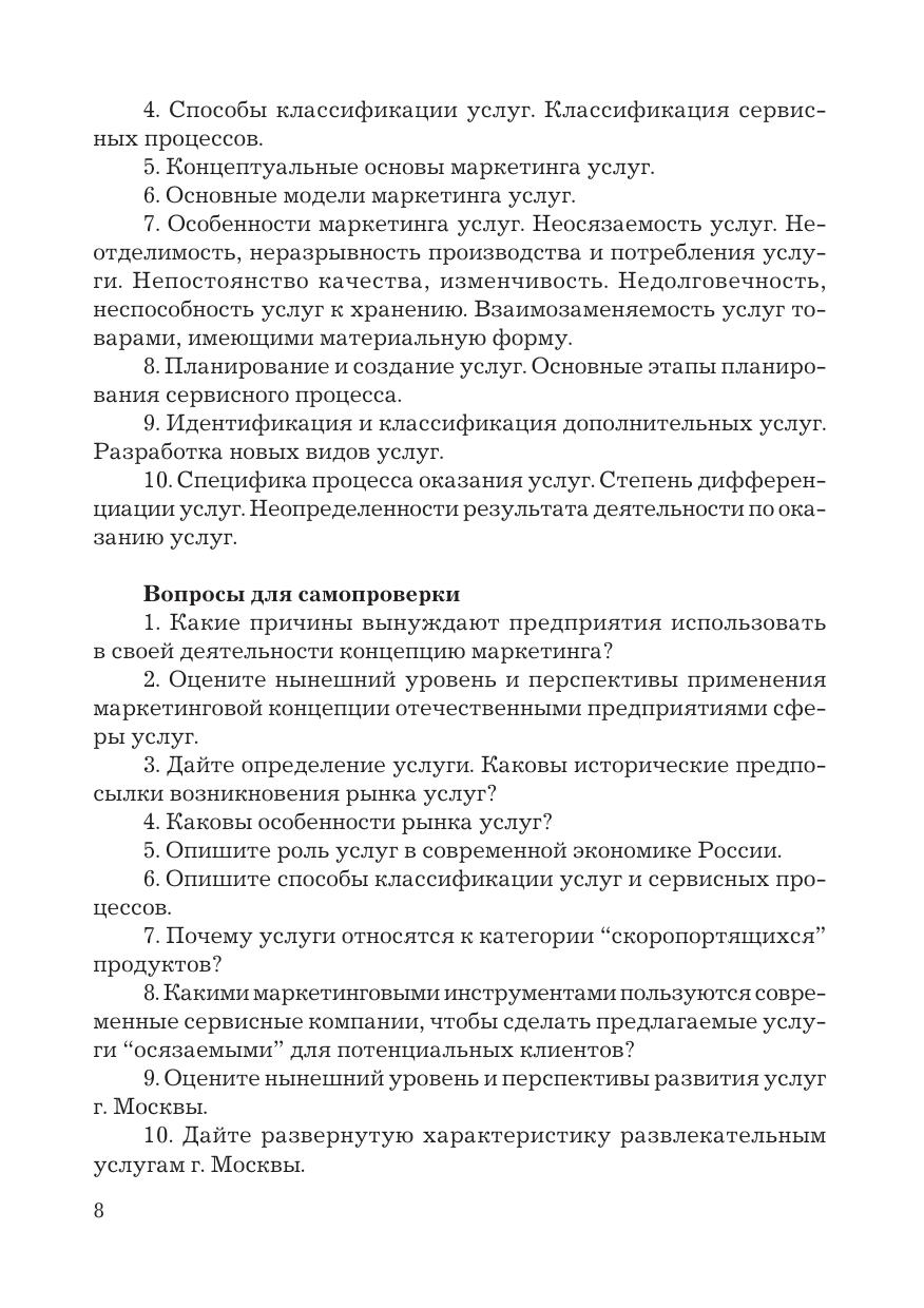 В учебно-практическом пособии рассматривается специфика маркетинга услуг, изучаются особенности воздействия маркетинговой среды, маркетинговые стратегии международных и национальных сервисных компаний, поведение потребителей нематериального продукта, сегментация рынка, товарная, ценовая, сбытовая и коммуникативная политика предприятий сферы услуг.