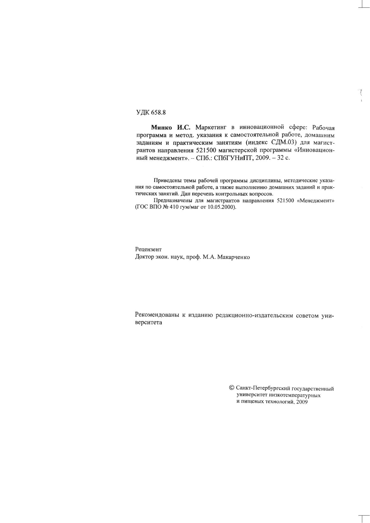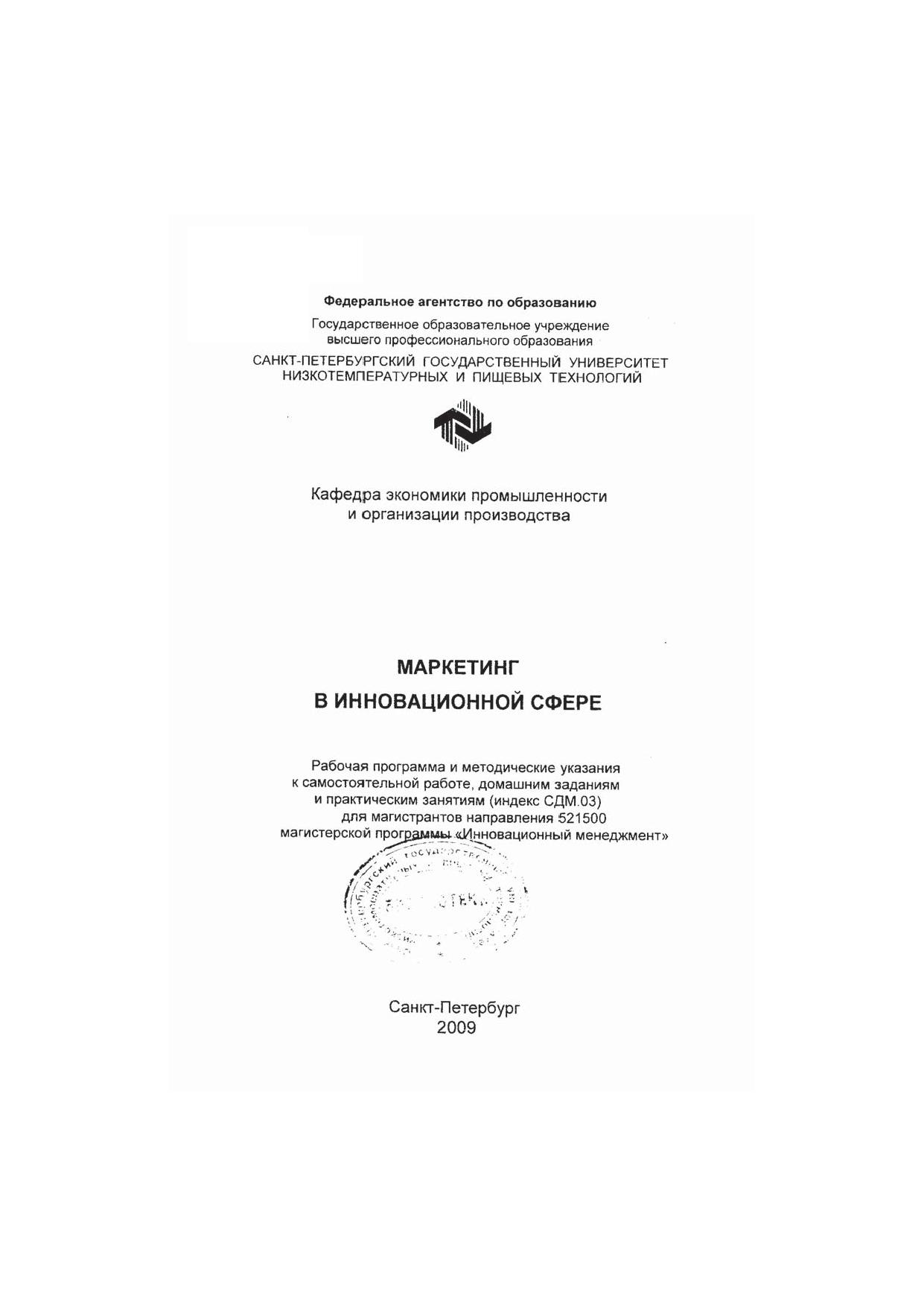 Маркетинг в инновационной сфере. Рабочая программа и методические указания к самостоятельной работе, домашним заданиям и практическим занятиям (индекс СДМ.ОЗ) для магистрантов направления 521500 магистерской программы «Инновационный менеджмент»