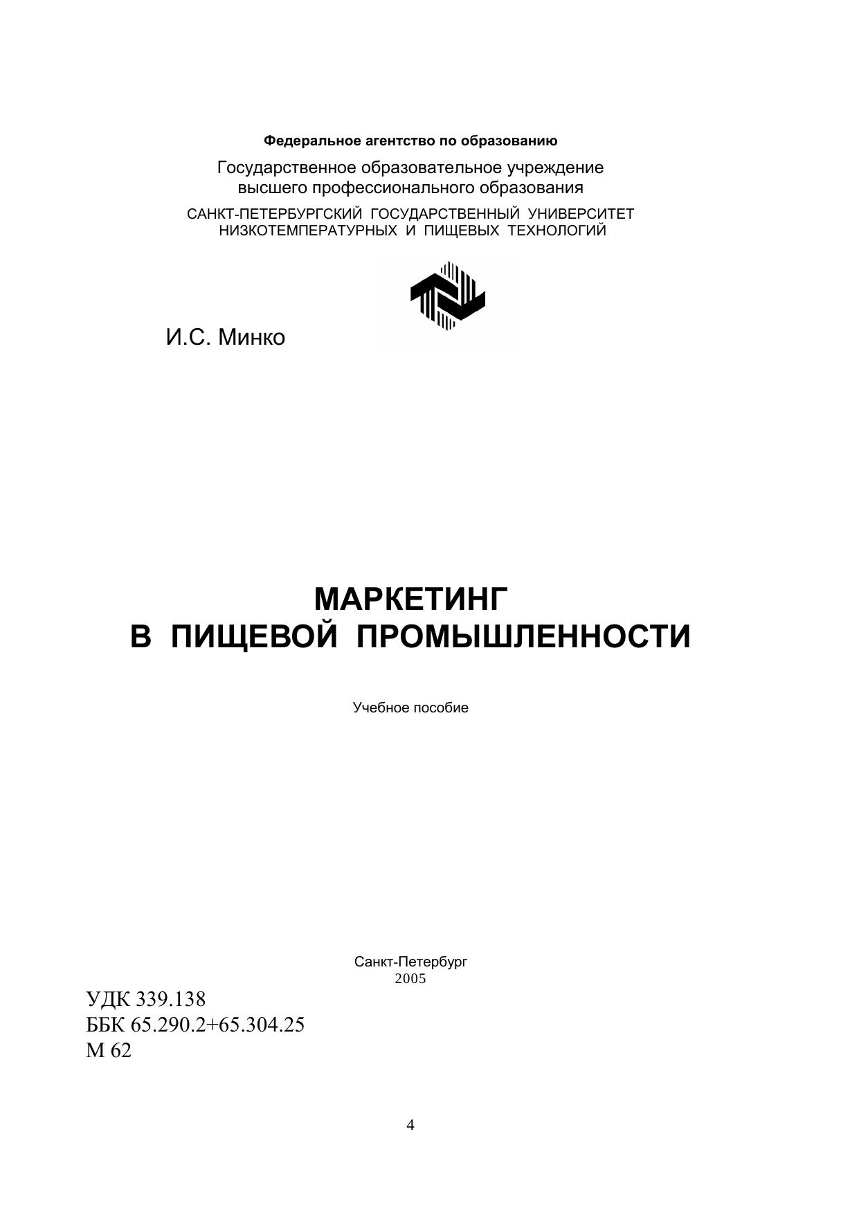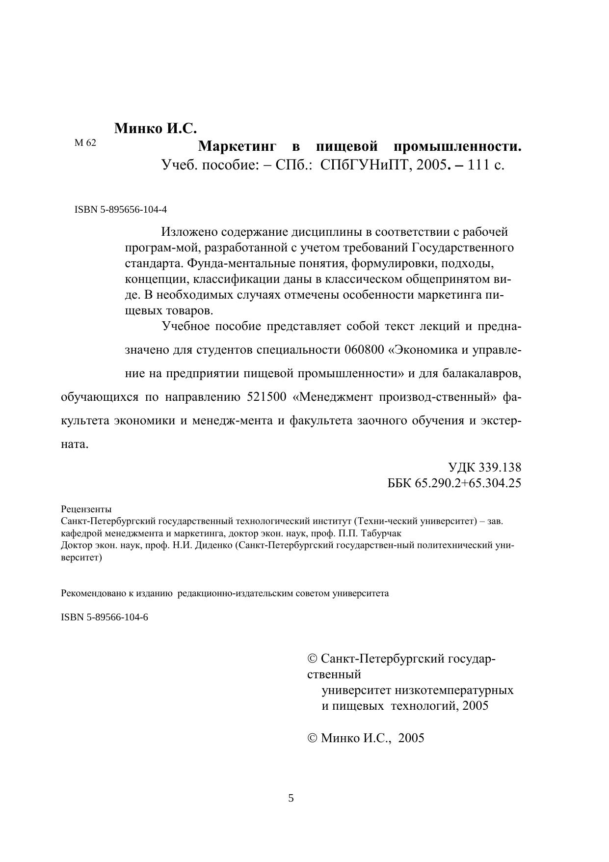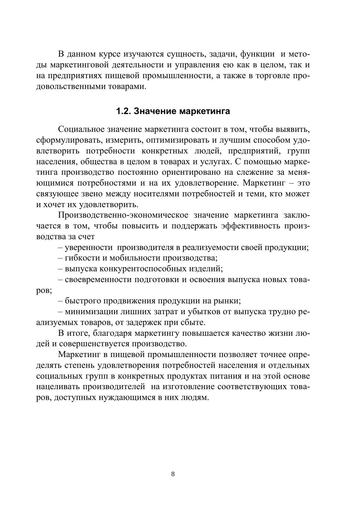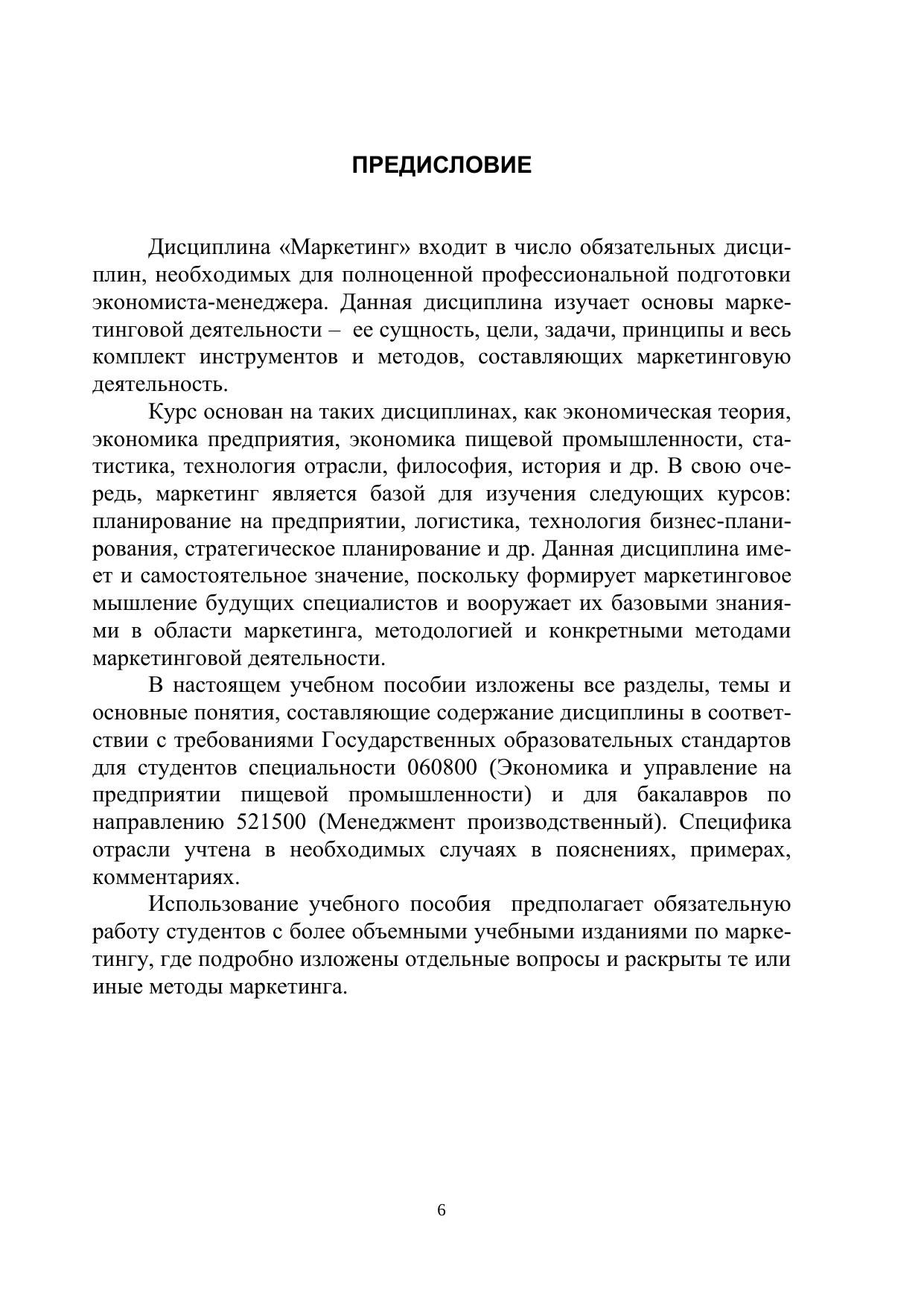 Изложено содержание дисциплины в соответствии с рабочей программой, разработанной с учетом требований Государственного стандарта. Фундаментальные понятия, формулировки, подходы, концепции, классификации даны в классическом общепринятом виде. В необходимых случаях отмечены особенности маркетинга пищевых товаров. Учебное пособие представляет собой текст лекций и предназначено для студентов специальности 060800 «Экономика и управление на предприятии пищевой промышленности» и для балакалавров, обучающихся по направлению 521500 «Менеджмент производственный» факультета экономики и менеджмента и факультета заочного обучения и экстерната.