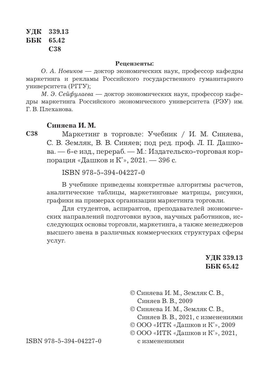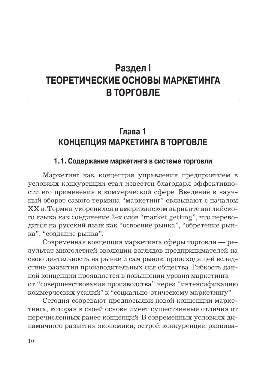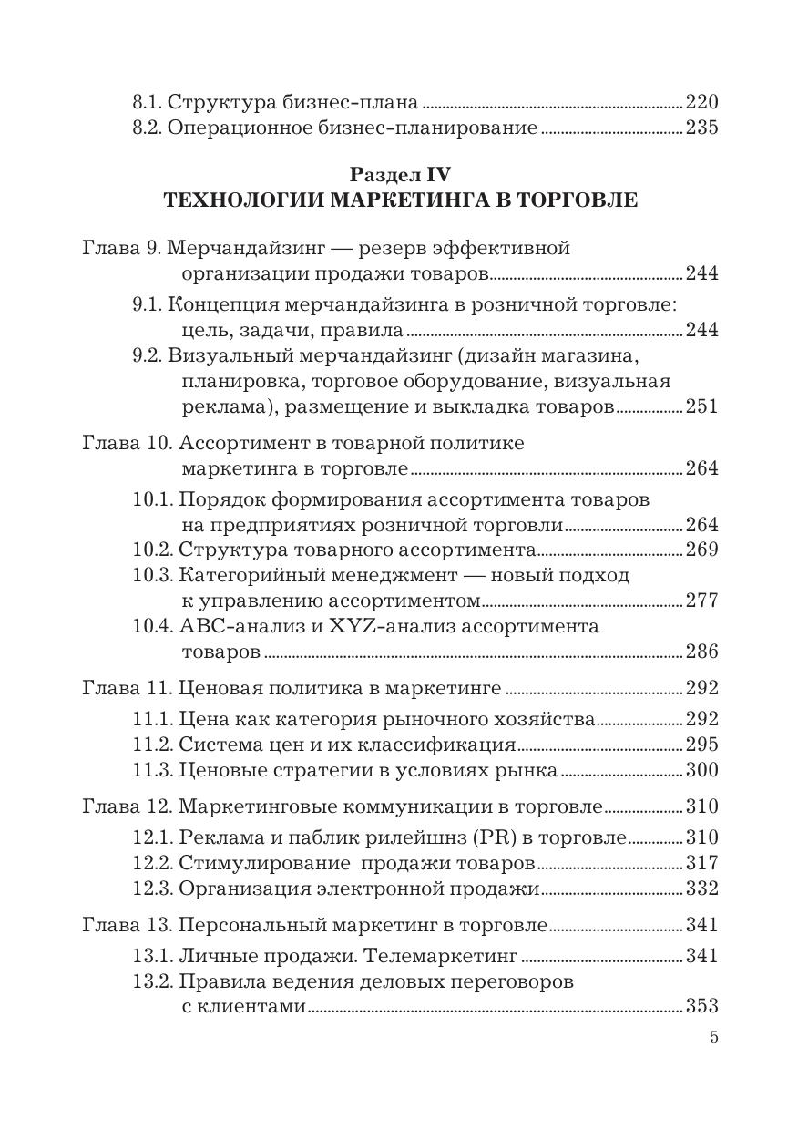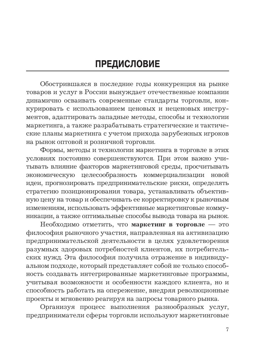 В учебнике раскрываются теоретические аспекты, механизм управления и планирования маркетинга в торговле. Особое внимание уделено характеристике маркетинговых технологий в торговле и методов оценки эффективности их использования. Важно, что в учебнике приведены конкретные алгоритмы расчетов, аналитические таблицы, маркетинговые матрицы, рисунки, графики на примерах организации маркетинга в торговле. Для студентов бакалавриата, обучающихся по направлениям подготовки «Торговое дело» и «Менеджмент», преподавателей экономических направлений подготовки вузов, научных работников, исследующих проблемы маркетинга в торговле, а также менеджеров различных коммерческих структур.