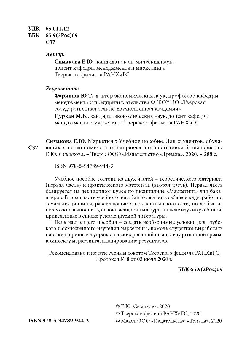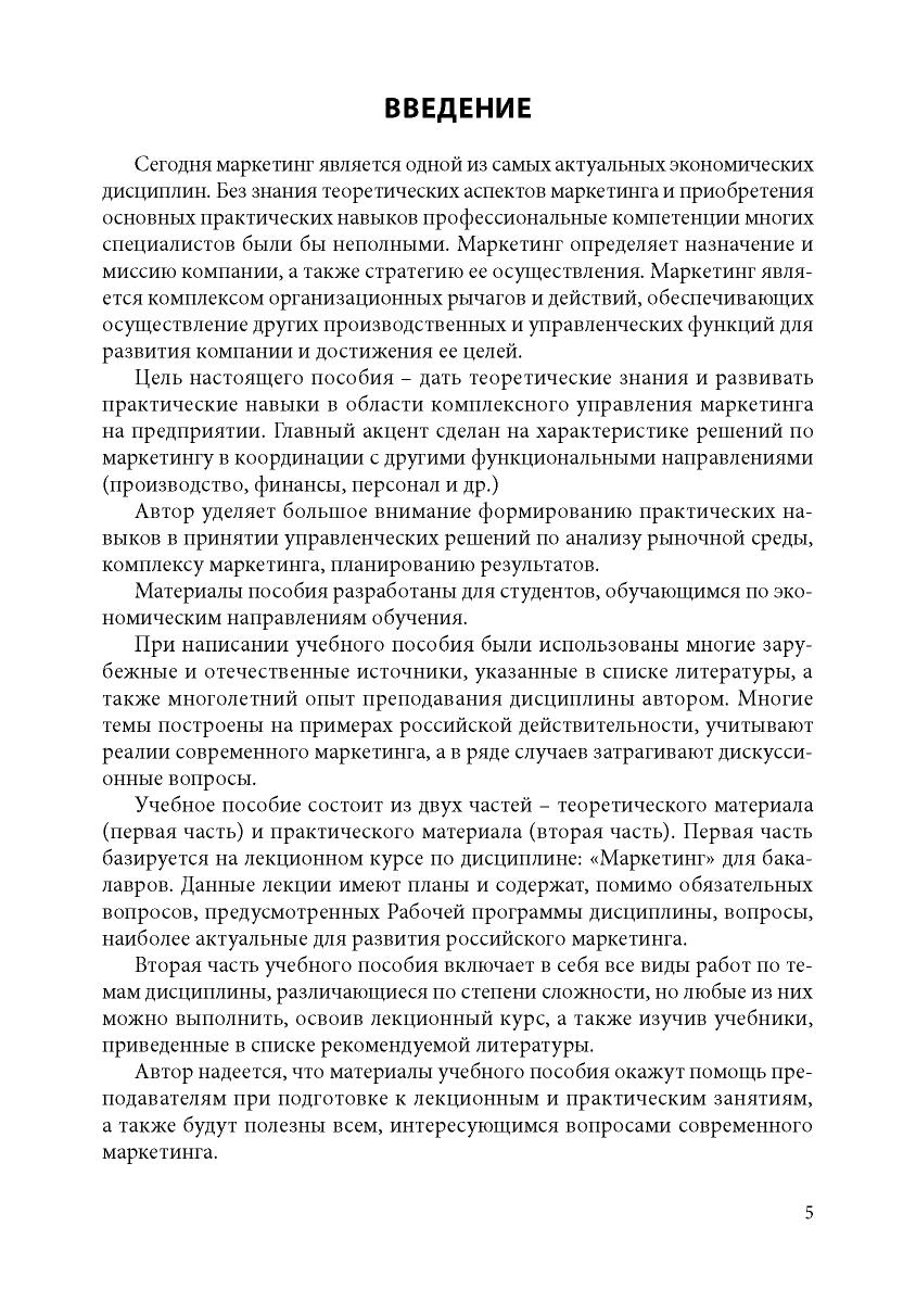 Учебное пособие состоит из двух частей – теоретического материала (первая часть) и практического материала (вторая часть). Первая часть базируется на лекционном курсе по дисциплине «Маркетинг» для бакалавров. Вторая часть учебного пособия включает в себя все виды работ по темам дисциплины, различающиеся по степени сложности, но любые из них можно выполнить, освоив лекционный курс, а также изучив учебники, приведенные в списке рекомендуемой литературы. Цель настоящего пособия – создать необходимые условия для глубокого и осмысленного изучения маркетинга, помочь студентам выработать навыки в принятии управленческих решений по анализу рыночной среды, комплексу маркетинга, планированию результатов.
