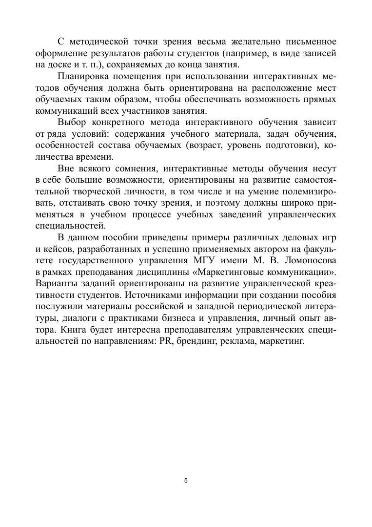 В учебно-методическом пособии приведены примеры различных деловых игр и кейсов, разработанных и успешно применяемых автором на факультете государственного управления МГУ им. М. В. Ломоносова в рамках преподавания дисциплины «Маркетинговые коммуникации».