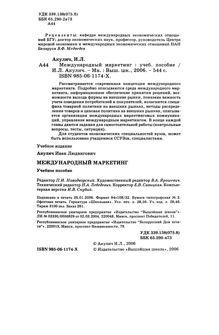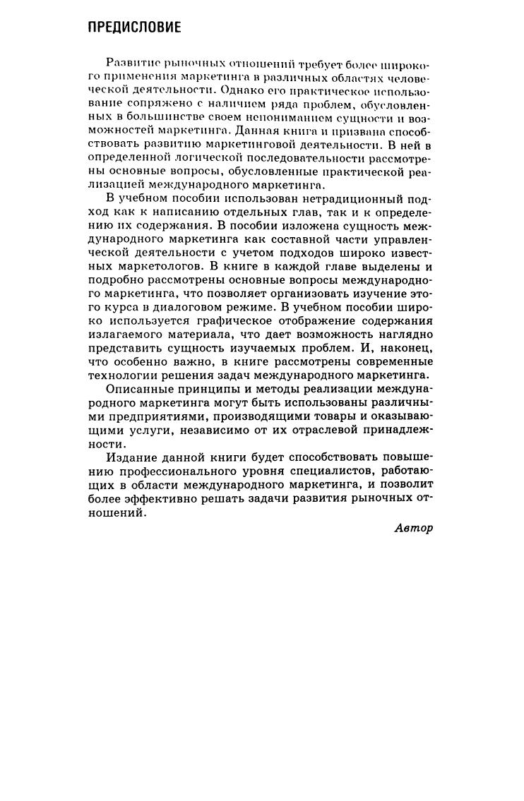 Рассматривается современная концепция международного маркетинга. Подробно описываются среда международного маркетинга, информационное обеспечение принятия решений, возможности выхода фирмы на внешние рынки, показана важность учета поведения потребителей и покупателей, излагаются специфика товарной политики на внешних рынках, методы распределения товаров и ценовая политика на внешних рынках, описывается организация международных маркетинговых коммуникаций, управление международным маркетингом. В конце каждой главы даются задания для самостоятельной работы (контрольные вопросы, тесты, ситуации). Для студентов экономических специальностей вузов, учащихся ССУЗов, специалистов.