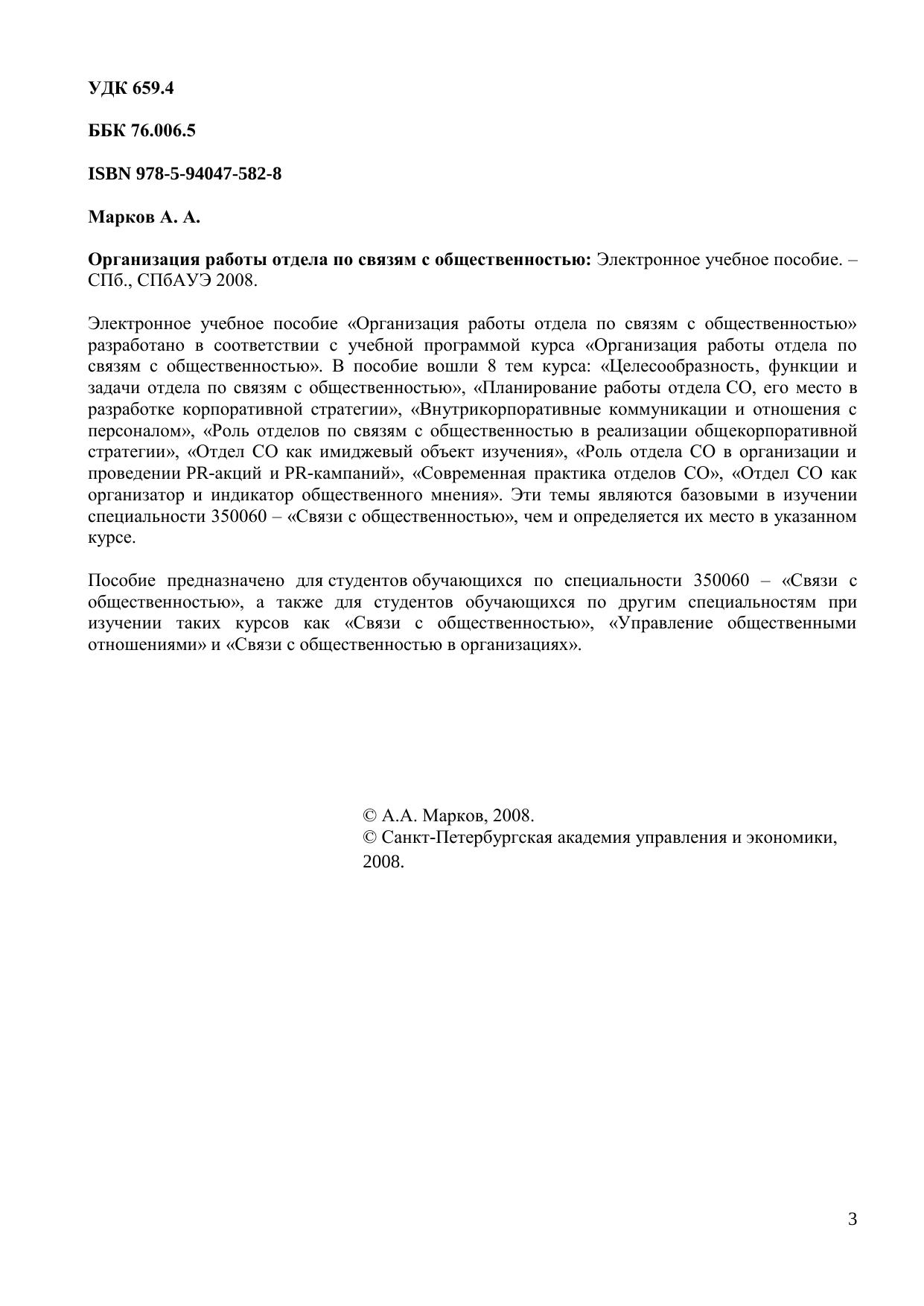 Электронное учебное пособие «Организация работы отдела по связям с общественностью» разработано в соответствии с учебной программой курса «Организация работы отдела по связям с общественностью». В пособие вошли 8 тем курса: «Целесообразность, функции и задачи отдела по связям с общественностью», «Планирование работы отдела СО, его место в разработке корпоративной стратегии», «Внутрикорпоративные коммуникации и отношения с персоналом», «Роль отделов по связям с общественностью в реализации общекорпоративной стратегии», «Отдел СО как имиджевый объект изучения», «Роль отдела СО в организации и проведении PR-акций и PR-кампаний», «Современная практика отделов СО», «Отдел СО какорганизатор и индикатор общественного мнения». Эти темы являются базовыми в изучении специальности 350060 – «Связи с общественностью», чем и определяется их место в указанном курсе. Пособие предназначено для студентов, обучающихся по специальности 350060 – «Связи с общественностью», а также для студентов, обучающихся по другим специальностям при изучении таких курсов как «Связи с общественностью», «Управление общественными отношениями» и «Связи с общественностью в организациях». Электронное учебное пособие для дистанционного обучения