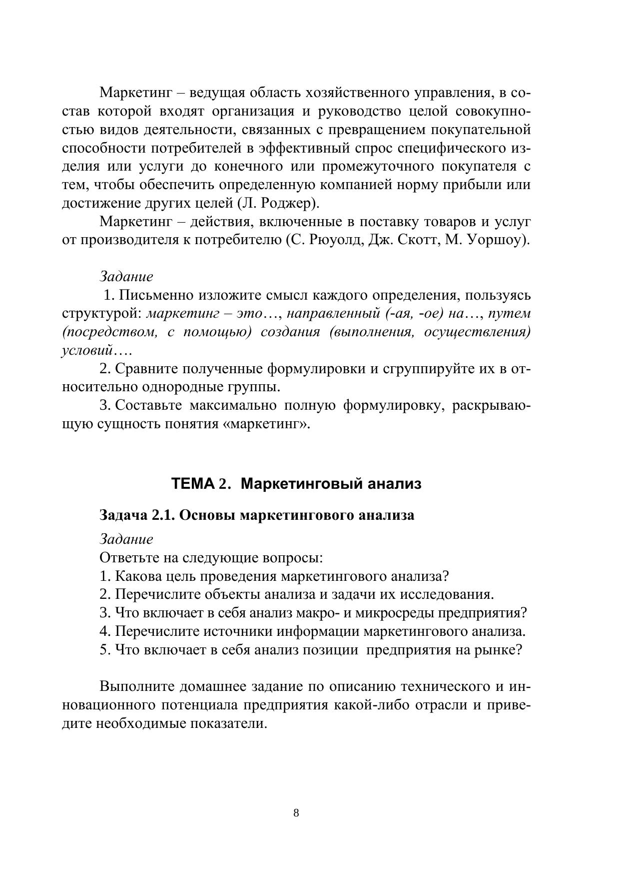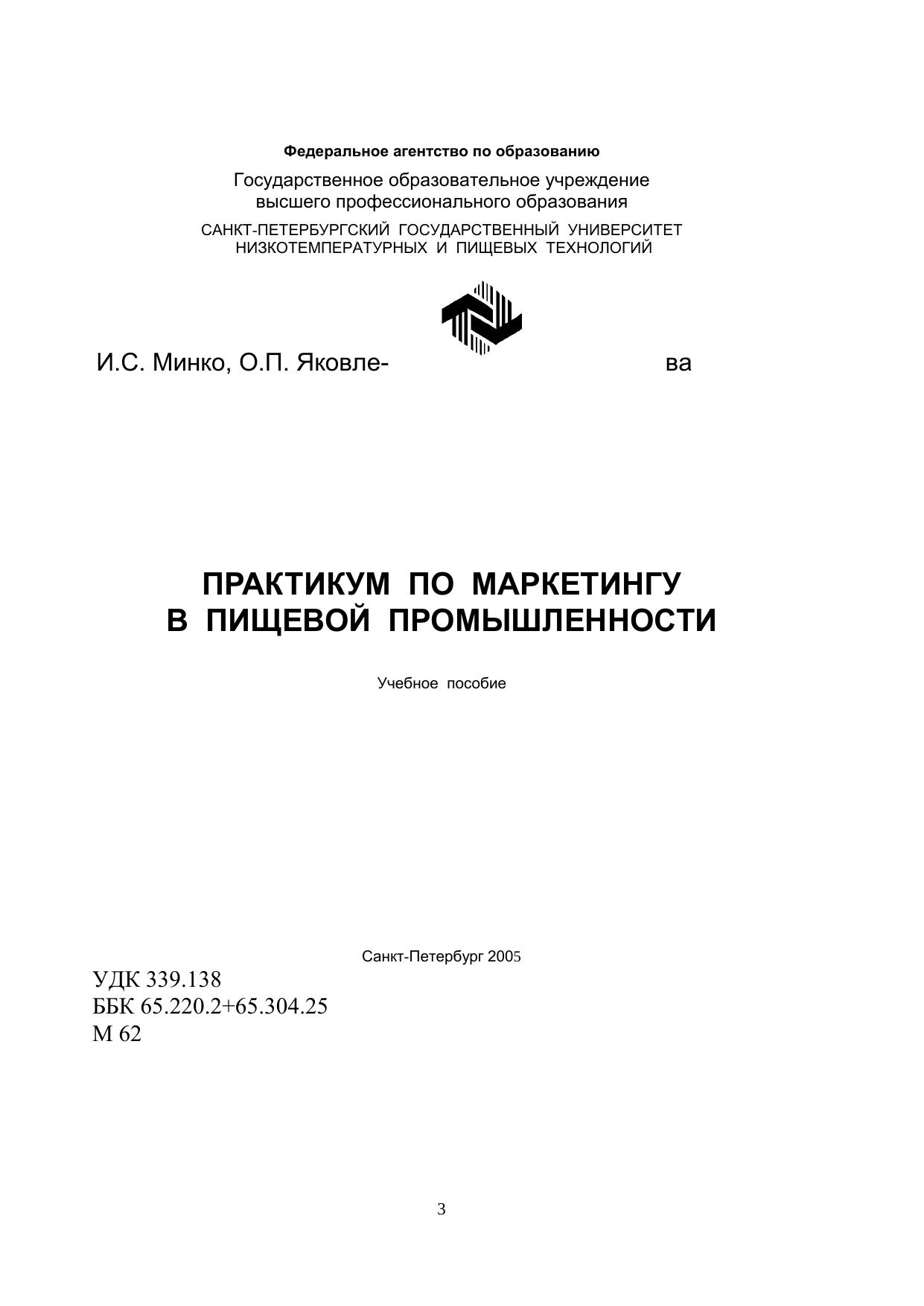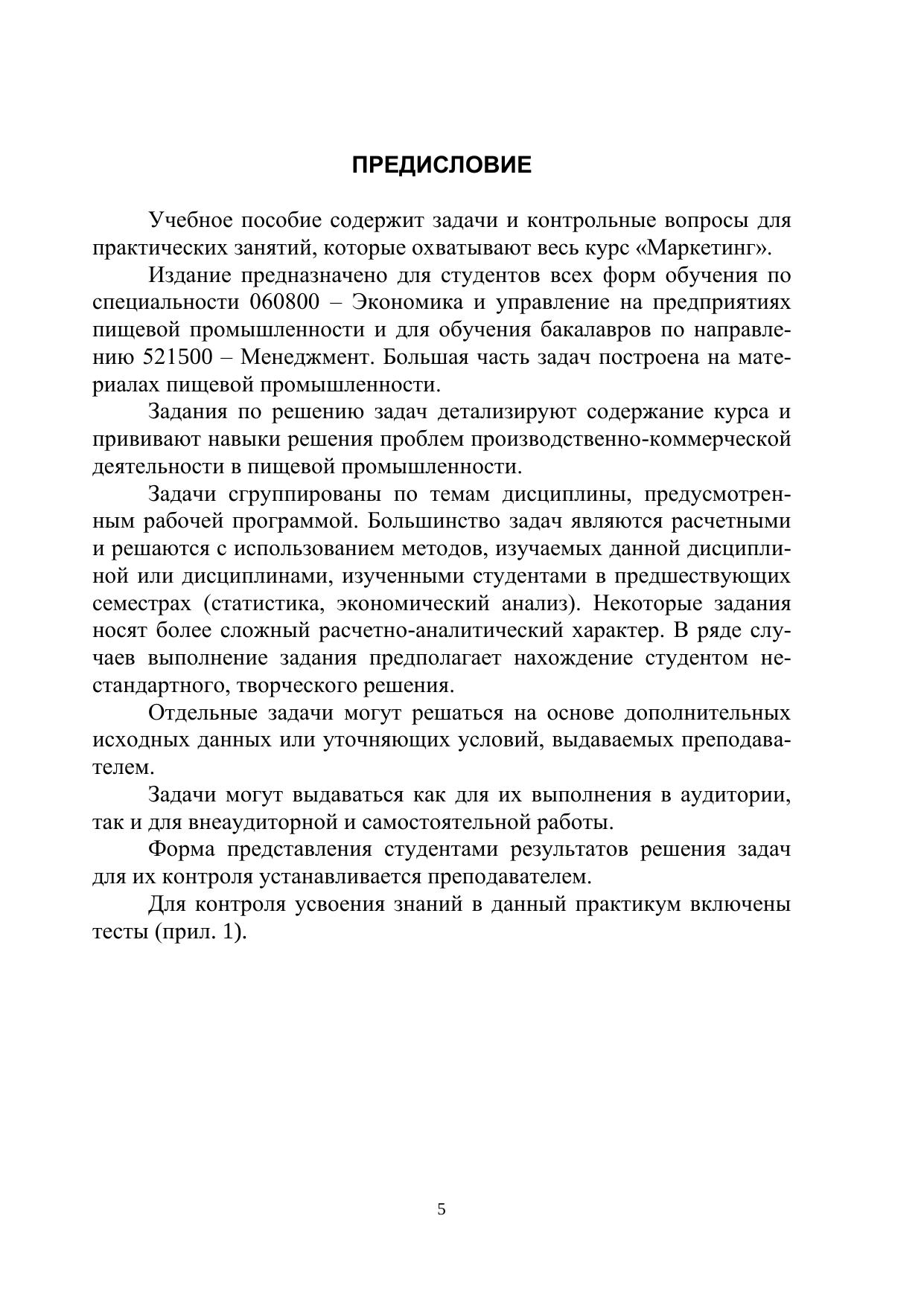 Практикум содержит задачи, контрольные вопросы и вопросы для тестирования студентов по всем темам курса «Маркетинг». По наиболее сложным задачам даны методические рекомендации или образцы их решения. Приводится список литературы.Учебное пособие предназначено для студентов специальности 060800 – «Экономика и управление на предприятиях пищевой промышленности» и для бакалавров по направлению 521500 – «Менеджмент» факультета экономики и менеджмента и факультета заочного обучения и экстерната