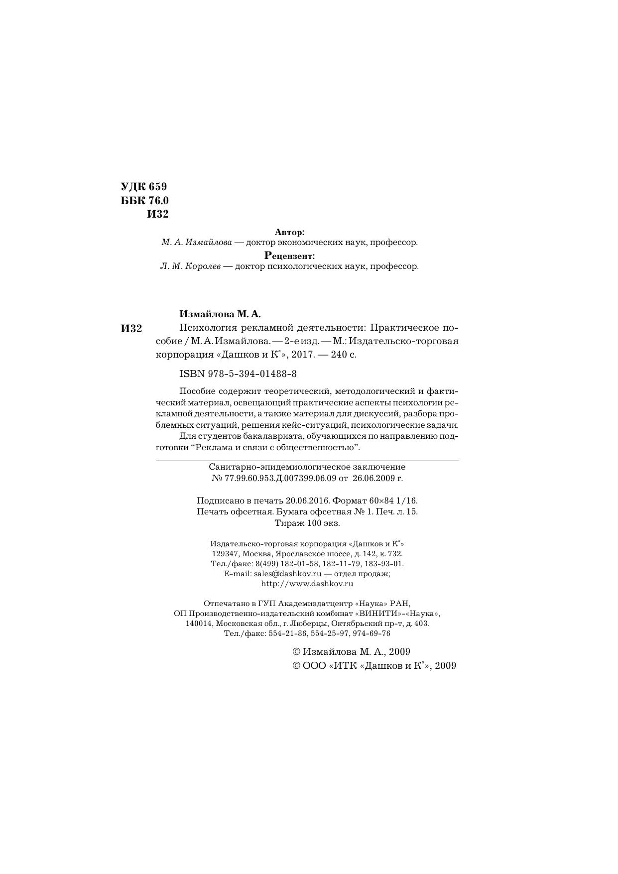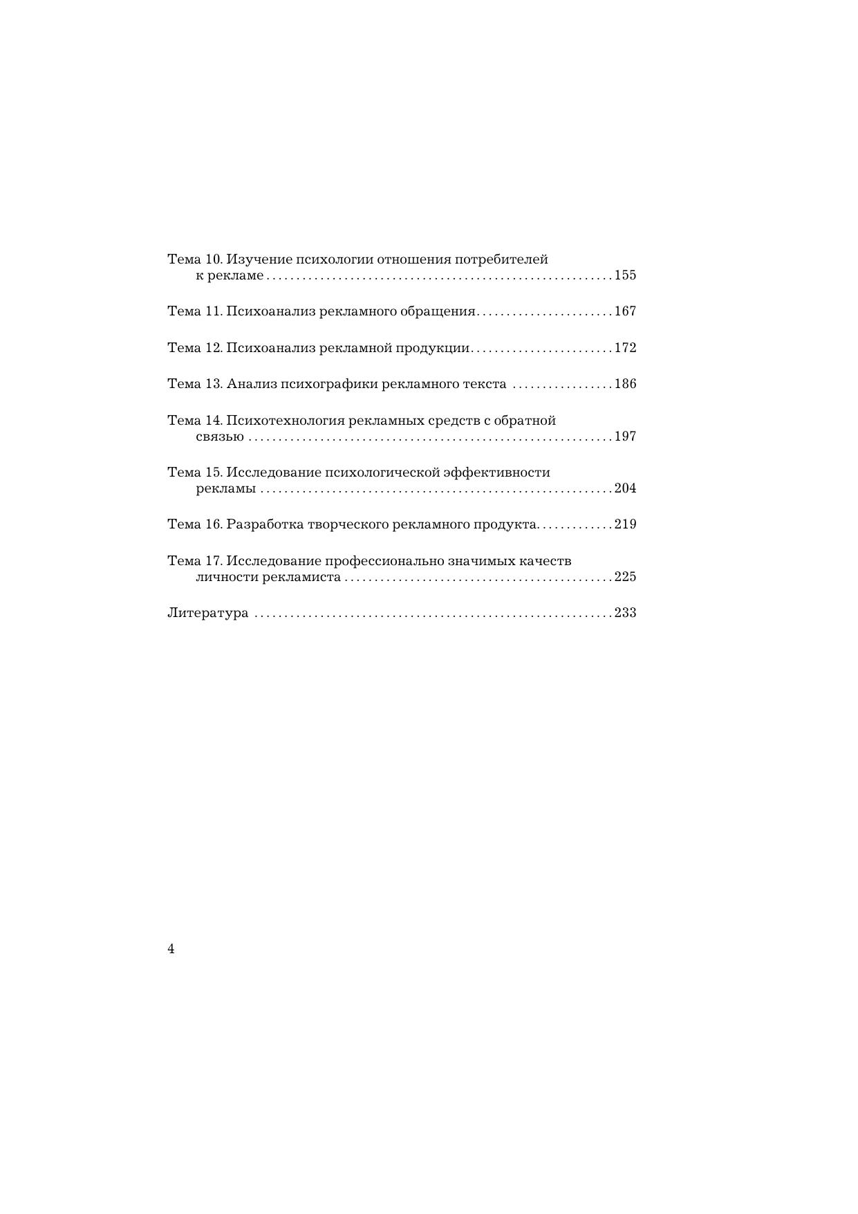 Пособие содержит теоретический, методологический и фактический материал, освещающий практические аспекты психологии рекламной деятельности, а также материал для дискуссий, разбора проблемных ситуаций, решения кейс-ситуаций, психологические задачи. В пособие входят психологические и деловые игры, позволяющие проводить практические занятия в режиме тренинга, направленные на формирование психологической компетентности студентов в области создания профессиональной рекламы, развитие коммуникативных умений, выявление индивидуально-личностных особенностей и профессионально значимых качеств будущих рекламистов. Результаты психодиагностики могут быть использованы в психологическом консультировании студентов по планированию карьеры в рекламном деле. Для студентов специальности "Реклама", преподавателей и студентов вузов, менеджеров рекламы и всех, кто интересуется проблемами психологии рекламной деятельности.