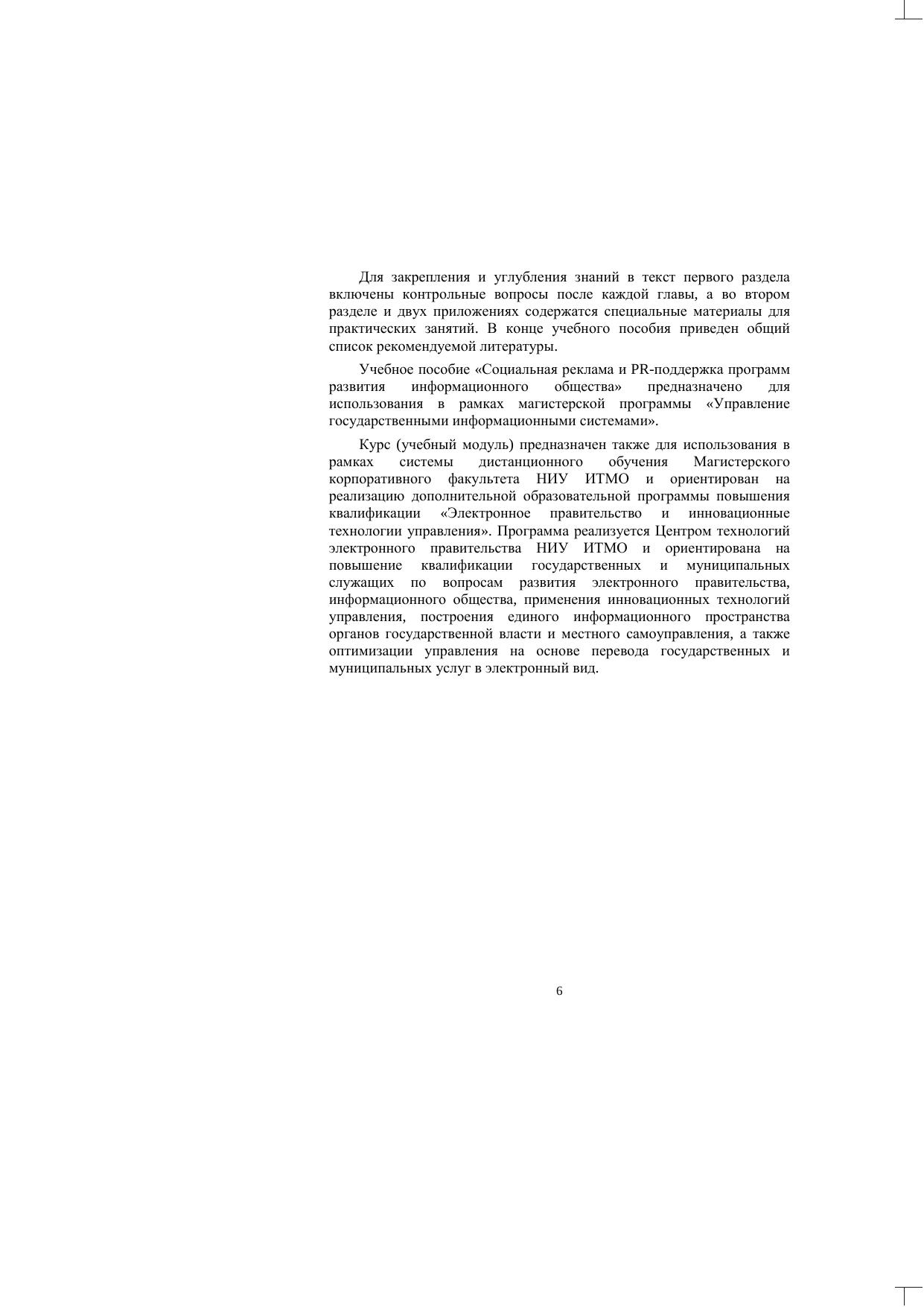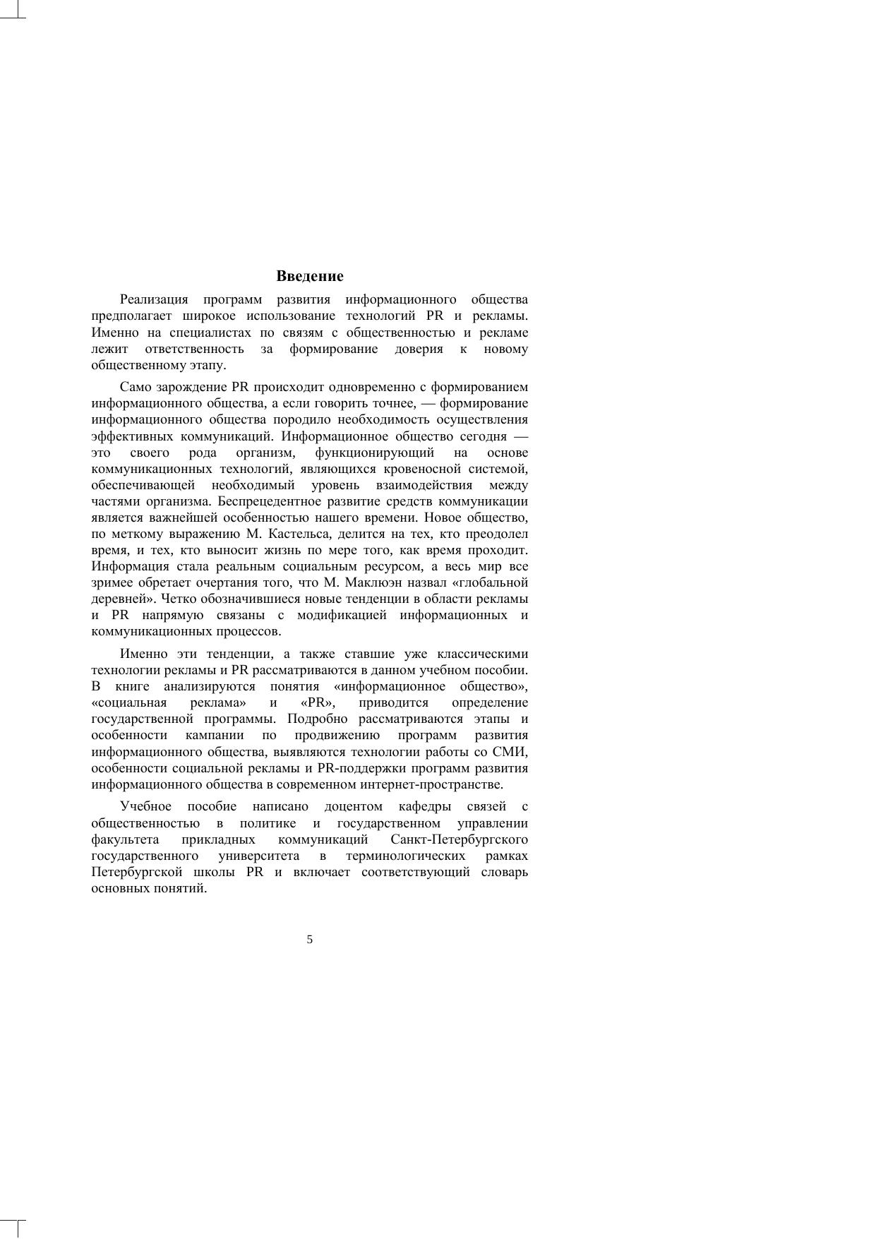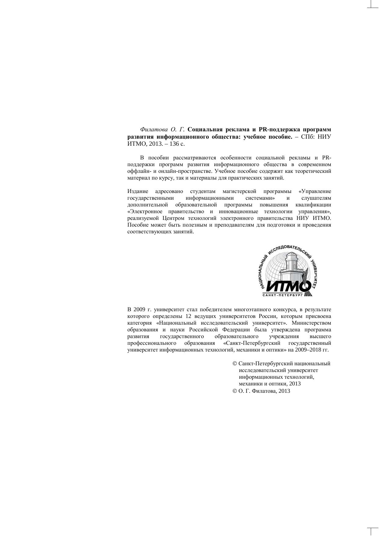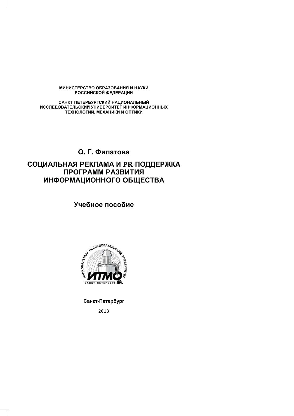 В пособии рассматриваются особенности социальной рекламы и PR-поддержки программ развития информационного общества в современном оффлайн- и онлайн-пространстве. Учебное пособие содержит как теоретический материал по курсу, так и материалы для практических занятий. Издание адресовано студентам магистерской программы "Управление государственными информационными системами" и слушателям дополнительной образовательной программы повышения квалификации "Электронное правительство и инновационные технологии управления", реализуемой Центром технологий электронного правительства НИУ ИТМО. Пособие может быть полезным и преподавателям для подготовки и проведения соответствующих занятий.