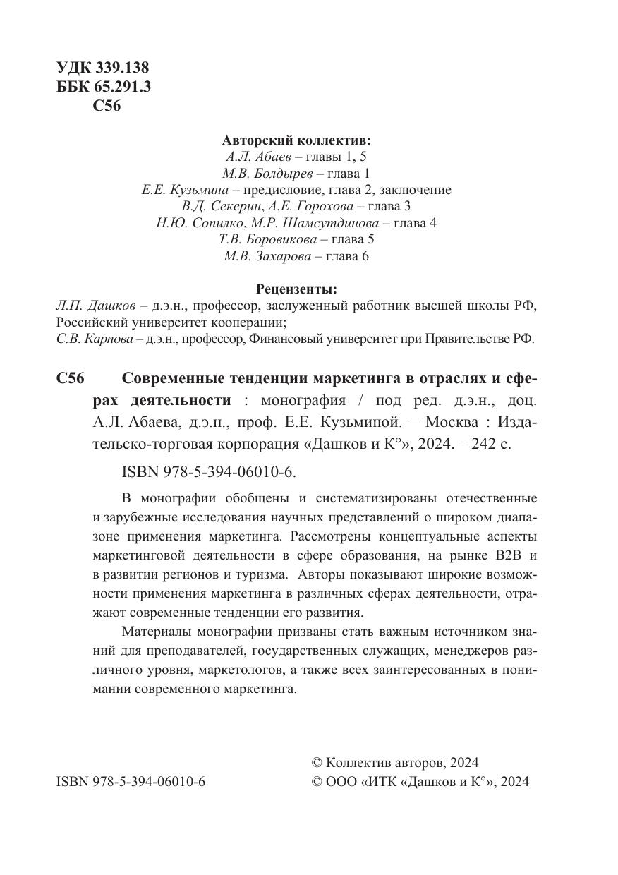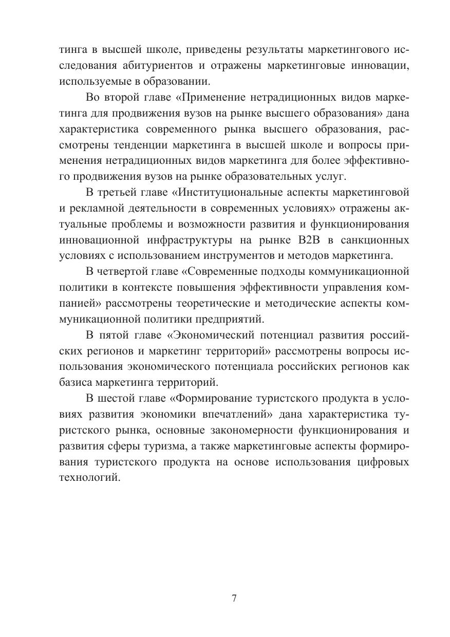 В монографии обобщены и систематизированы отечественные и зарубежные исследования научных представлений о широком диапазоне применения маркетинга. Рассмотрены концептуальные аспекты маркетинговой деятельности в сфере образования, на рынке B2B и в развитии регионов и туризма. Авторы показывают широкие возможности применения маркетинга в различных сферах деятельности, отражают современные тенденции его развития.