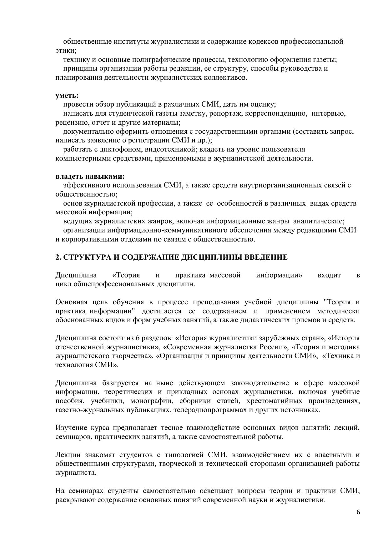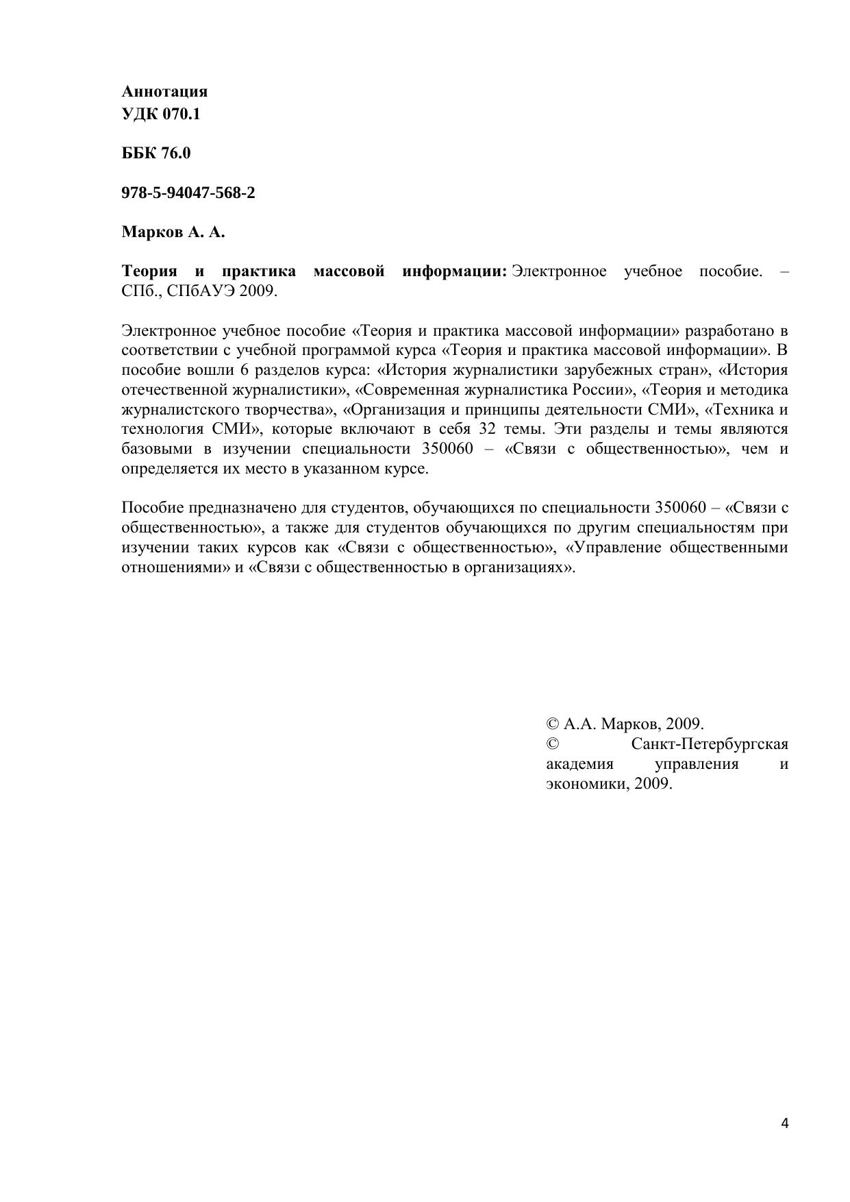 Электронное учебное пособие «Теория и практика массовой информации» разработано в соответствии с учебной программой курса «Теория и практика массовой информации». В пособие вошли 6 разделов курса: «История журналистики зарубежных стран», «История отечественной журналистики», «Современная журналистика России», «Теория и методика журналистского творчества», «Организация и принципы деятельности СМИ», «Техника и технология СМИ», которые включают в себя 32 темы. Эти разделы и темы являются базовыми в изучении специальности 350060 – «Связи с общественностью», чем и определяется их место в указанном курсе. Пособие предназначено для студентов, обучающихся по специальности 350060 – «Связи с общественностью», а также для студентов, обучающихся по другим специальностям при изучении таких курсов как «Связи с общественностью», «Управление общественными отношениями» и «Связи с общественностью в организациях». Электронное учебное пособие для дистанционного обучения