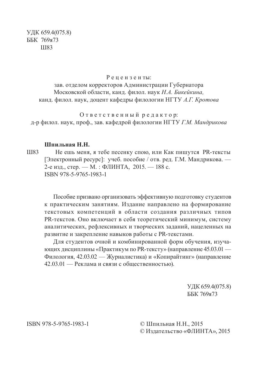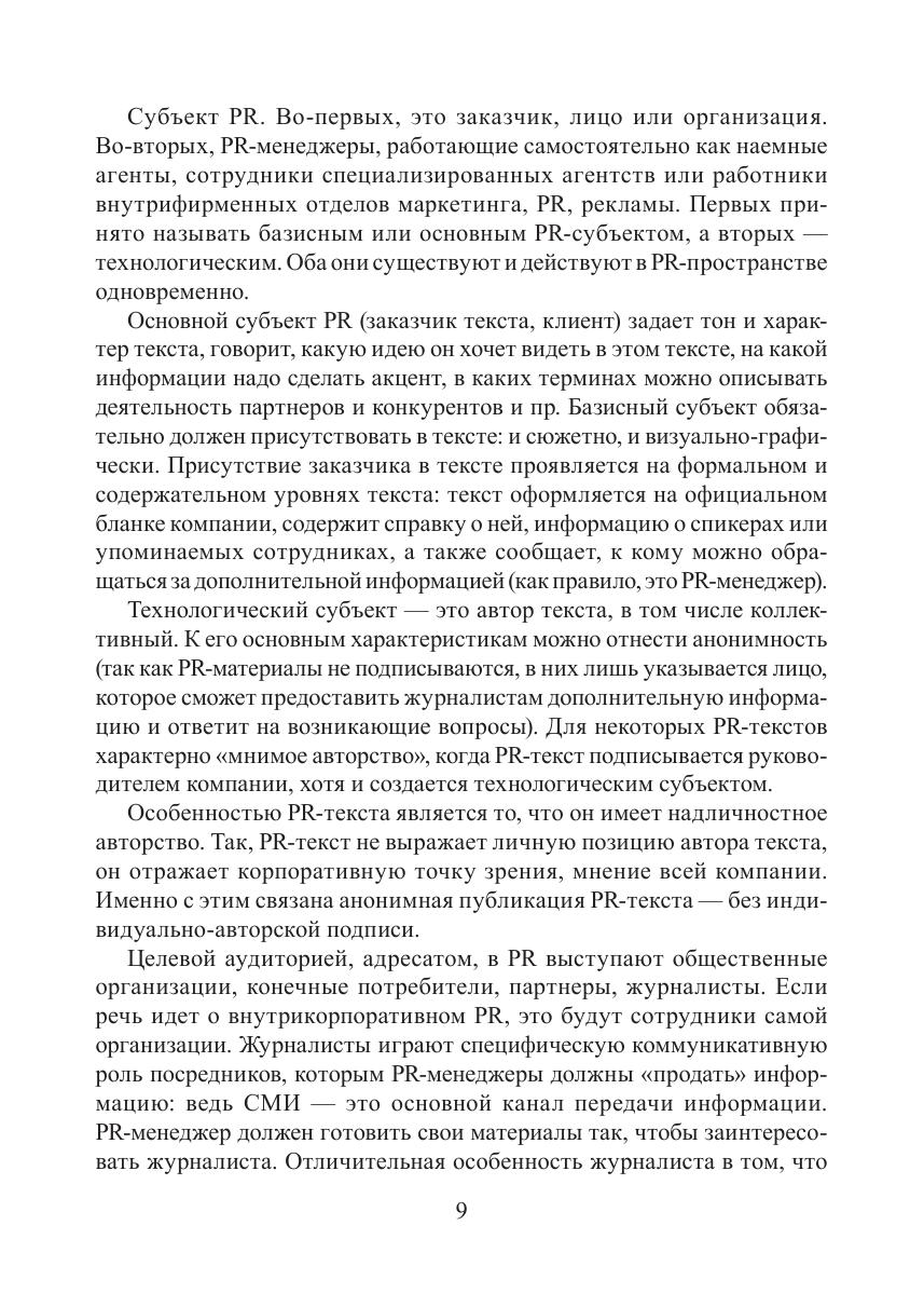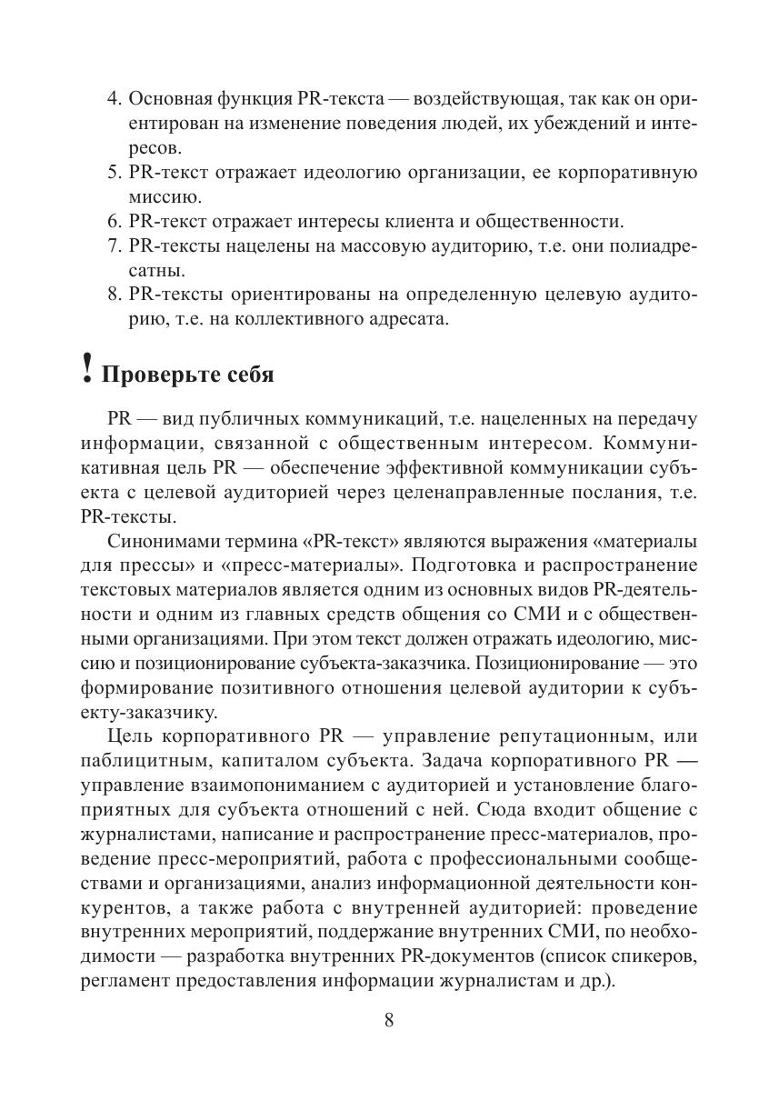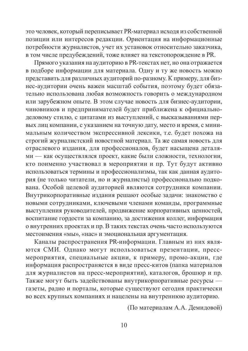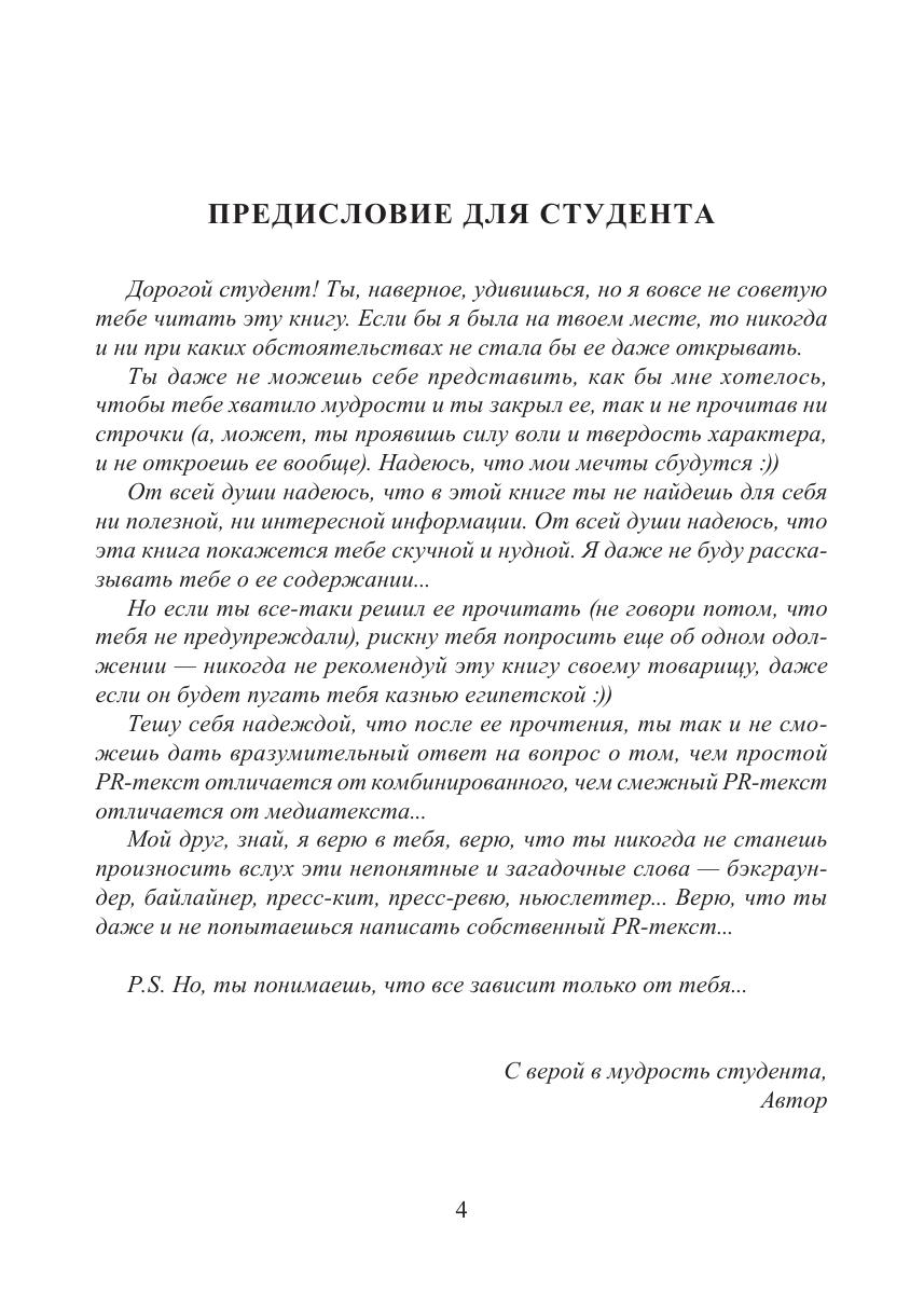 Пособие призвано организовать эффективную подготовку студентов к практическим занятиям. Издание направлено на формирование текстовых компетенций в области создания различных типов PR-текстов. Оно включает в себя теоретический минимум, систему аналитических, рефлексивных и творческих заданий, нацеленных на развитие и закрепление навыков работы с PR-текстами. Для студентов очной и комбинированной форм обучения, изучающих дисциплины «Практикум по PR-тексту» (направление 45.03.01 — Филология, 42.03.02 — Журналистика) и «Копирайтинг» (направление 42.03.01 — Реклама и связи с общественностью).