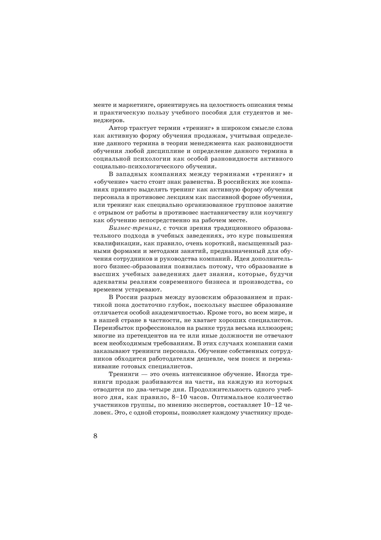 Учебное пособие представляет собой руководство по тренингу продаж. Автором анализируются универсальные принципы корпоративного обучения, разработанные в мировой практике бизнеса, исследуются примеры и проблемы отечественной практики обучения продажам описываются последовательные шаги по организации системного и эффективного обучения продажам персонала фирмы, перечень форм и методов обучения продажам, разбираются концепции построения тренинга и сценарии тренинга продаж для организации. В книге широко представлены игры, упражнения, богатый информационный материал, используемый современными тренерами как на открытых сборных тренингах, так и во время корпоративного обучения продажам. Для студентов и слушателей специальности «Управление персоналом», менеджеров по персоналу, тренеров и преподавателей.