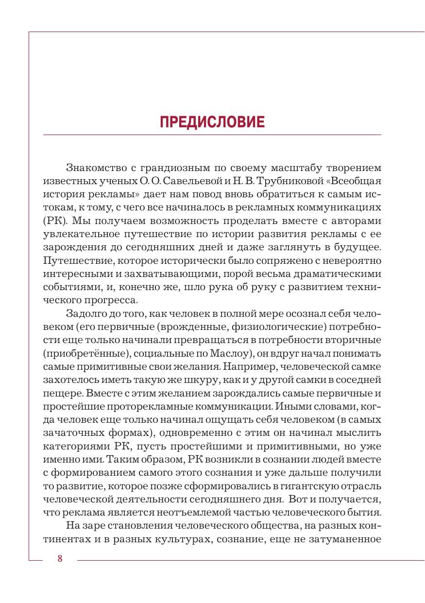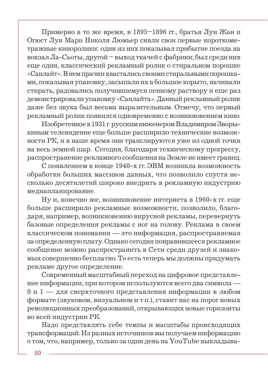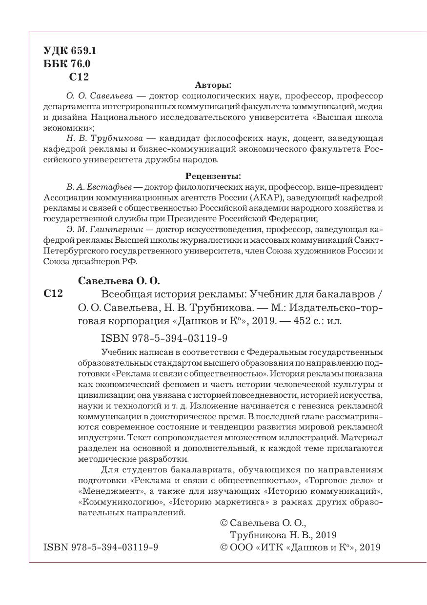 Учебник написан в соответствии с Федеральным государственным образовательным стандартом высшего образования по направлению подготовки «Реклама и связи с общественностью». История рекламы показана как экономический феномен и часть истории человеческой культуры и цивилизации; она увязана с историей повседневности, историей искусства, науки и технологий и т. д. Изложение начинается с генезиса рекламной коммуникации в доисторическое время. В последней главе рассматриваются современное состояние и тенденции развития мировой рекламной индустрии. Текст сопровождается множеством иллюстраций. Материал разделен на основной и дополнительный, к каждой теме прилагаются методические разработки. Для студентов бакалавриата, обучающихся по направлениям подготовки «Реклама и связи с общественностью», «Торговое дело» и «Менеджмент», а также для изучающих «Историю коммуникаций», «Коммуникологию», «Историю маркетинга» в рамках других образовательных направлений.