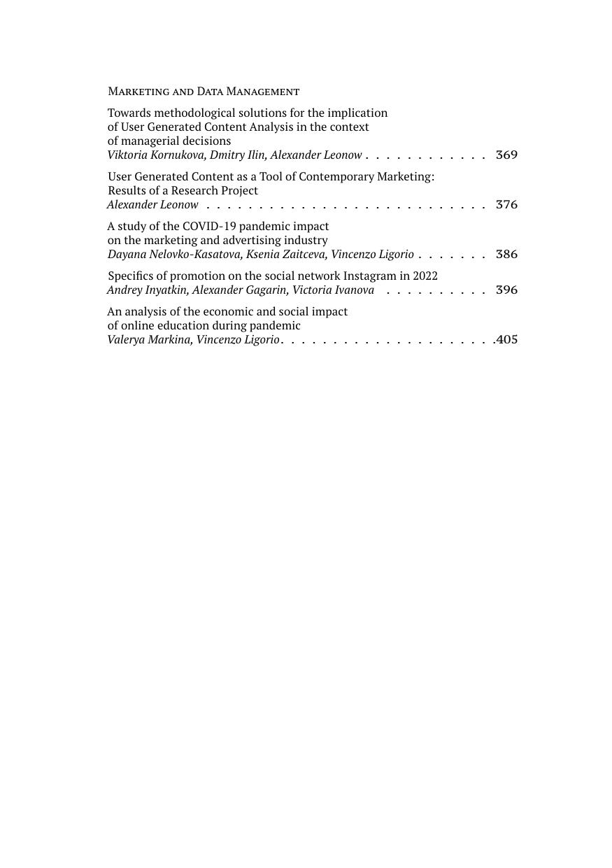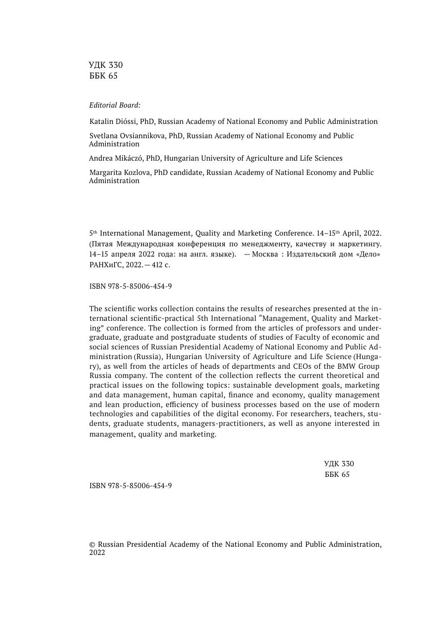graduate and postgraduate students of studies of Faculty of economic and social sciences of Russian Presidential Academy of National Economy and Public Administration (Russia), Hungarian University of Agriculture and Life Science (Hungary), as well from the articles of heads of departments and CEOs of the BMW Group Russia company. The content of the collection reflects the current theoretical and practical issues on the following topics: sustainable development goals, marketing and data management, human capital, finance and economy, quality management and lean production, efficiency of business processes based on the use of modern technologies and capabilities of the digital economy. For researchers, teachers, students, graduate students, managers-practitioners, as well as anyone interested in management, quality and marketing.