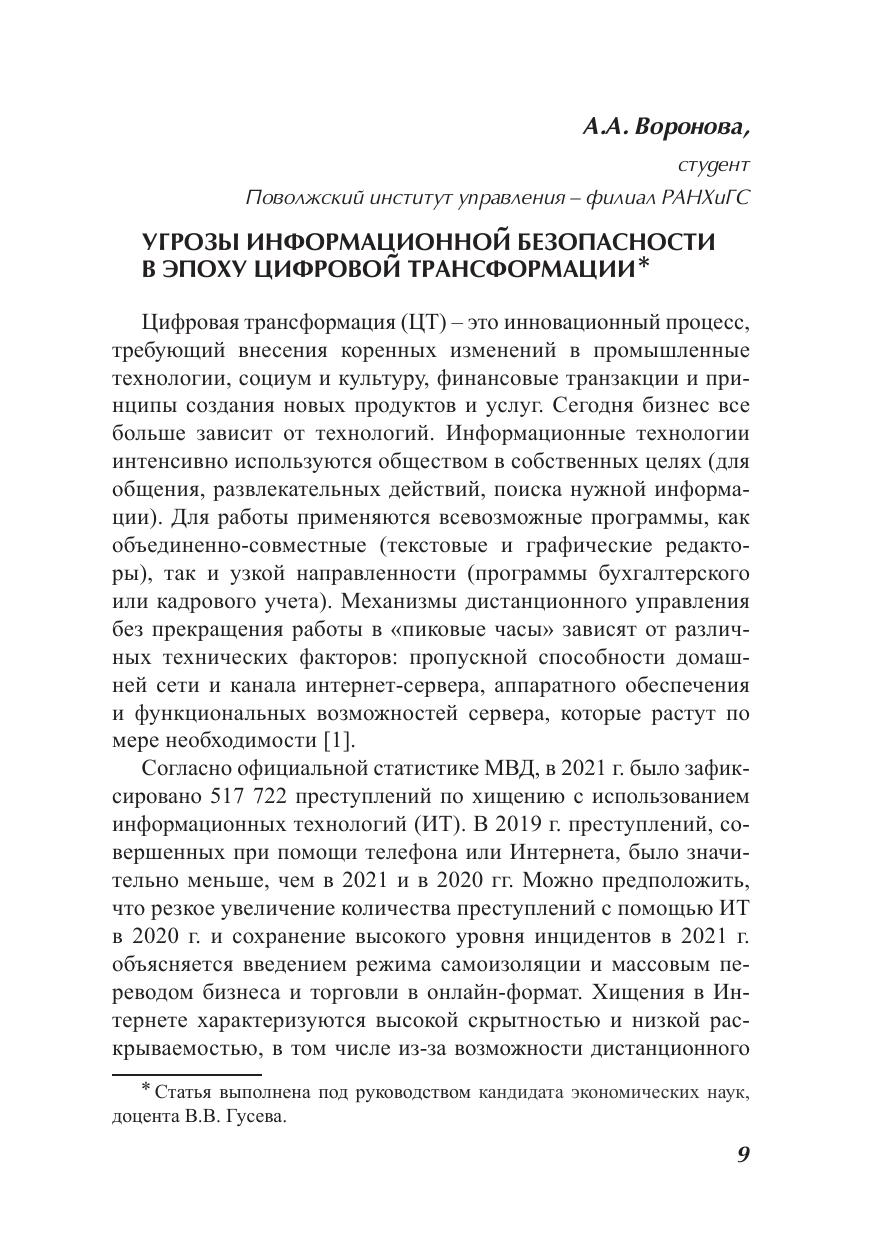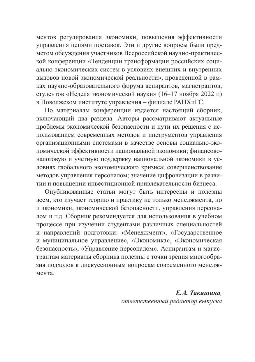 Сборник содержит статьи по материалам Всероссийской научно-практической конференции «Тенденции трансформации российских социально-экономических систем в условиях внешних и внутренних вызовов новой экономической реальности», проведенной в рамках научно-образовательного форума аспирантов, магистрантов, студентов «Неделя экономической науки» (16–17 ноября 2022 г.) в Поволжском институте управления – филиале РАНХиГС. Авторы рассматривают актуальные проблемы экономической безопасности и пути их решения с использованием современных методов и инструментов управления организационными системами в качестве основы социально-экономической эффективности национальной экономики; финансово-налоговую и учетную поддержку национальной экономики в условиях глобального экономического кризиса; совершенствование методов управления персоналом; значение цифровизации в развитии и повышении инвестиционной привлекательности бизнеса. Для студентов, преподавателей вузов, экономистов и менеджеров организаций различных сфер деятельности, а также работников органов государственного управления и местного самоуправления.