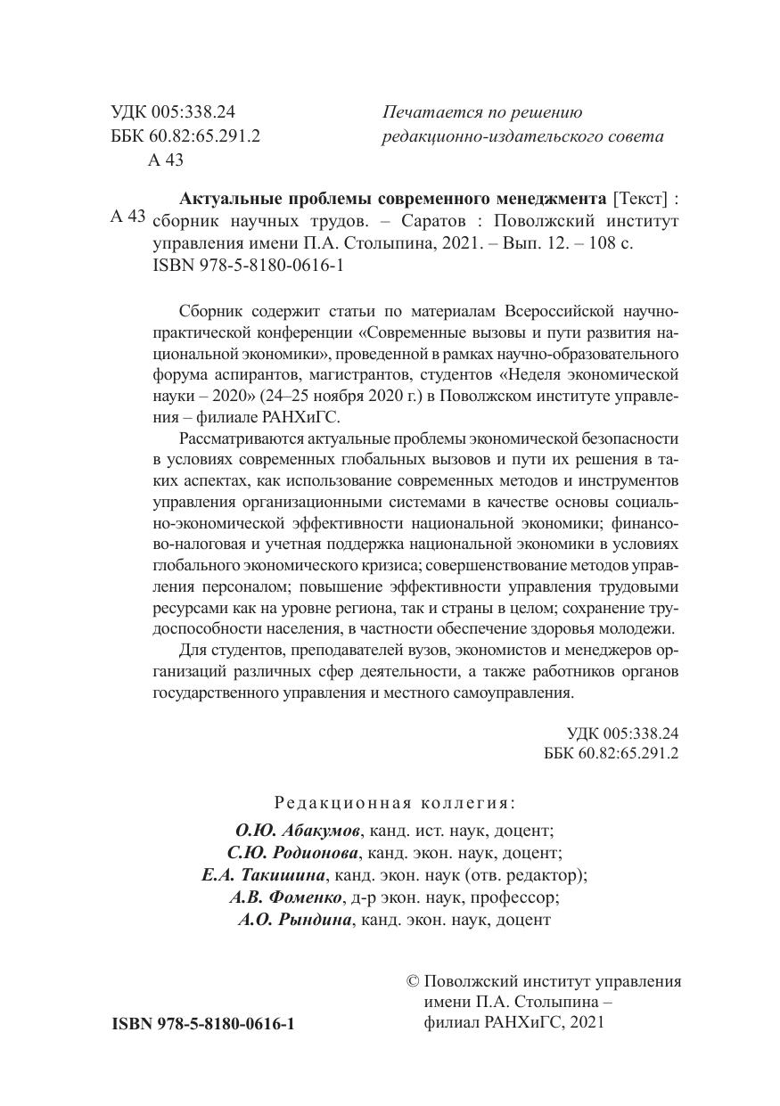 Актуальные проблемы современного менеджмента: сборник научных трудов. Вып. 12