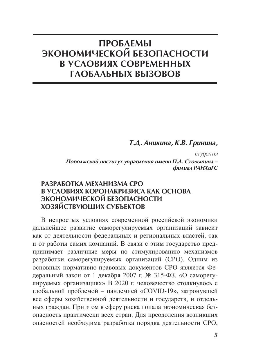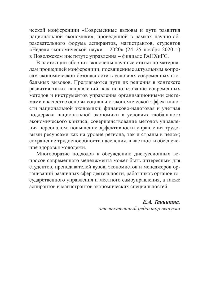 Сборник содержит статьи по материалам Всероссийской научнопрактической конференции «Современные вызовы и пути развития национальной экономики», проведенной в рамках научно-образовательного форума аспирантов, магистрантов, студентов «Неделя экономической науки – 2020» (24–25 ноября 2020 г.) в Поволжском институте управления – филиале РАНХиГС. Рассматриваются актуальные проблемы экономической безопасности в условиях современных глобальных вызовов и пути их решения в таких аспектах, как использование современных методов и инструментов управления организационными системами в качестве основы социально-экономической эффективности национальной экономики; финансово-налоговая и учетная поддержка национальной экономики в условиях глобального экономического кризиса; совершенствование методов управления персоналом; повышение эффективности управления трудовыми ресурсами как на уровне региона, так и страны в целом; сохранение трудоспособности населения, в частности обеспечение здоровья молодежи. Для студентов, преподавателей вузов, экономистов и менеджеров организаций различных сфер деятельности, а также работников органов государственного управления и местного самоуправления.