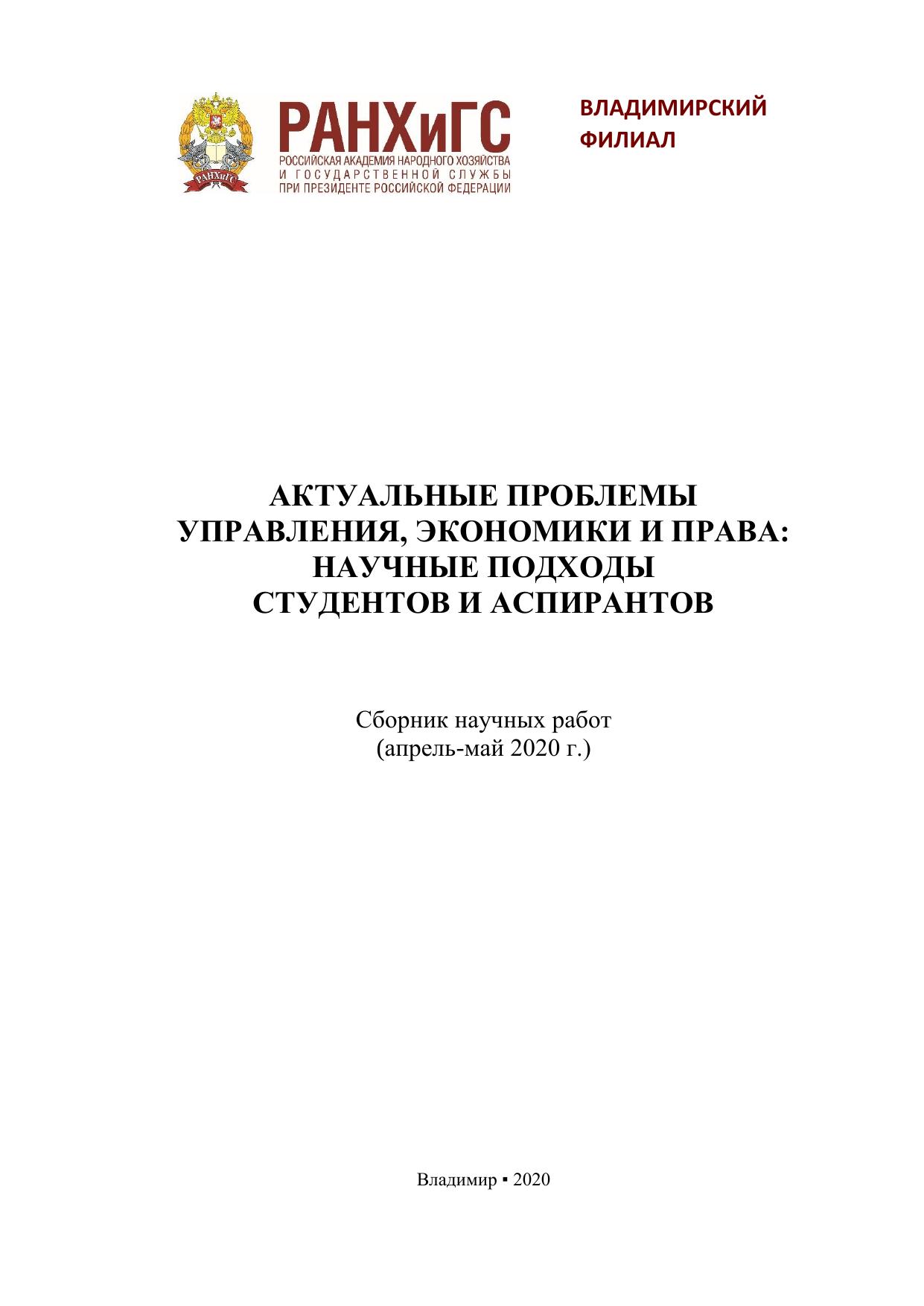 Актуальные проблемы управления, экономики и права: научные подходы студентов и аспирантов: сборник научных работ (апрель-май 2020 г.)