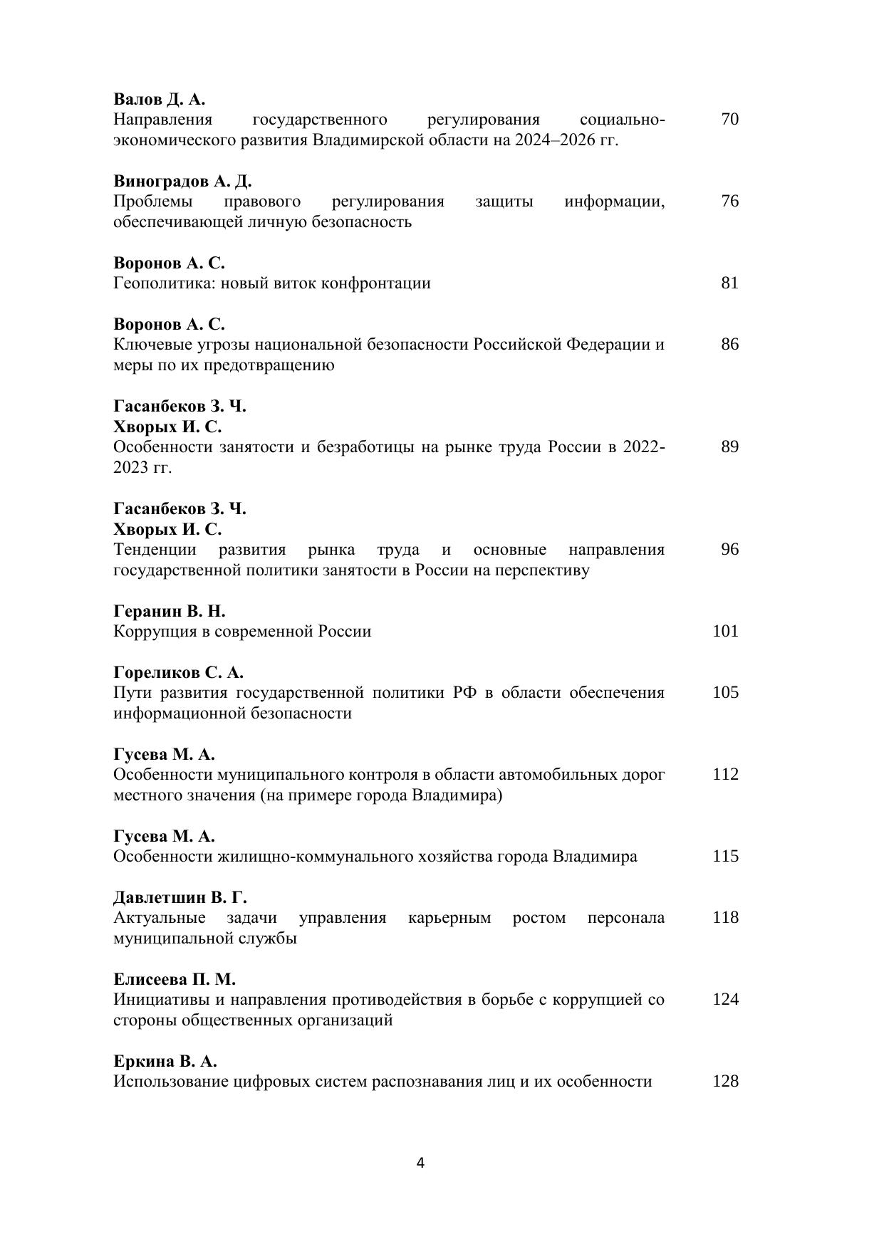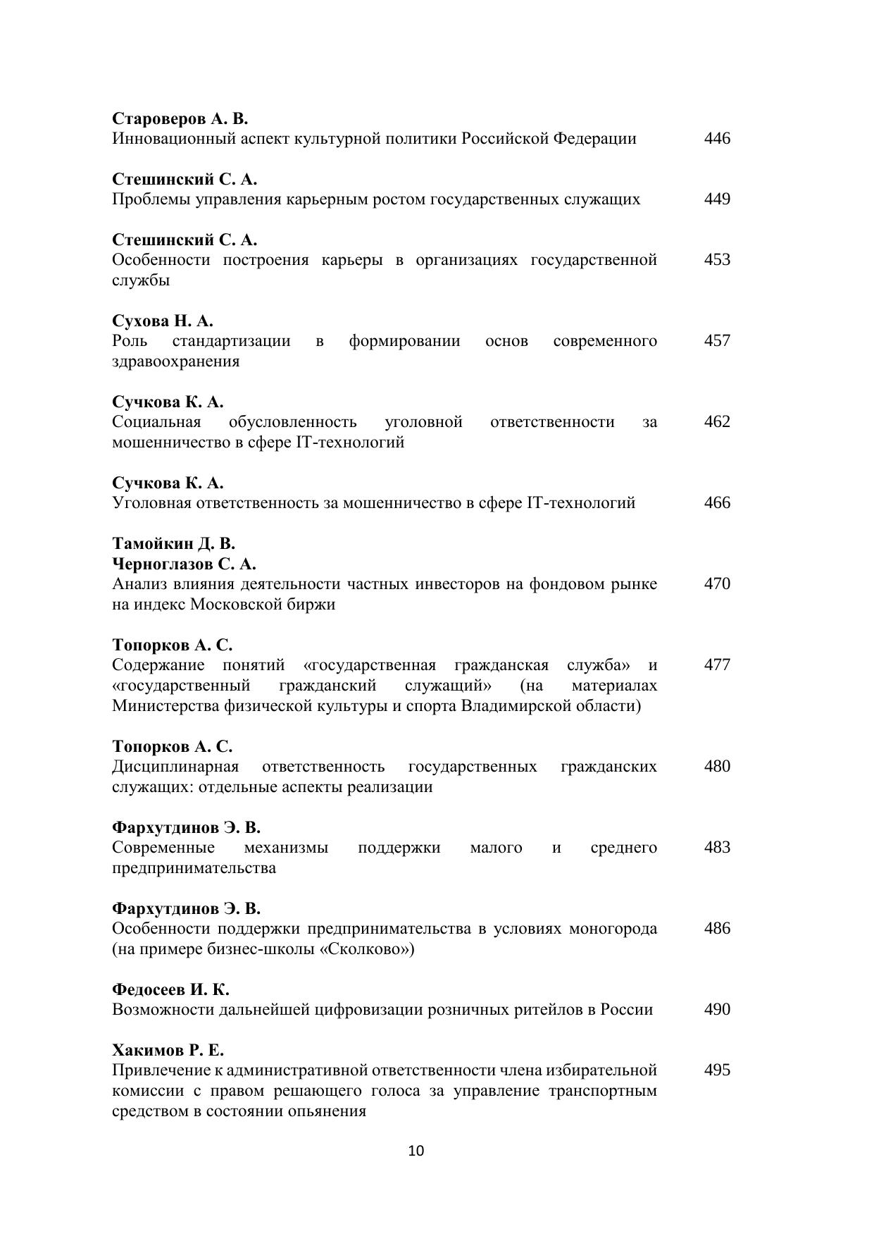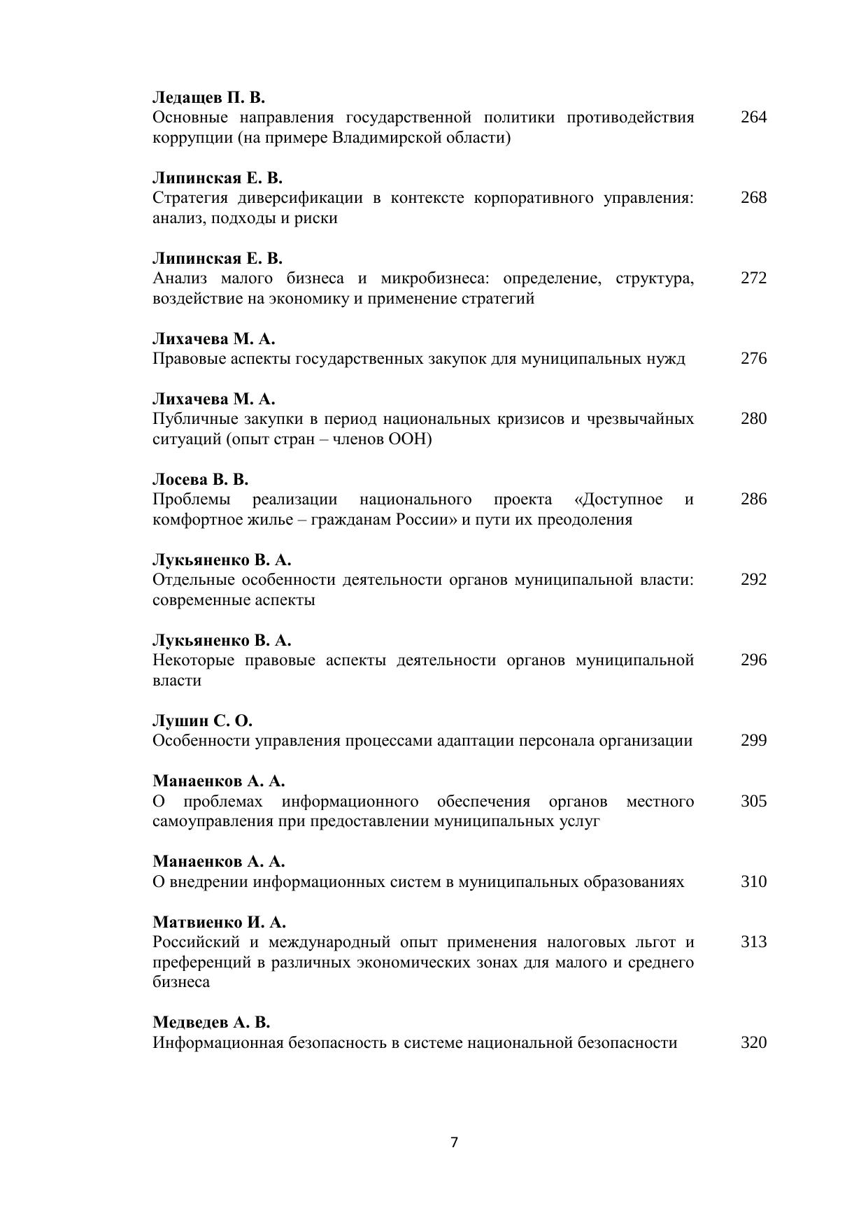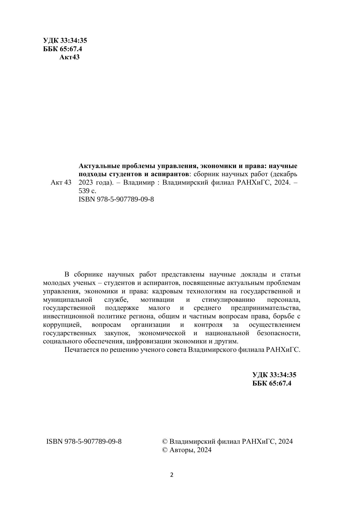 В сборнике научных работ представлены научные доклады и статьи молодых ученых – студентов и аспирантов, посвященные актуальным проблемам управления, экономики и права: кадровым технологиям на государственной и муниципальной службе, мотивации и стимулированию персонала, государственной поддержке малого и среднего предпринимательства, инвестиционной политике региона, общим и частным вопросам права, борьбе с коррупцией, вопросам организации и контроля за осуществлением государственных закупок, экономической и национальной безопасности, социального обеспечения, цифровизации экономики и другим. Печатается по решению ученого совета Владимирского филиала РАНХиГС.