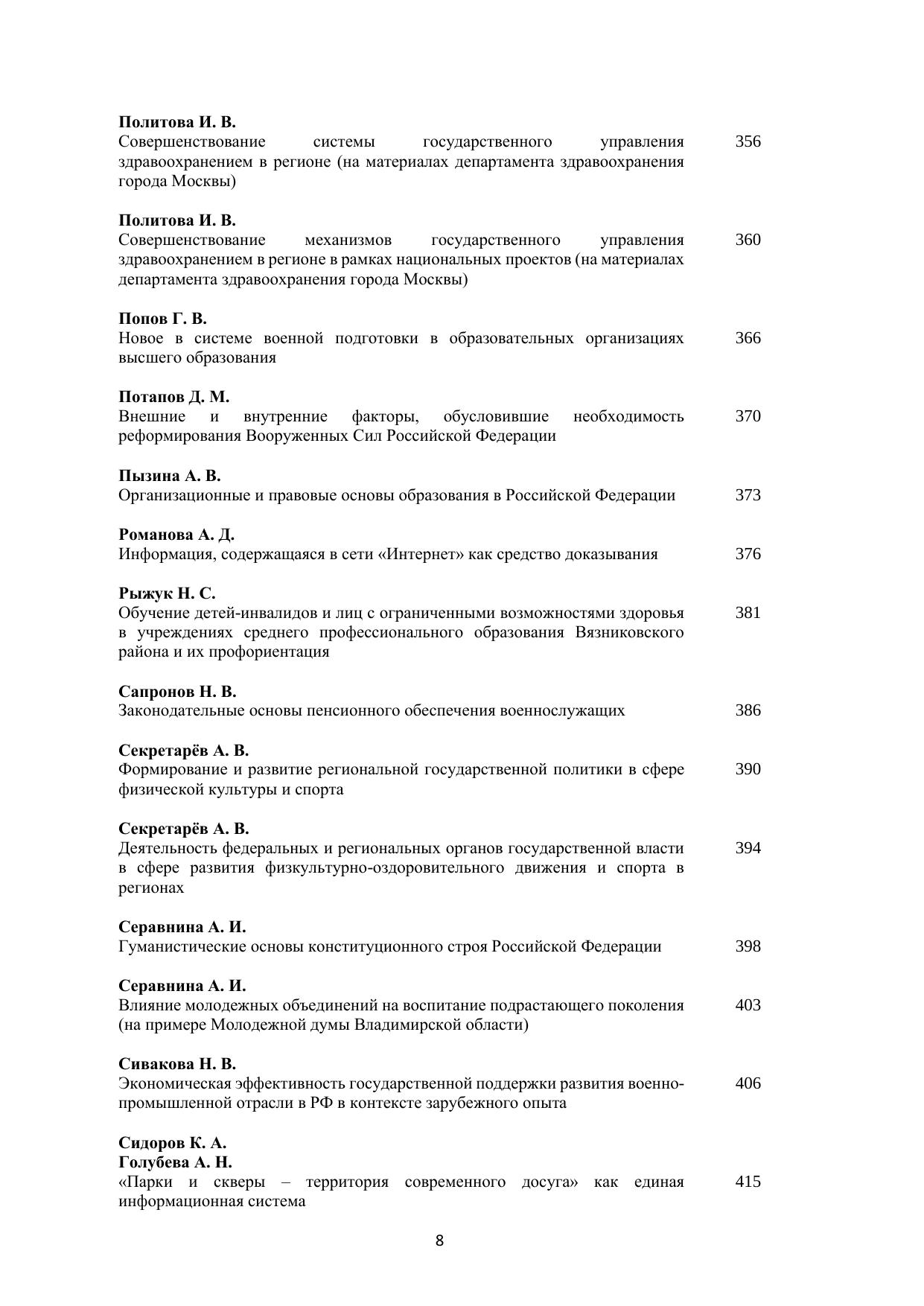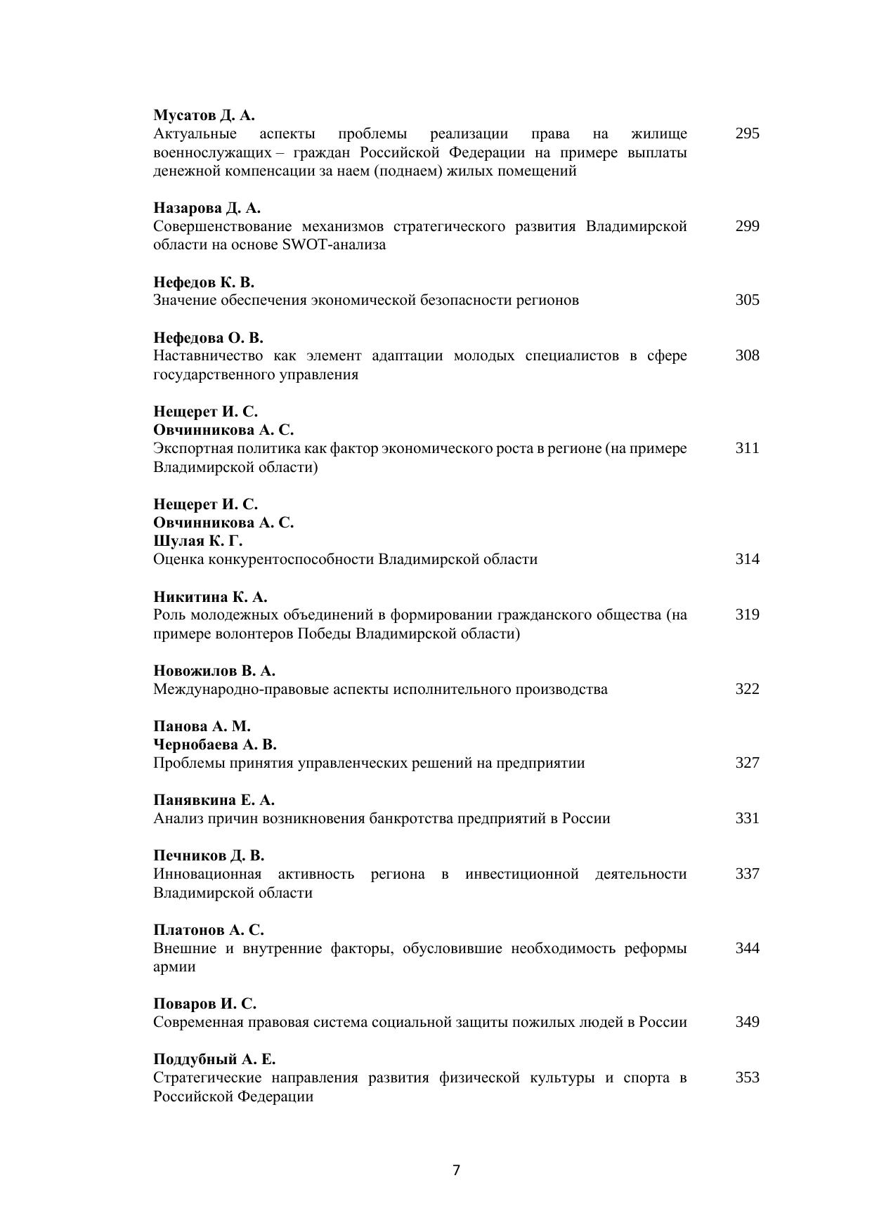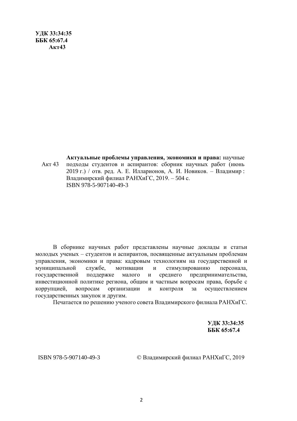 В сборнике научных работ представлены научные доклады и статьи молодых ученых – студентов и аспирантов, посвященные актуальным проблемам управления, экономики и права: кадровым технологиям на государственной и муниципальной службе, мотивации и стимулированию персонала, государственной поддержке малого и среднего предпринимательства, инвестиционной политике региона, общим и частным вопросам права, борьбе с коррупцией, вопросам организации и контроля за осуществлением государственных закупок и другим. Печатается по решению ученого совета Владимирского филиала РАНХиГС