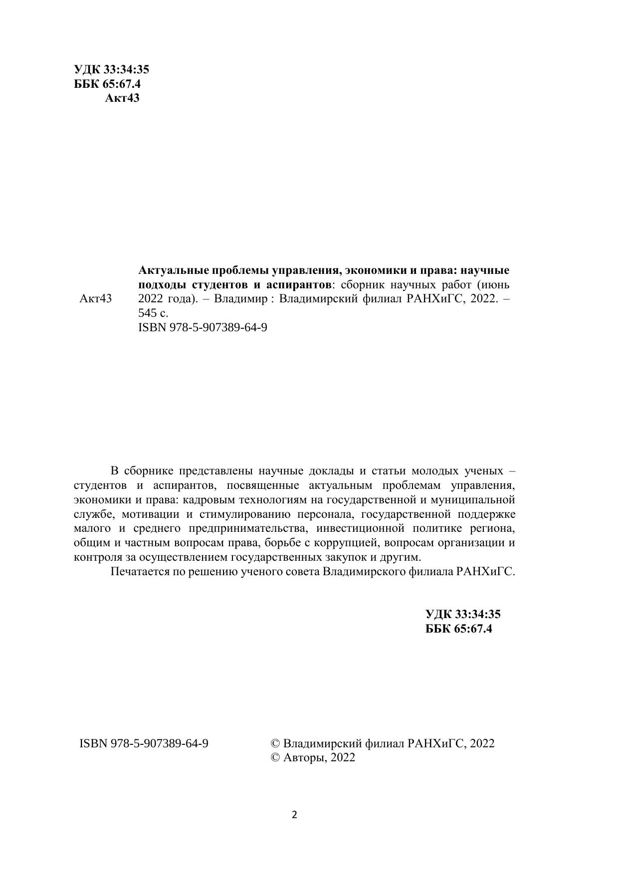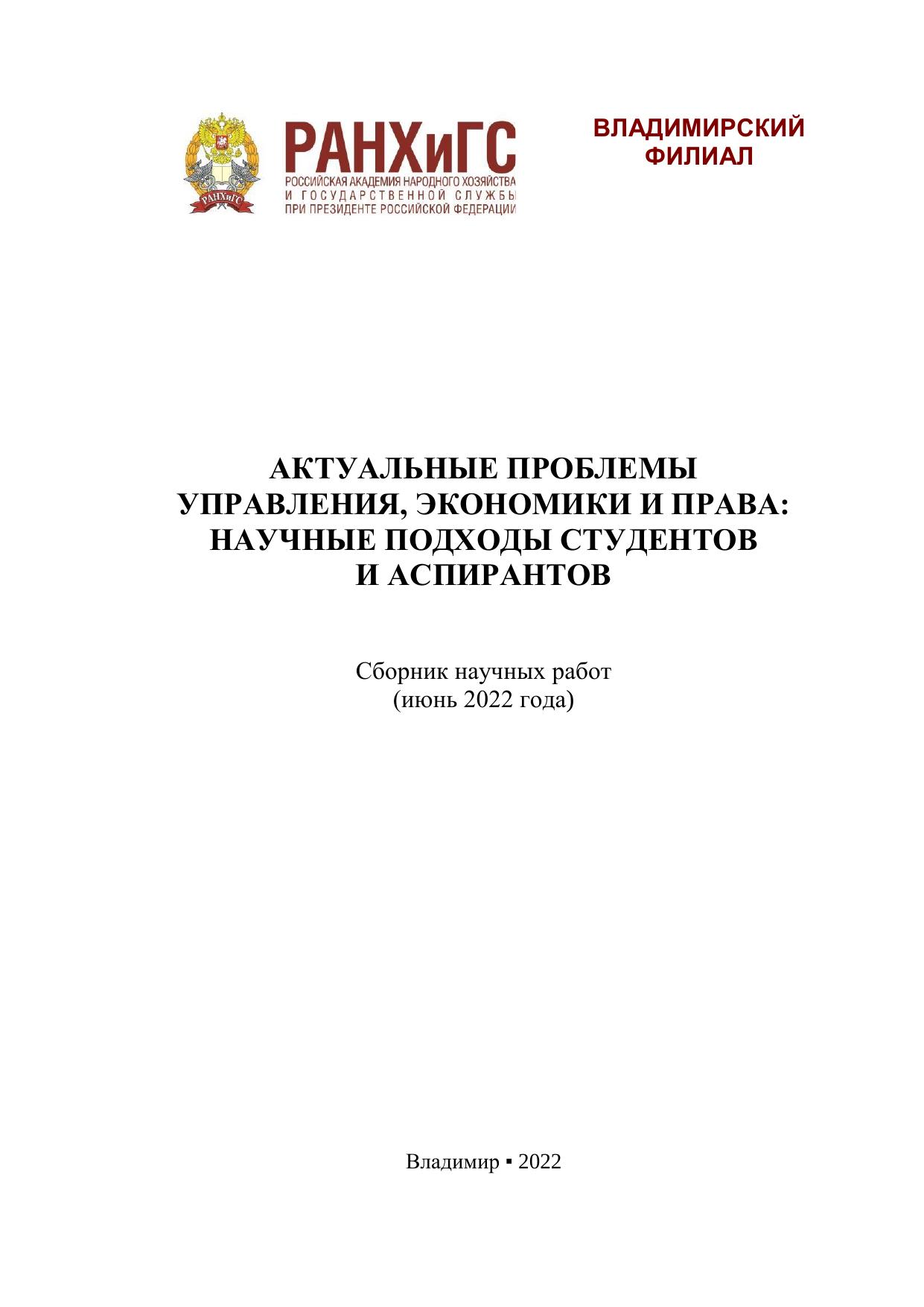 Актуальные проблемы управления, экономики и права: научные подходы студентов и аспирантов: сборник научных работ (июнь 2022 года)