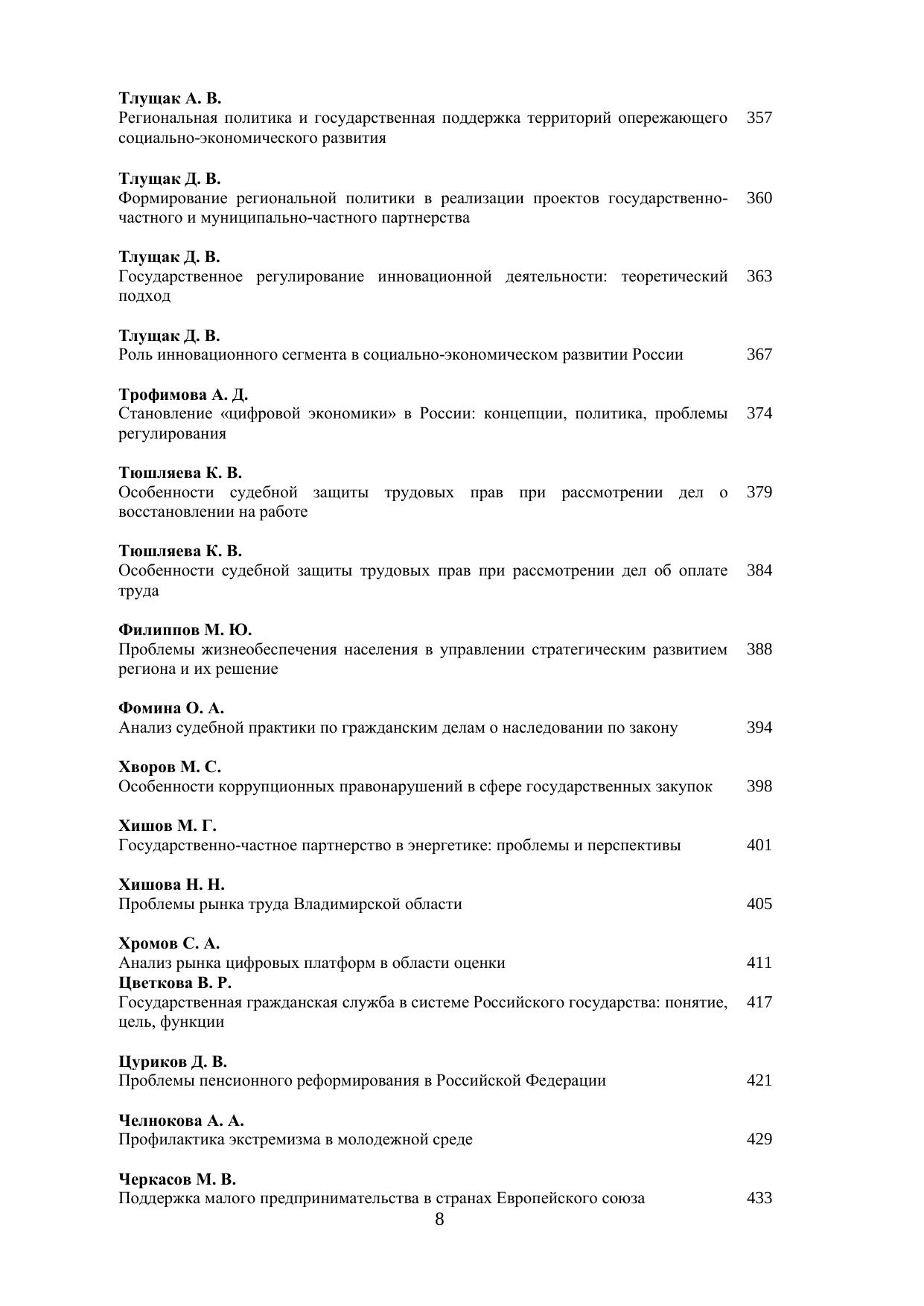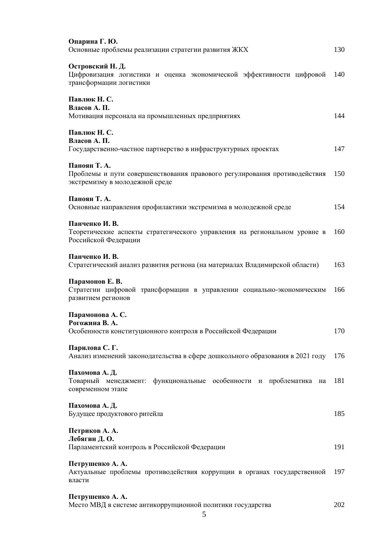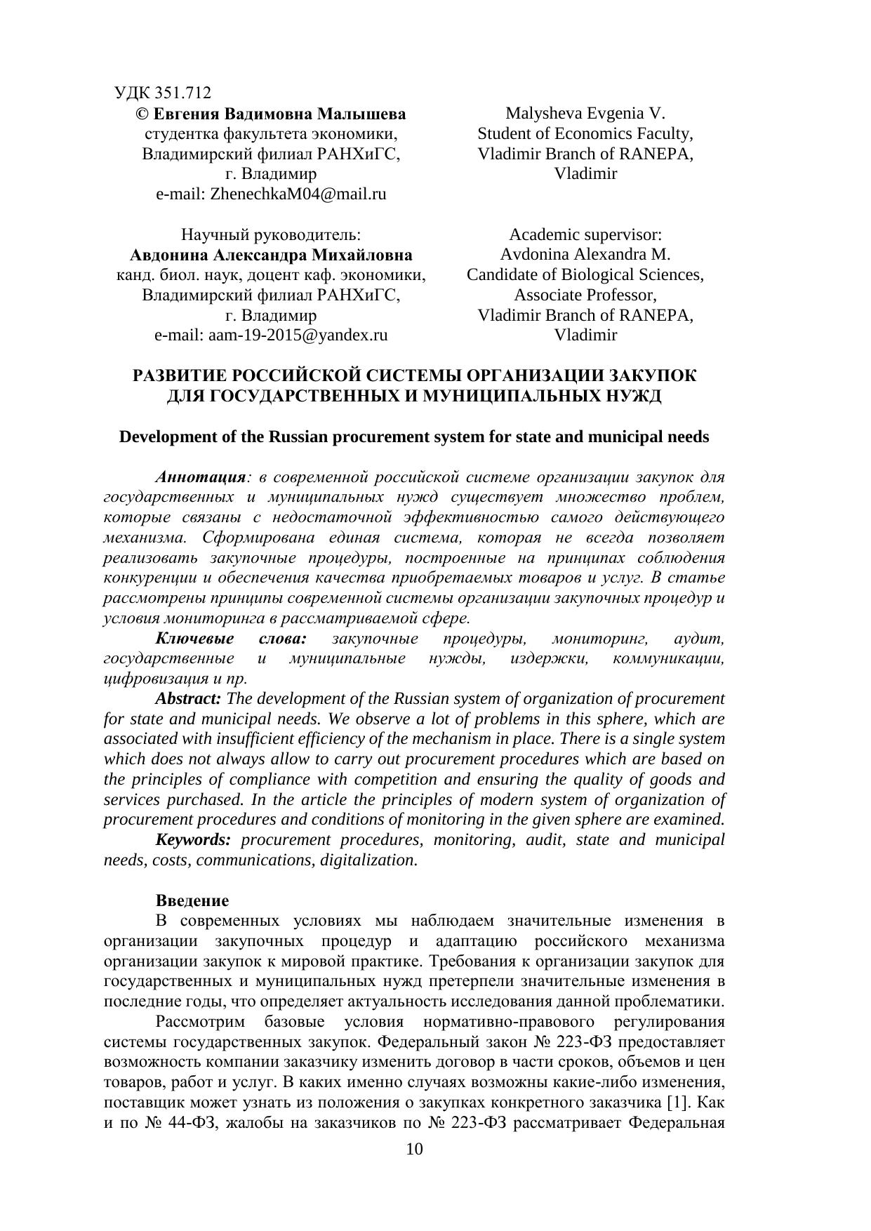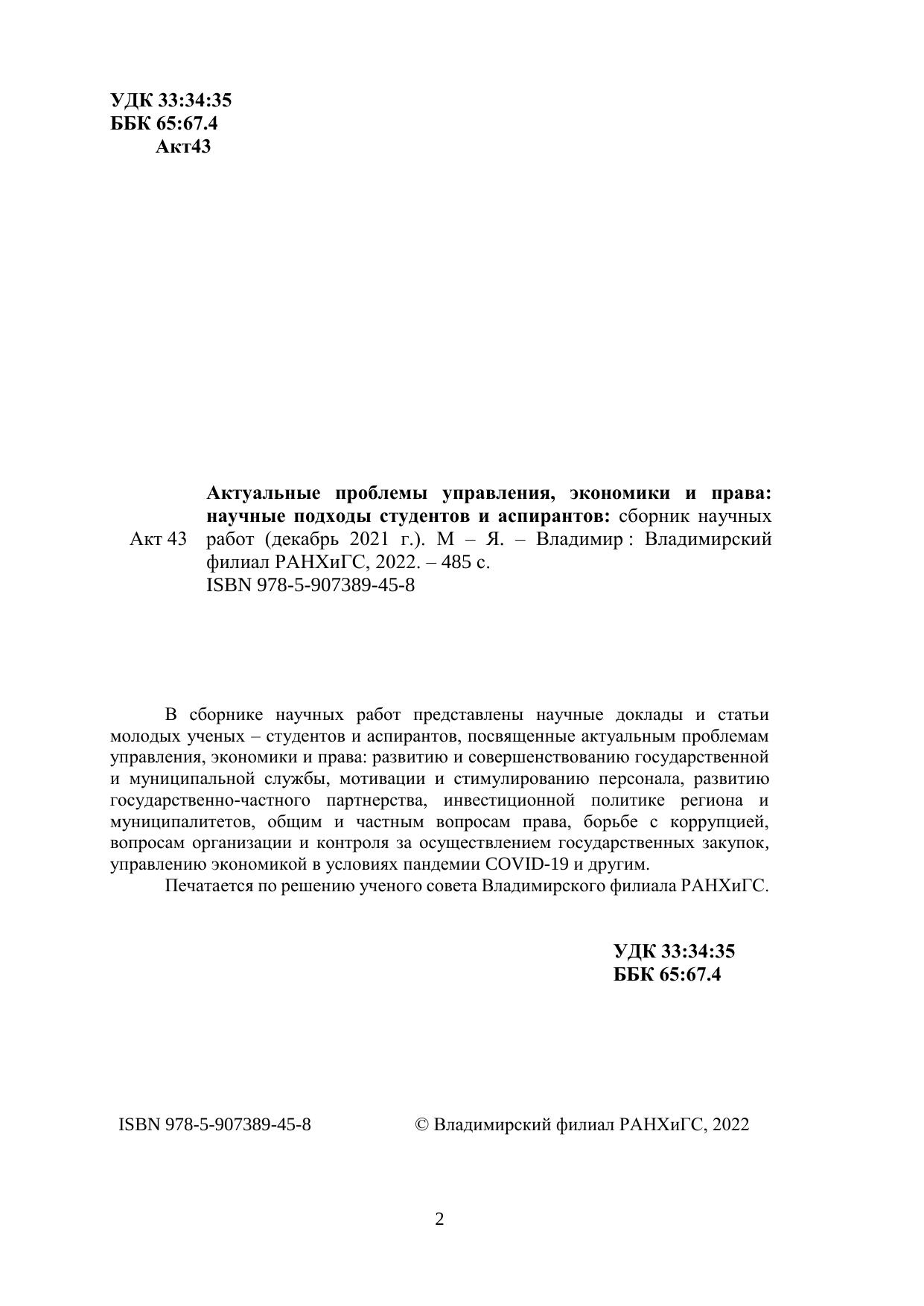 В сборнике научных работ представлены научные доклады и статьи молодых ученых – студентов и аспирантов, посвященные актуальным проблемам управления, экономики и права: развитию и совершенствованию государственной и муниципальной службы, мотивации и стимулированию персонала, развитию государственно-частного партнерства, инвестиционной политике региона и муниципалитетов, общим и частным вопросам права, борьбе с коррупцией, вопросам организации и контроля за осуществлением государственных закупок, управлению экономикой в условиях пандемии COVID-19 и другим. Печатается по решению ученого совета Владимирского филиала РАНХиГС.