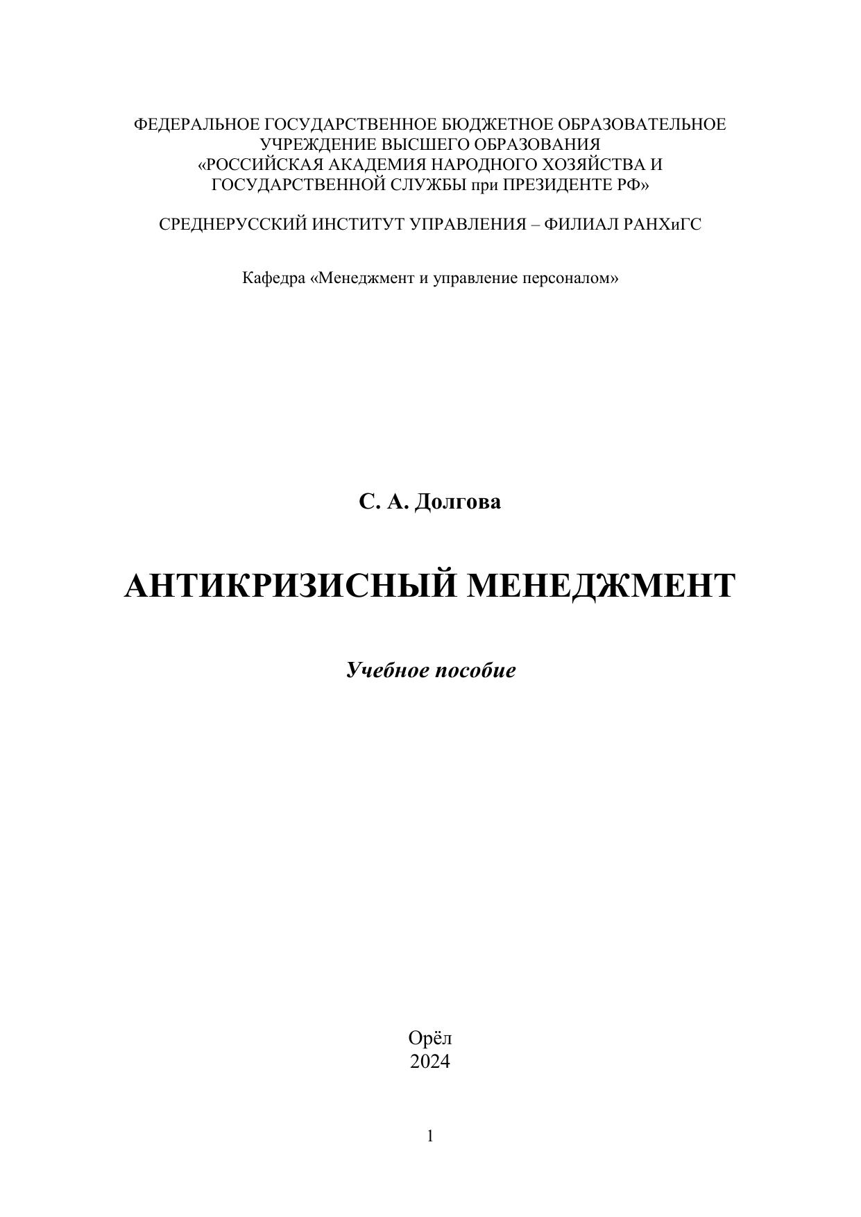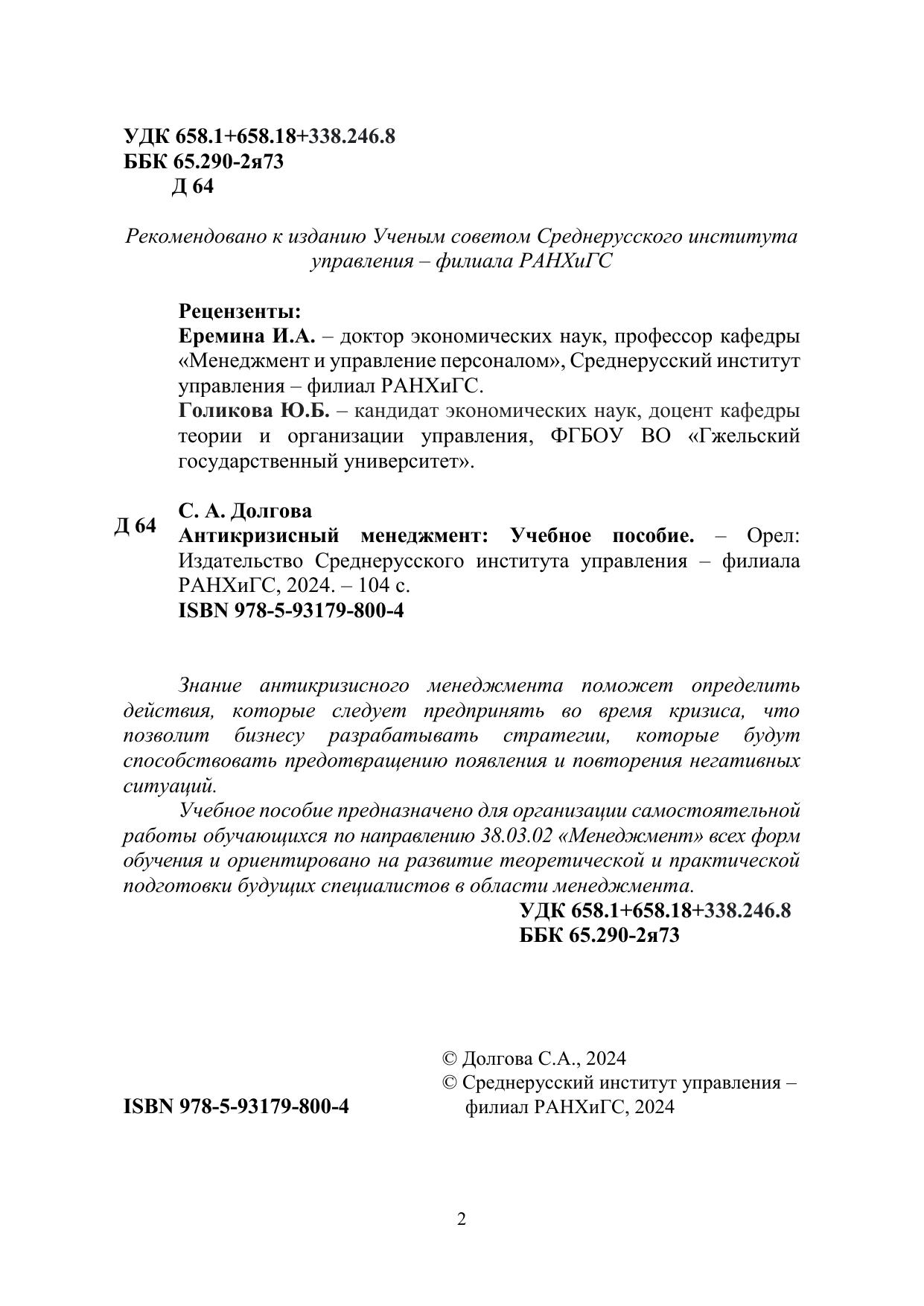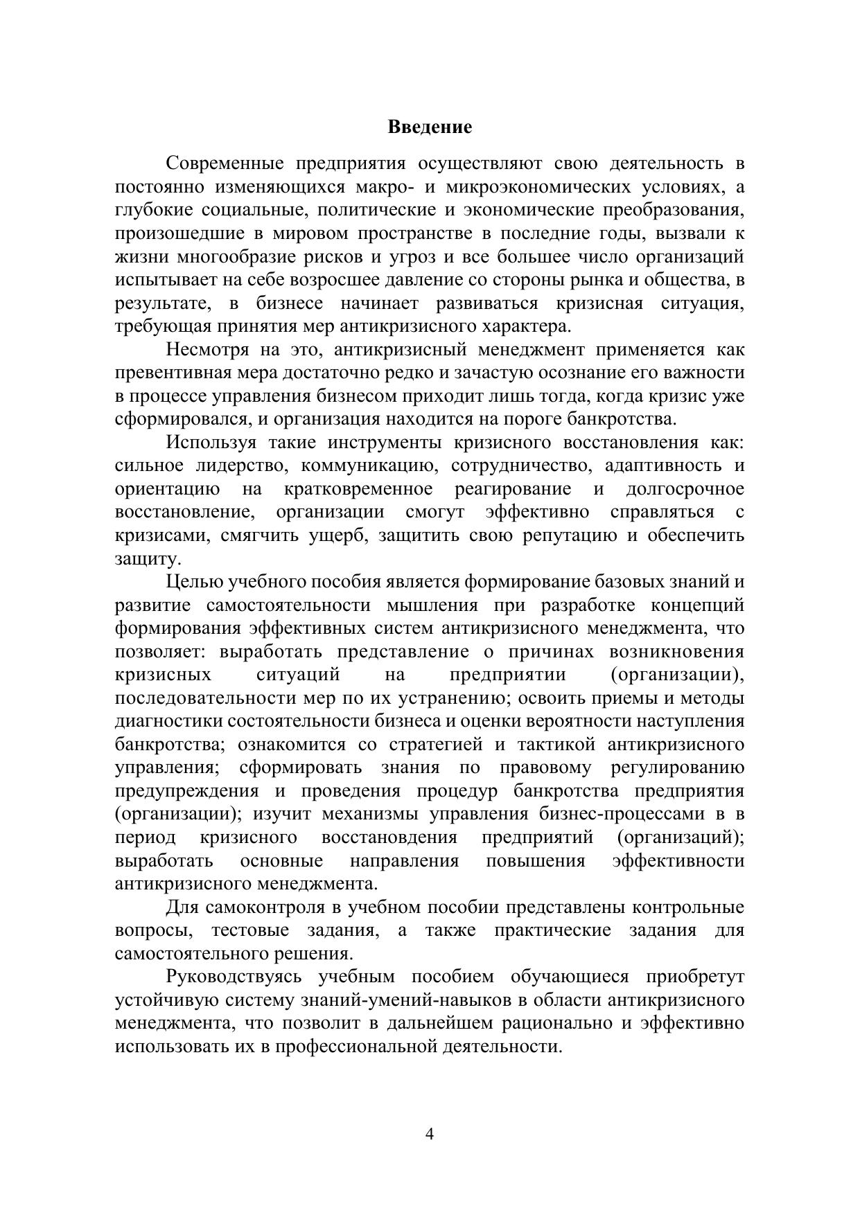 Знание антикризисного менеджмента поможет определить действия, которые следует предпринять во время кризиса, что позволит бизнесу разрабатывать стратегии, которые будут способствовать предотвращению появления и повторения негативных ситуаций. Учебное пособие предназначено для организации самостоятельной работы обучающихся по направлению 38.03.02 «Менеджмент» всех форм обучения и ориентировано на развитие теоретической и практической подготовки будущих специалистов в области менеджмента.