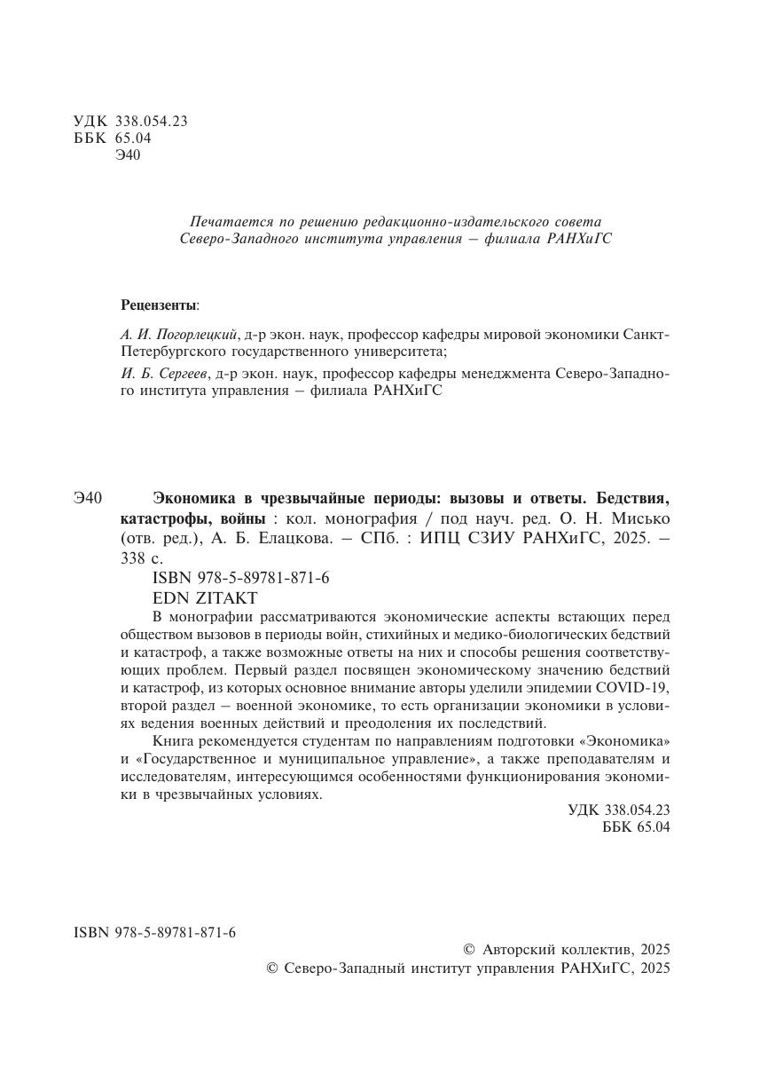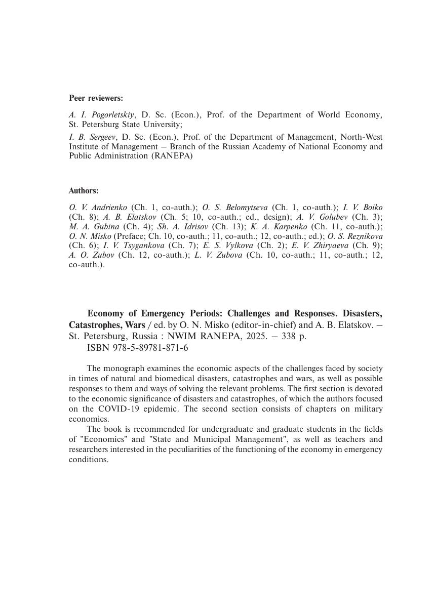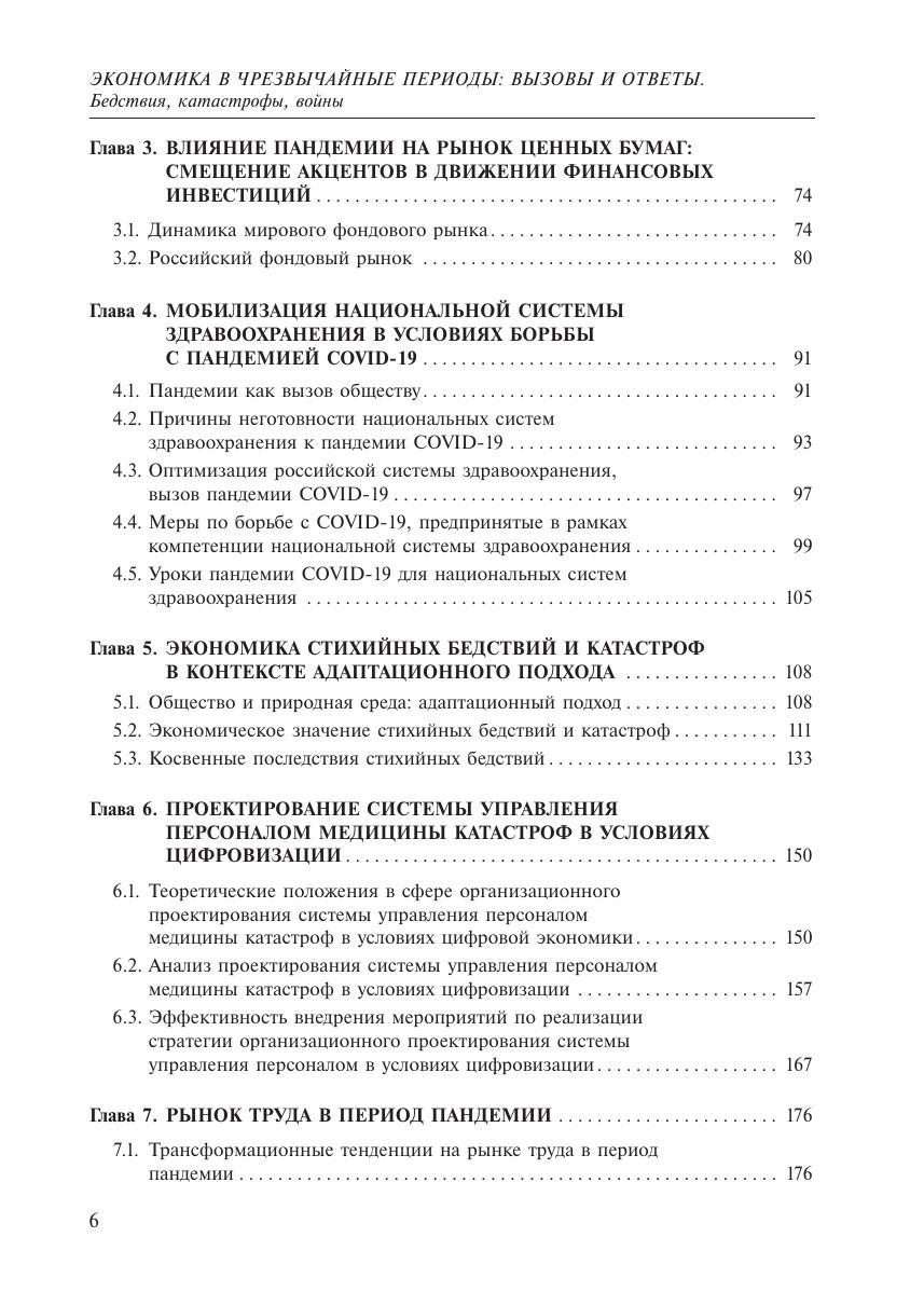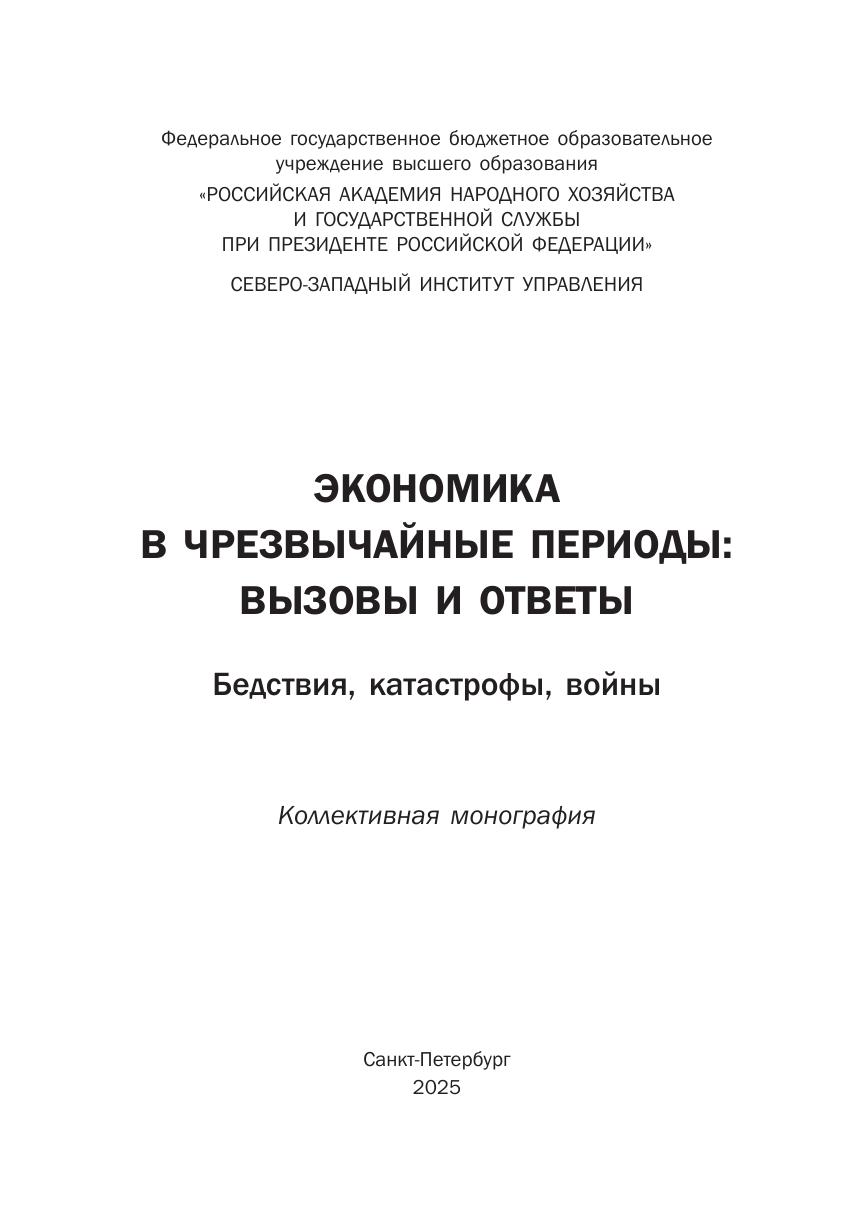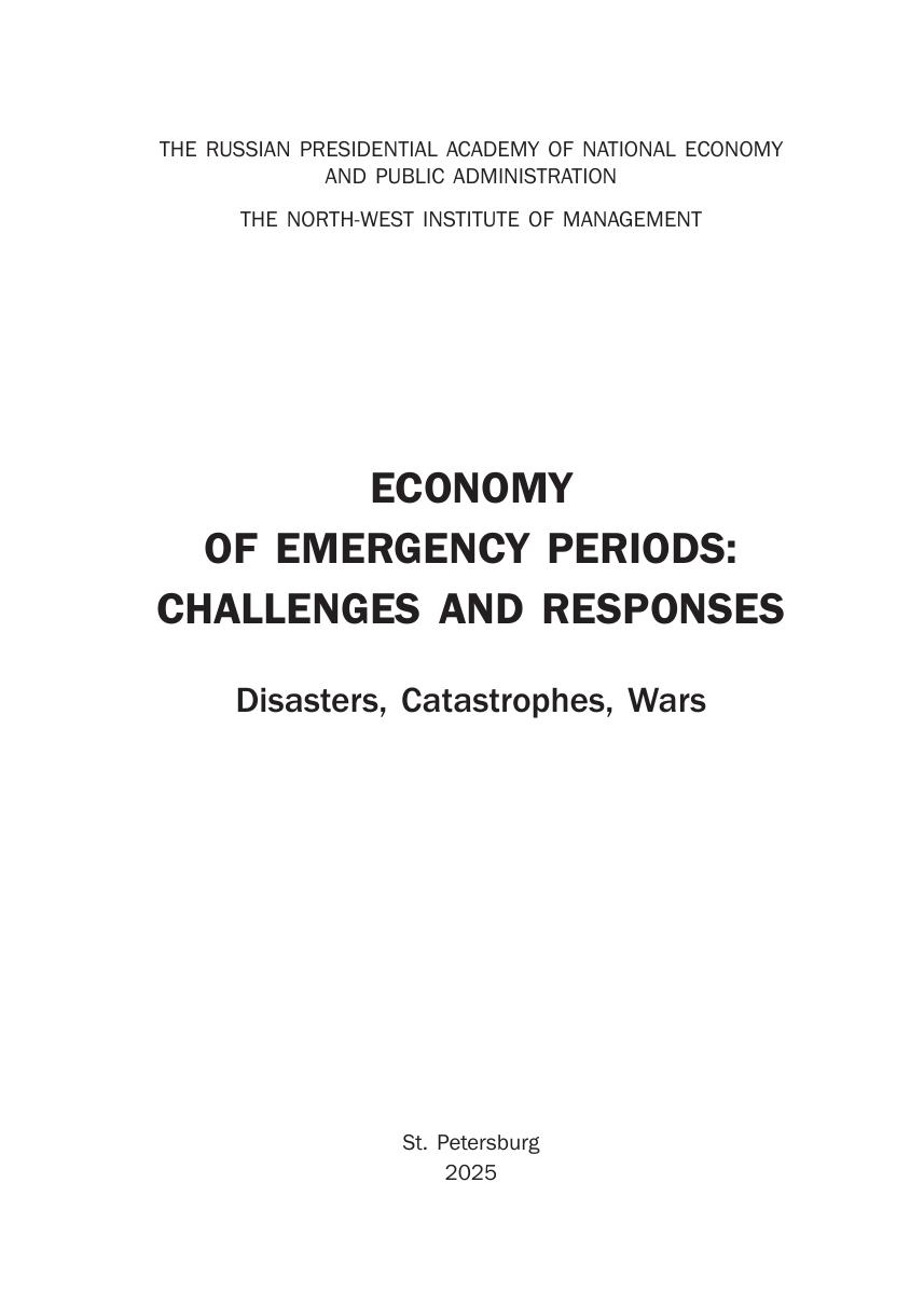 В монографии рассматриваются экономические аспекты встающих перед обществом вызовов в периоды войн, стихийных и медико-биологических бедствий и катастроф, а также возможные ответы на них и способы решения соответствующих проблем. Первый раздел посвящен экономическому значению бедствий и катастроф, из которых основное внимание авторы уделили эпидемии COVID-19, второй раздел – военной экономике, то есть организации экономики в условиях ведения военных действий и преодоления их последствий. Книга рекомендуется студентам по направлениям подготовки «Экономика» и «Государственное и муниципальное управление», а также преподавателям и исследователям, интересующимся особенностями функционирования экономики в чрезвычайных условиях.