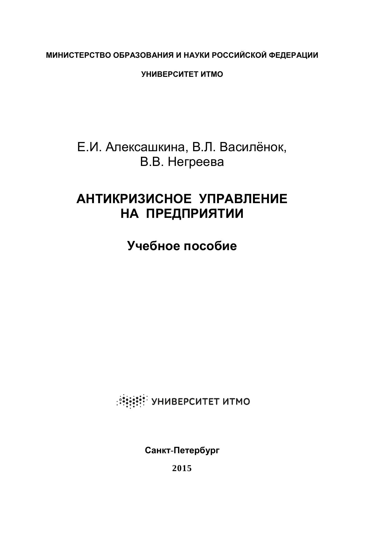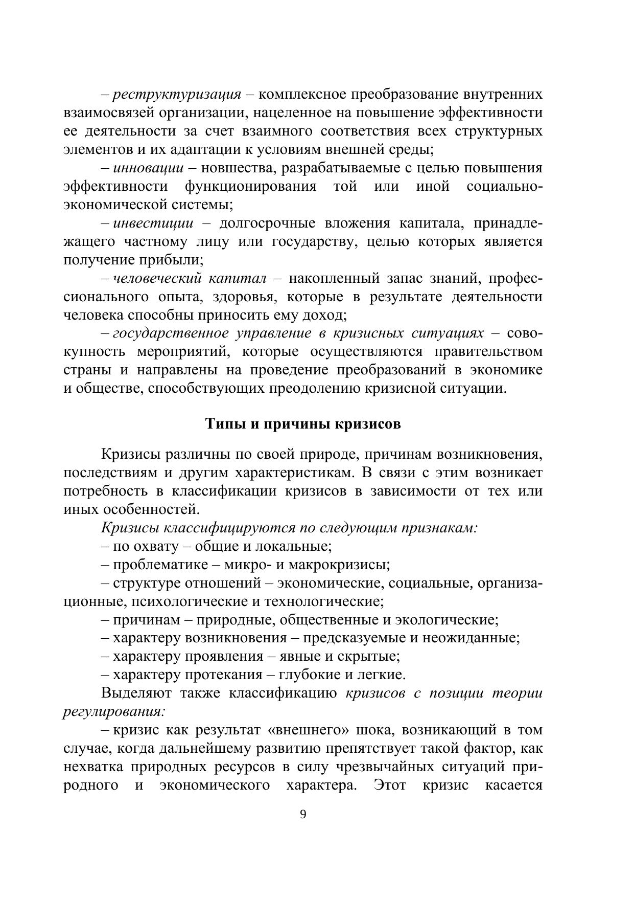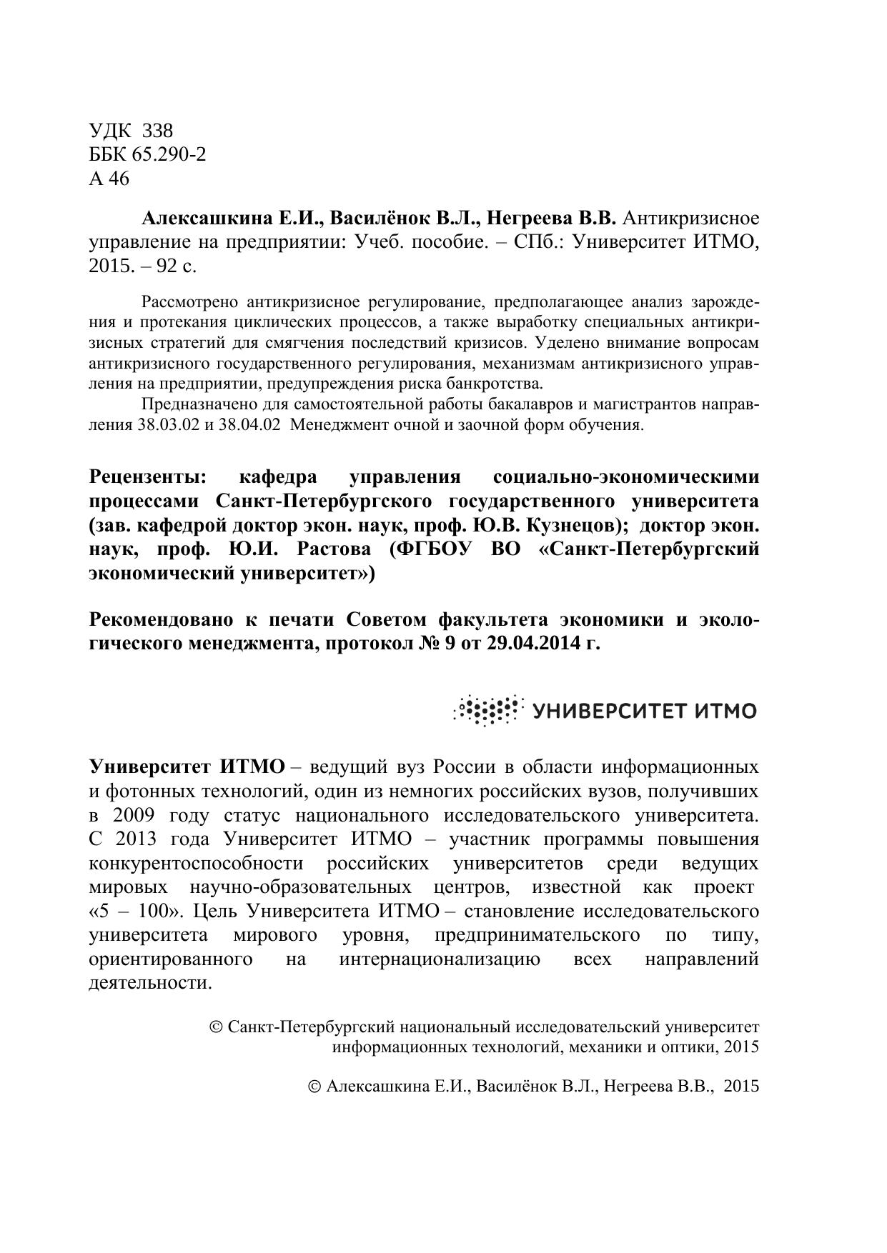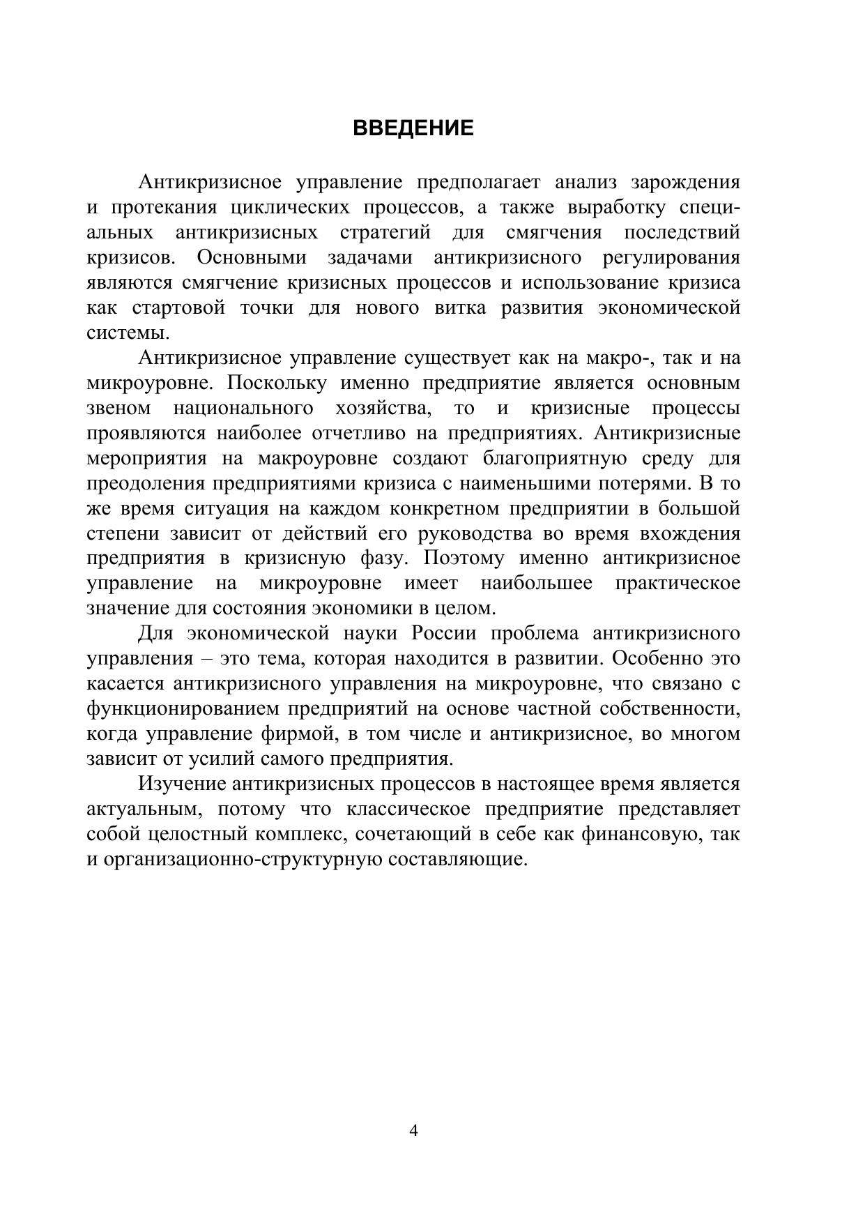 Рассмотрено антикризисное регулирование, предполагающее анализ зарождения и протекания циклических процессов, а также выработку специальных антикризисных стратегий для смягчения последствий кризисов. Уделено внимание вопросам антикризисного государственного регулирования, механизмам антикризисного управления на предприятии, предупреждения риска банкротства. Предназначено для самостоятельной работы бакалавров и магистрантов направления 38.03.02 и 38.04.02 Менеджмент очной и заочной форм обучения.