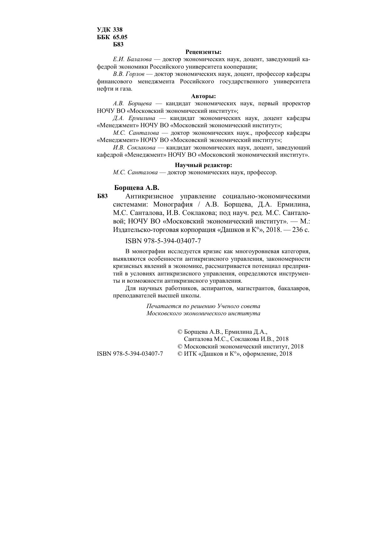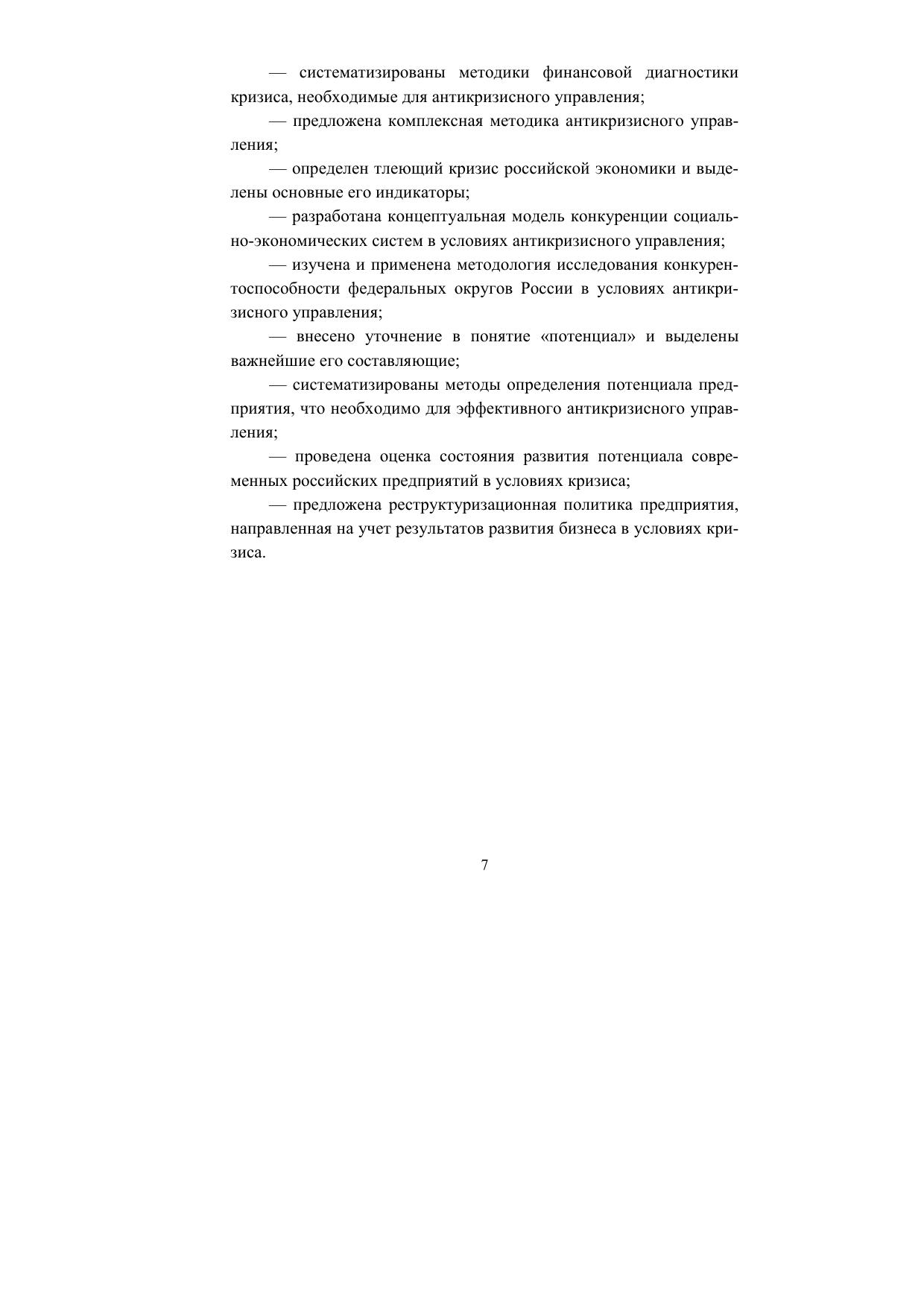 В монографии исследуется кризис как многоуровневая категория, выявляются особенности антикризисного управления, закономерности кризисных явлений в экономике, рассматривается потенциал предприятий в условиях антикризисного управления, определяются инструменты и возможности антикризисного управления. Для научных работников, аспирантов, магистрантов, бакалавров, преподавателей высшей школы.