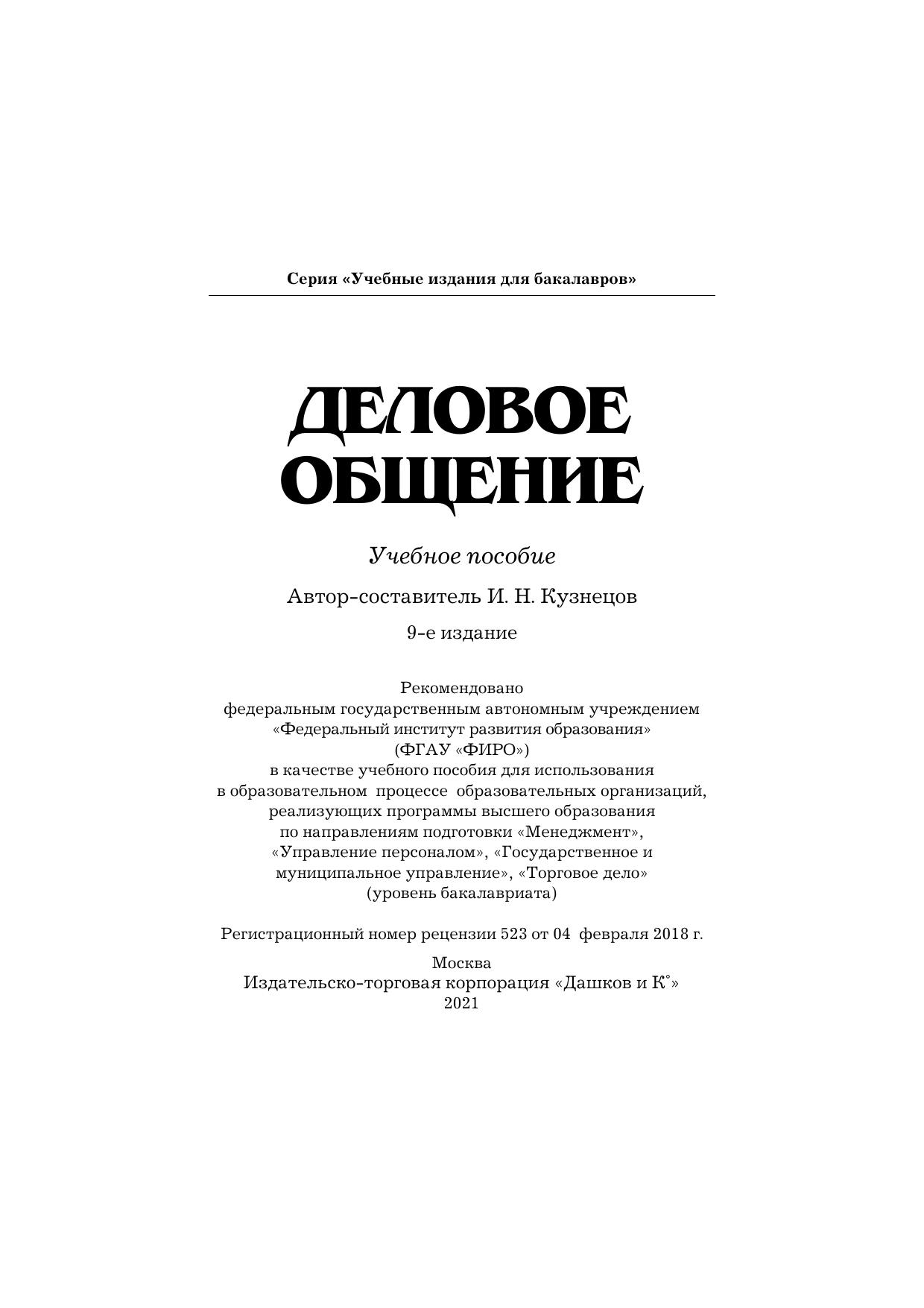В учебном пособии рассматриваются теоретические и прикладные вопросы делового общения. Раскрываются их природа, сущность и основные принципы. Анализируются психологические, этические, риторические правила делового общения. Особое внимание уделено рассмотрению проблем международного общения. На основе анализа и обобщения широкого круга российских и зарубежных источников излагаются основные теоретические положения, предлагаются практические рекомендации и советы, позволяющие более эффективно решать проблемы в области делового общения. Для студентов бакалавриата, обучающихся по направлениям подготовки «Менеджмент», «Управление персоналом», «Государственное и муниципальное управление», «Торговое дело». Рекомендуется также всем, кто интересуется проблемами делового общения.