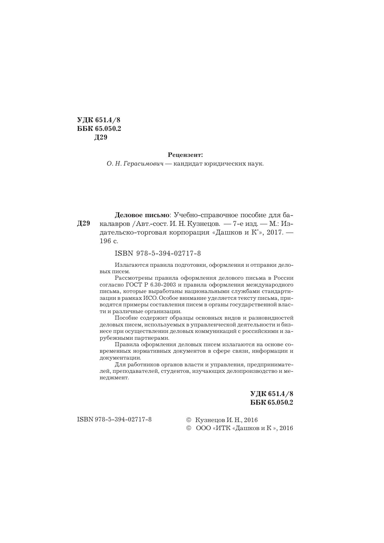 деловых писем, используемых в управленческой деятельности и бизнесе при осуществлении деловых коммуникаций с российскими и зарубежными партнерами. Правила оформления деловых писем излагаются на основе современных нормативных документов в сфере связи, информации и документации. Для работников органов власти и управления, предпринимателей, преподавателей, студентов, изучающих делопроизводство и менеджмент.