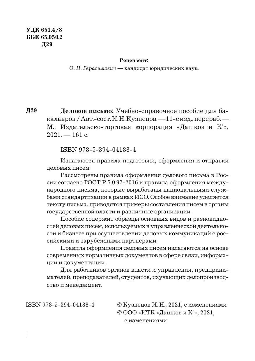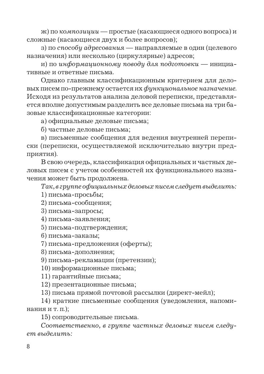 Излагаются правила подготовки, оформления и отправки деловых писем. Рассмотрены правила оформления делового письма в России согласно ГОСТ Р 6.30.2003 и правила оформления международного письма, которые выработаны национальными службами стандартизации в рамках ИСО. Особое внимание уделяется тексту письма, приводятся примеры составления писем в органы государственной власти и различные организации. Пособие содержит образцы основных видов и разновидностей деловых писем, используемых в управленческой деятельности и бизнесе при осуществлении деловых коммуникаций с российскими и зарубежными партнерами. Правила оформления деловых писем излагаются на основе современных нормативных документов в сфере связи, информации и документации. Для работников органов власти и управления, предпринимателей, преподавателей, студентов, изучающих делопроизводство и менеджмент.