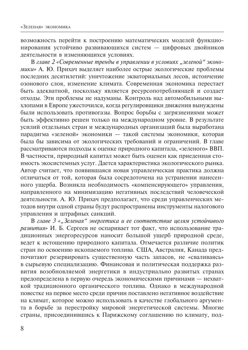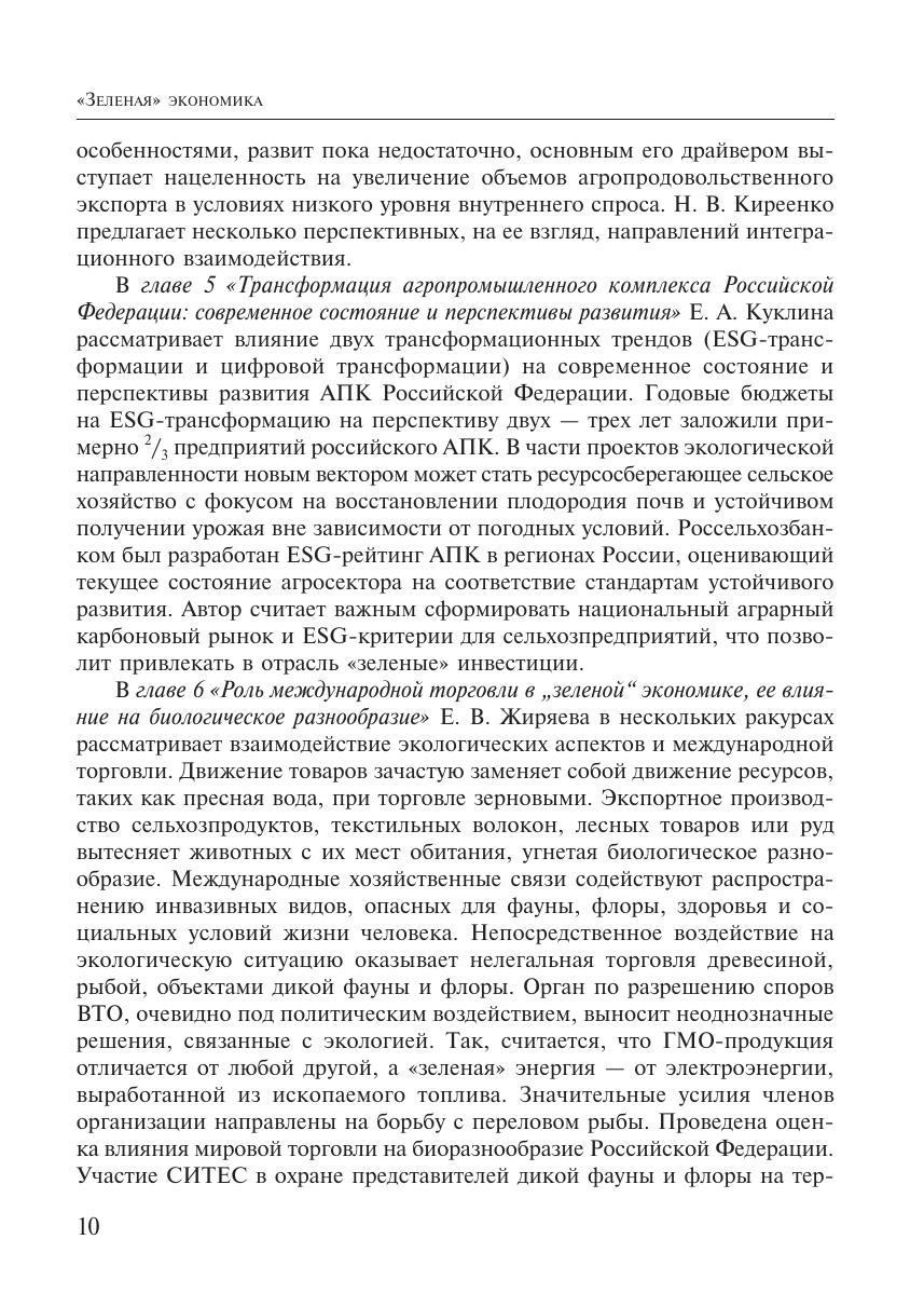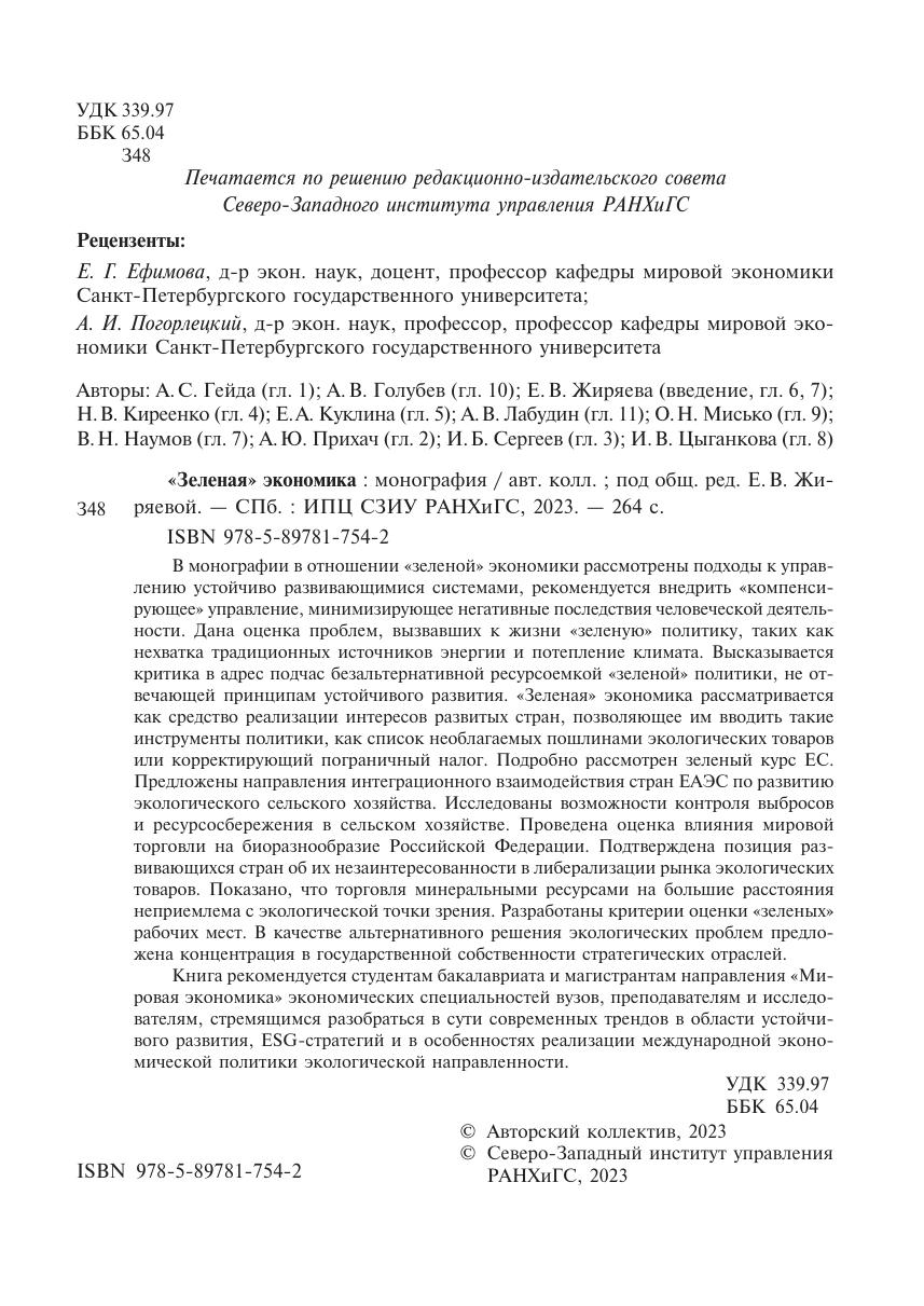 В монографии в отношении «зеленой» экономики рассмотрены подходы к управлению устойчиво развивающимися системами, рекомендуется внедрить «компенсирующее» управление, минимизирующее негативные последствия человеческой деятельности. Дана оценка проблем, вызвавших к жизни «зеленую» политику, таких как нехватка традиционных источников энергии и потепление климата. Высказывается критика в адрес подчас безальтернативной ресурсоемкой «зеленой» политики, не отвечающей принципам устойчивого развития. «Зеленая» экономика рассматривается как средство реализации интересов развитых стран, позволяющее им вводить такие инструменты политики, как список необлагаемых пошлинами экологических товаров или корректирующий пограничный налог. Подробно рассмотрен зеленый курс ЕС. Предложены направления интеграционного взаимодействия стран ЕАЭС по развитию экологического сельского хозяйства. Исследованы возможности контроля выбросов и ресурсосбережения в сельском хозяйстве. Проведена оценка влияния мировой торговли на биоразнообразие Российской Федерации. Подтверждена позиция развивающихся стран об их незаинтересованности в либерализации рынка экологических товаров. Показано, что торговля минеральными ресурсами на большие расстояния неприемлема с экологической точки зрения. Разработаны критерии оценки «зеленых» рабочих мест. В качестве альтернативного решения экологических проблем предложена концентрация в государственной собственности стратегических отраслей. Книга рекомендуется студентам бакалавриата и магистрантам направления «Мировая экономика» экономических специальностей вузов, преподавателям и исследователям, стремящимся разобраться в сути современных трендов в области устойчивого развития, ESG-стратегий и в особенностях реализации международной экономической политики экологической направленности.