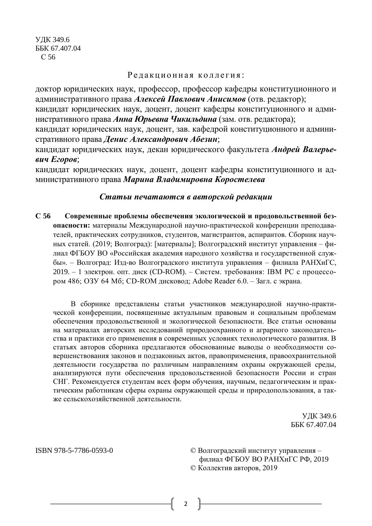 Современные проблемы обеспечения экологической и продовольственной безопасности: материалы Международной научно-практической конференции преподавателей, практических сотрудников, студентов, магистрантов, аспирантов. Сборник научных статей. (2019; Волгоград): [материалы]
