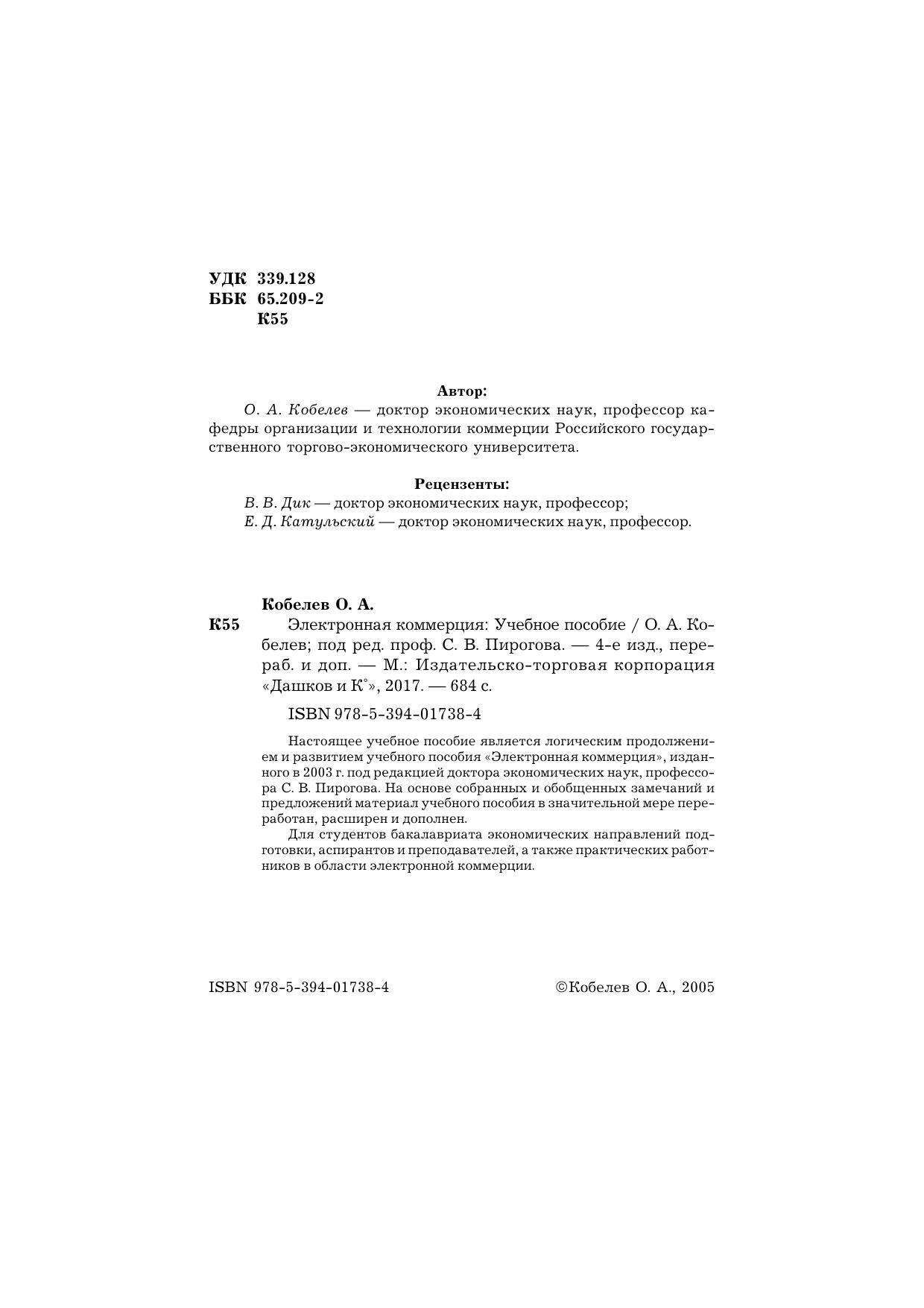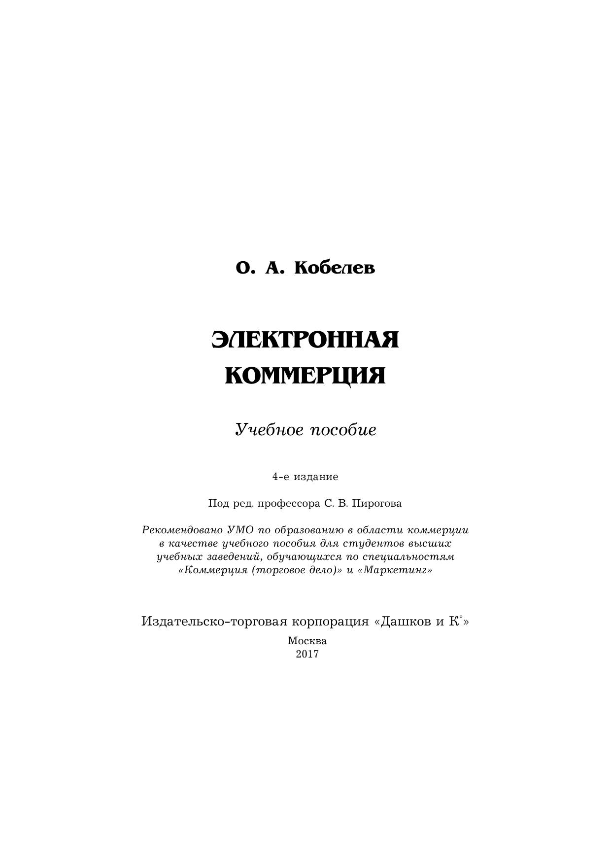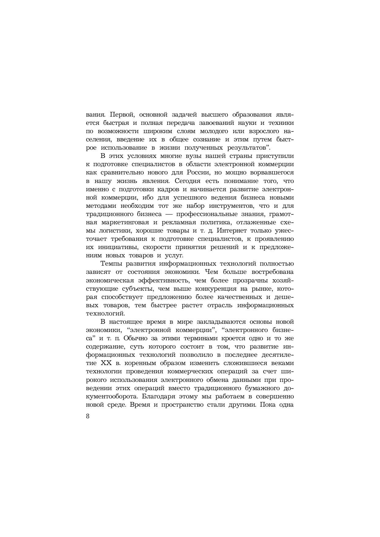 Настоящее учебное пособие является логическим продолжением и развитием учебного пособия "Электронная коммерция", изданного в 2003 г. под редакцией доктора экономических наук, профессора С.В.Пирогова. На основе собранных и обобщенных замечаний и предложений материал учебного пособия в значительной мере переработан, расширен и дополнен. Для студентов вузов экономических специальностей, аспирантов и преподавателей, а также практических работников в области электронной коммерции.