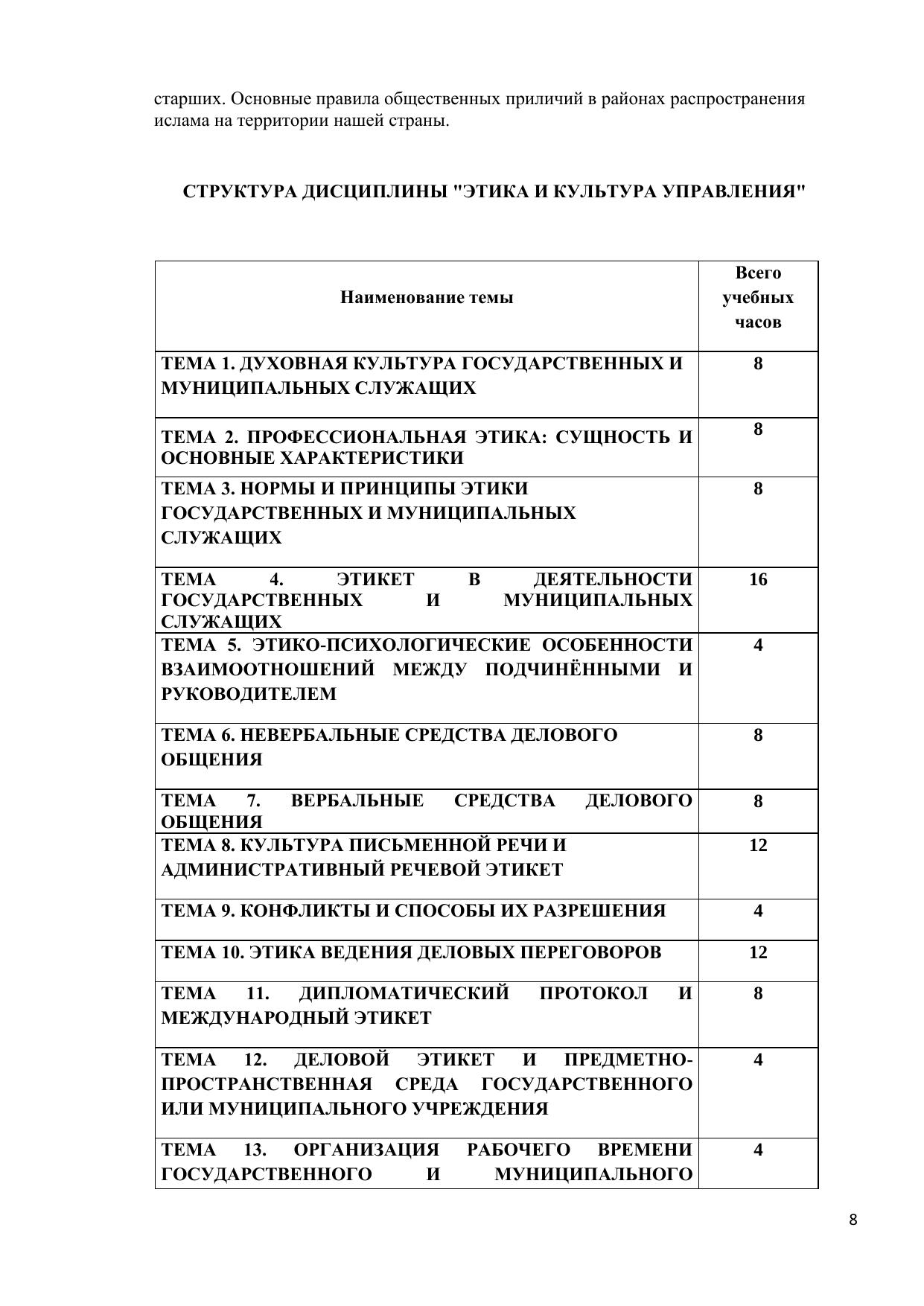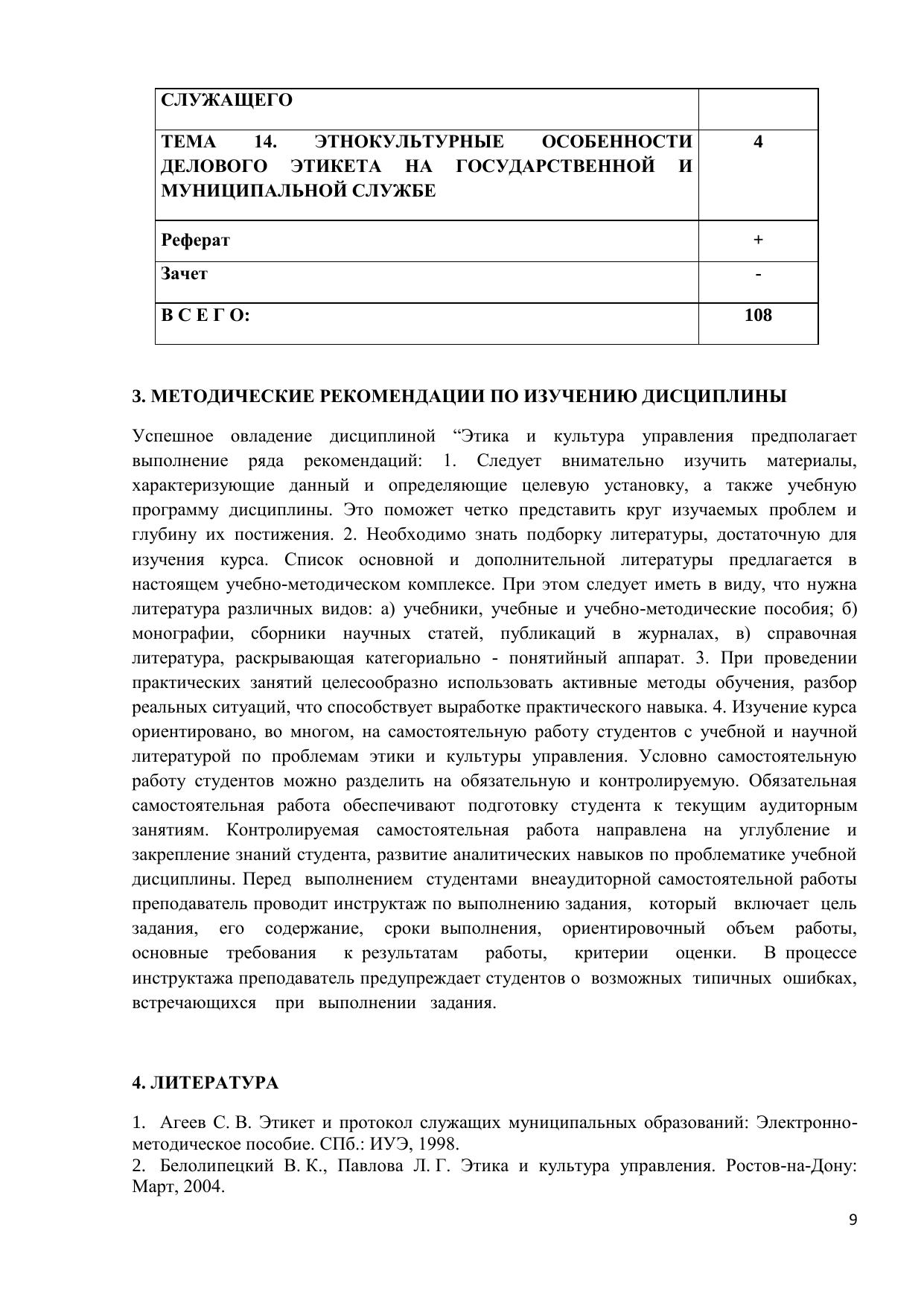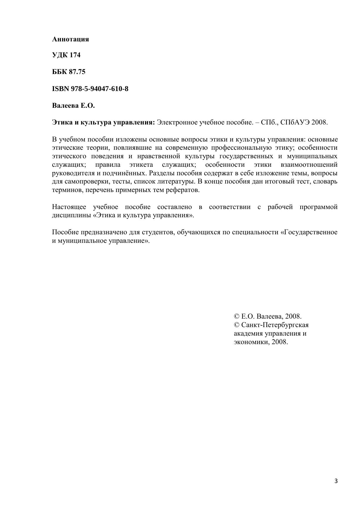 В учебном пособии изложены основные вопросы этики и культуры управления: основные этические теории, повлиявшие на современную профессиональную этику особенности этического поведения и нравственной культуры государственных и муниципальных служащих правила этикета служащих особенности этики взаимоотношений руководителя и подчинённых. Разделы пособия содержат в себе изложение темы, вопросы для самопроверки, тесты, список литературы. В конце пособия дан итоговый тест, словарь терминов, перечень примерных тем рефератов. Настоящее учебное пособие составлено в соответствии с рабочей программой дисциплины «Этика и культура управления». Пособие предназначено для студентов, обучающихся по специальности «Государственное и муниципальное управление». Электронное учебное пособие для дистанционного обучения