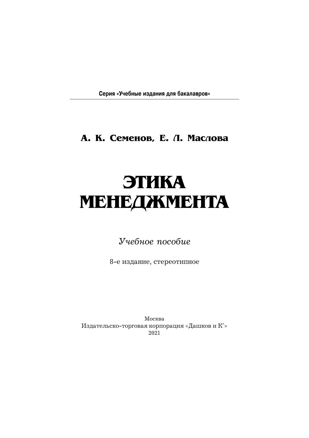 В учебном пособии рассматриваются теоретические и методологические основы этики менеджмента. Освещаются вопросы делового общения и корпоративного поведения, личностных взаимоотношений. В пособии освещаются проблемы, связанные с проведением собраний, совещаний, презентаций, деловых переговоров, оформлением офиса, национальными особенностями этики. Для студентов учебных заведений высшего и среднего профессионального образования, преподавателей, практических работников, а также всех тех, кто интересуется современными проблемами управления.