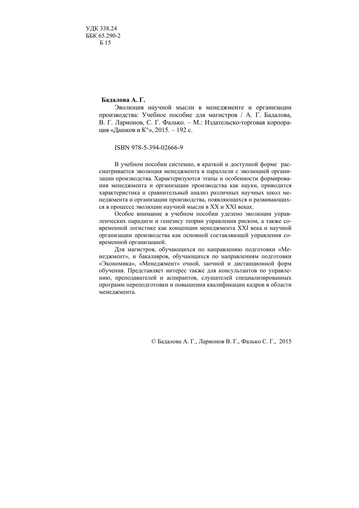 В учебном пособии системно, в краткой и доступной форме рассматривается эволюция менеджмента в параллели с эволюцией организации производства. Характеризуются этапы и особенности формирования менеджмента и организации производства как науки, приводится характеристика и сравнительный анализ различных научных школ менеджмента и организации производства, появляющихся и развивающихся в процессе эволюции научной мысли в ХХ и XXI веках. Особое внимание в учебном пособии уделено эволюции управленческих парадигм и генезису теории управления риском, а также современной логистике как концепции менеджмента XXI века и научной организации производства как основной составляющей управления современной организацией. Для магистров, обучающихся по направлению подготовки «Менеджмент», и бакалавров, обучающихся по направлениям подготовки «Экономика», «Менеджмент» очной, заочной и дистанционной форм обучения. Представляет интерес также для консультантов по управлению, преподавателей и аспирантов, слушателей специализированных программ переподготовки и повышения квалификации кадров в области менеджмента.