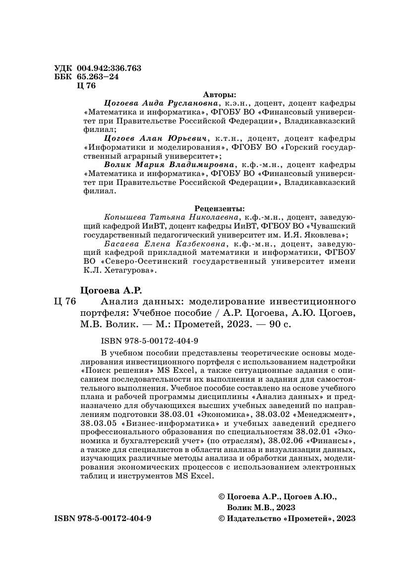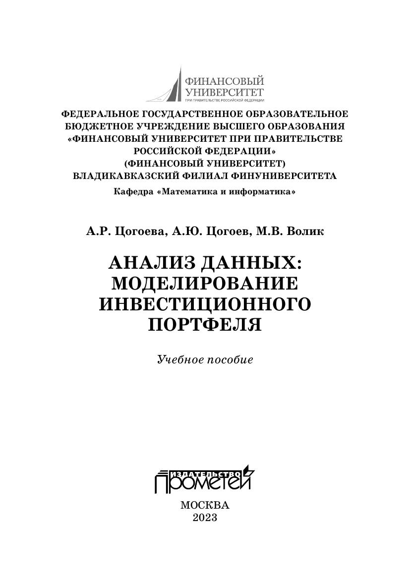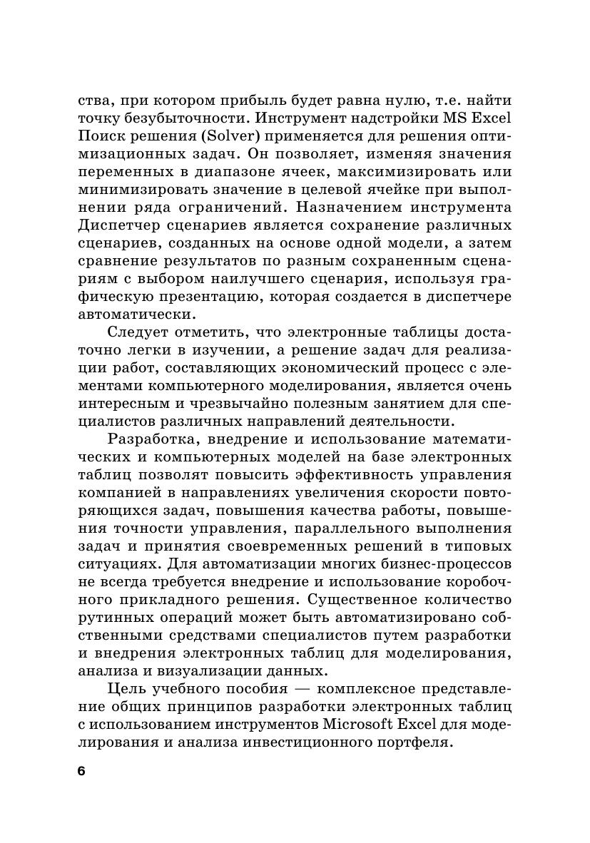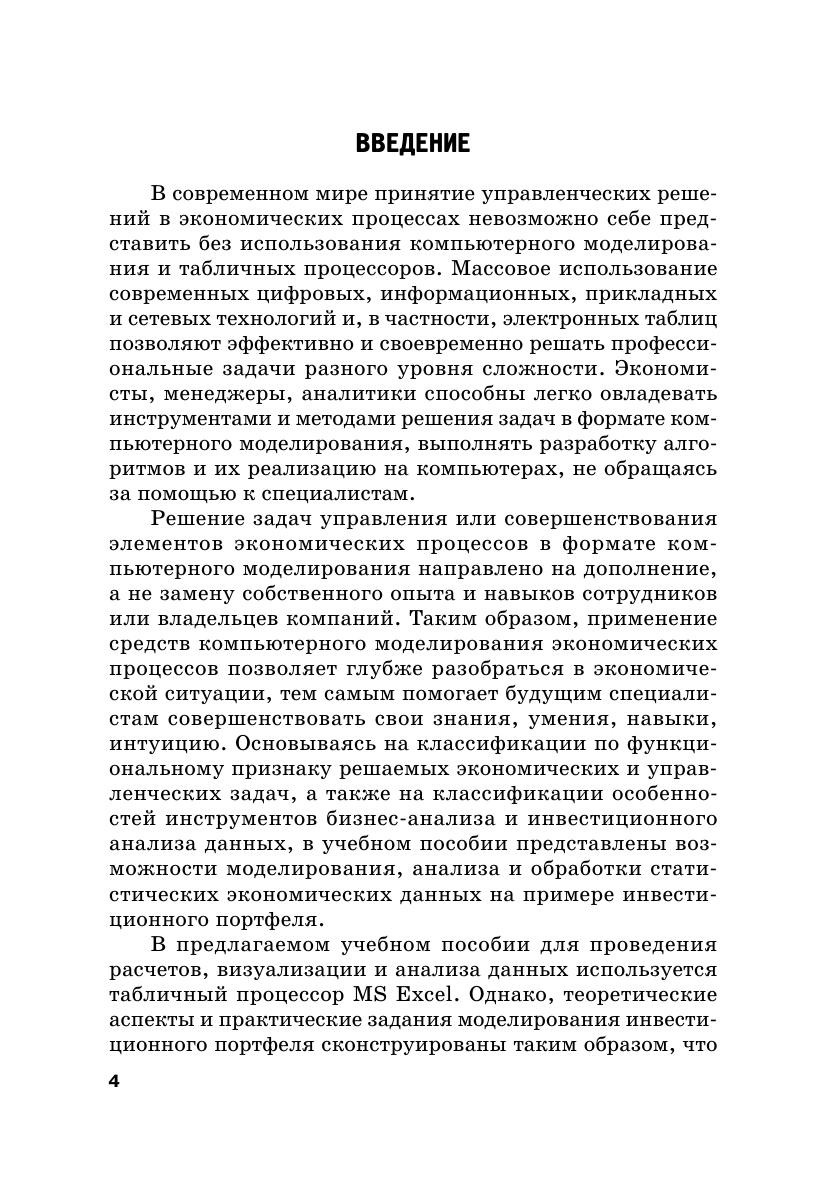 В учебном пособии представлены теоретические основы моделирования инвестиционного портфеля с использованием надстройки «Поиск решения» MS Excel, а также ситуационные задания с описанием последовательности их выполнения и задания для самостоятельного выполнения. Учебное пособие составлено на основе учебного плана и рабочей программы дисциплины «Анализ данных» и предназначено для обучающихся высших учебных заведений по направлениям подготовки 38.03.01 «Экономика», 38.03.02 «Менеджмент», 38.03.05 «Бизнес-информатика» и учебных заведений среднего профессионального образования по специальностям 38.02.01 «Экономика и бухгалтерский учет» (по отраслям), 38.02.06 «Финансы», а также для специалистов в области анализа и визуализации данных, изучающих различные методы анализа и обработки данных, моделирования экономических процессов с использованием электронных таблиц и инструментов MS Excel.