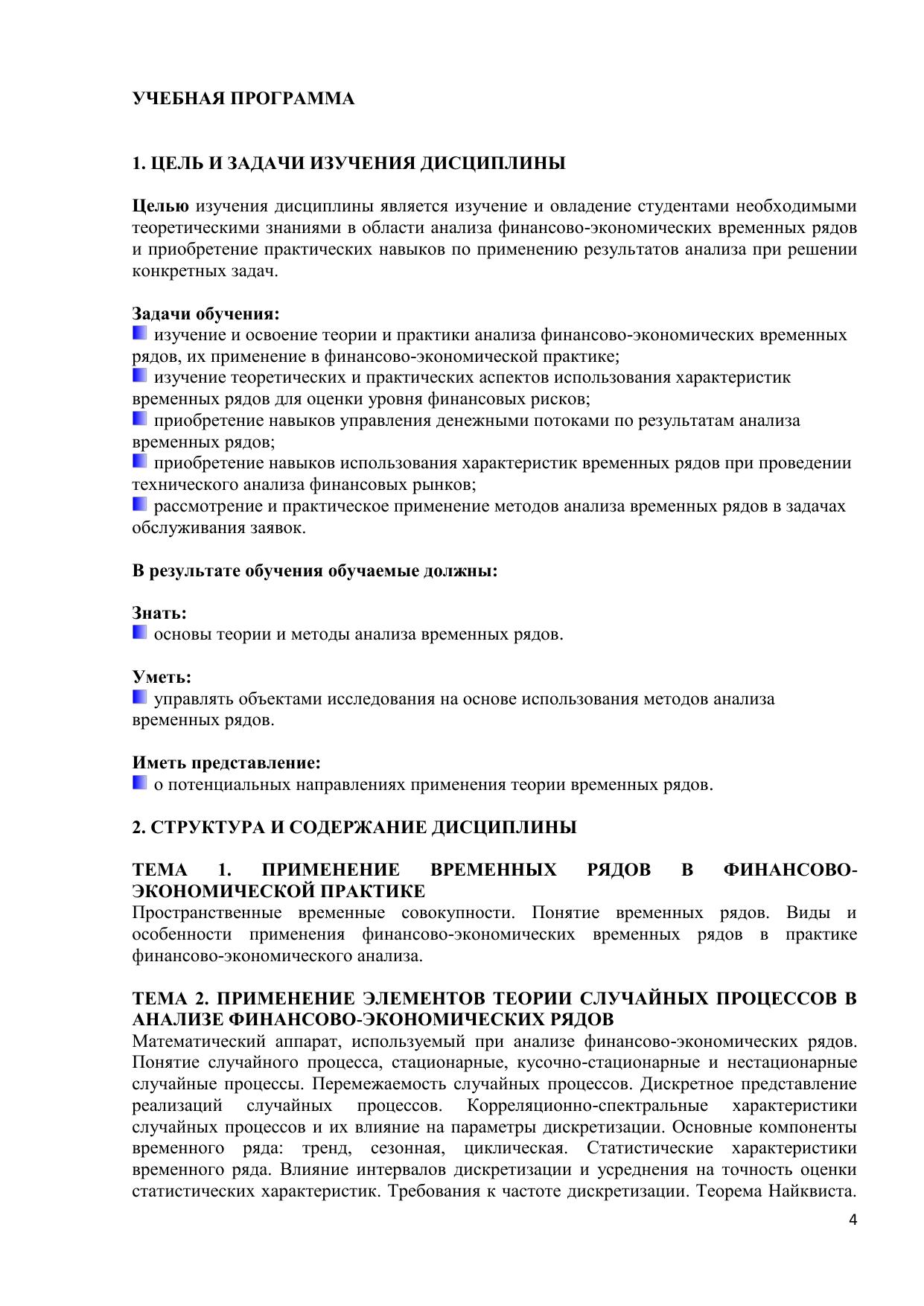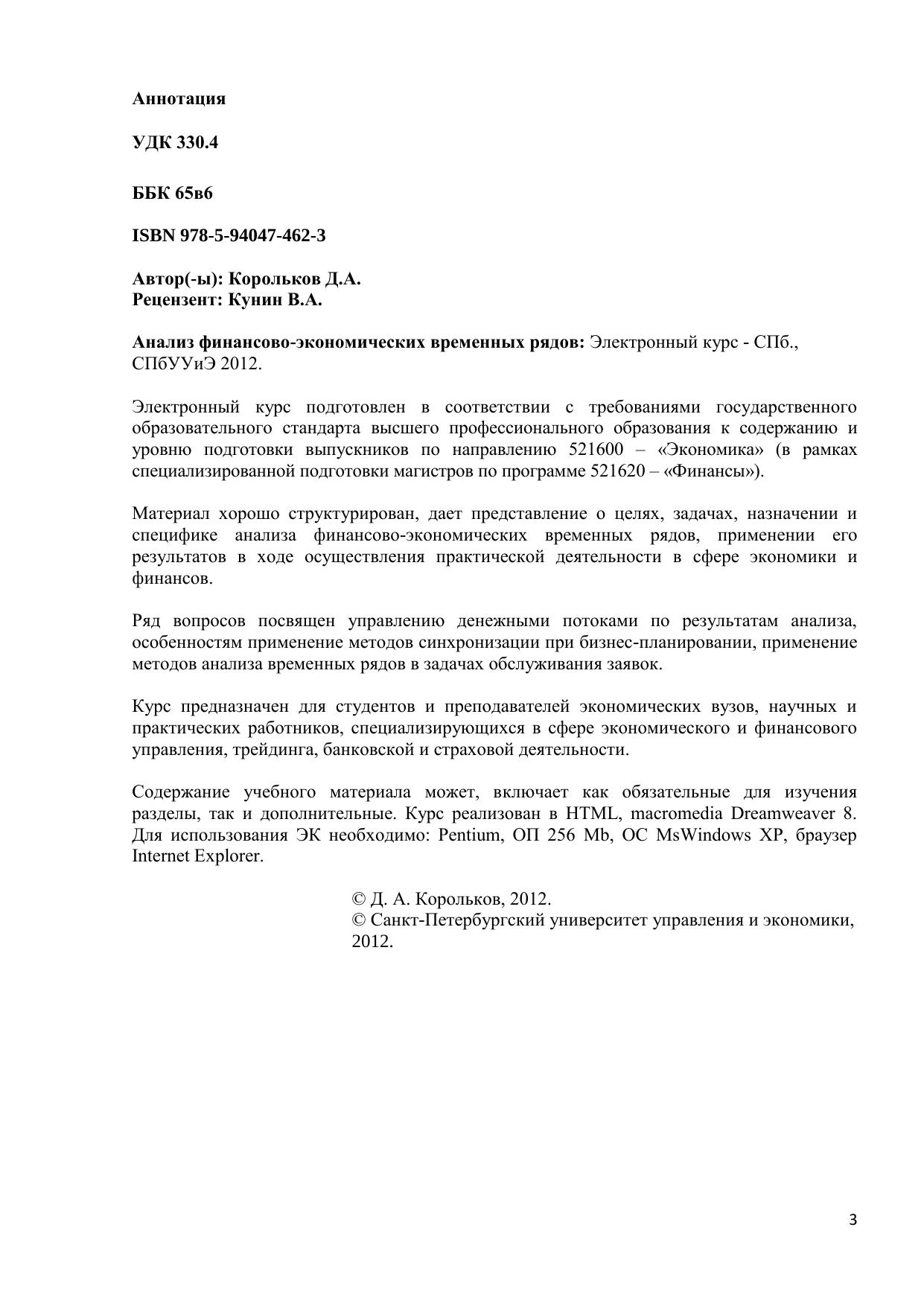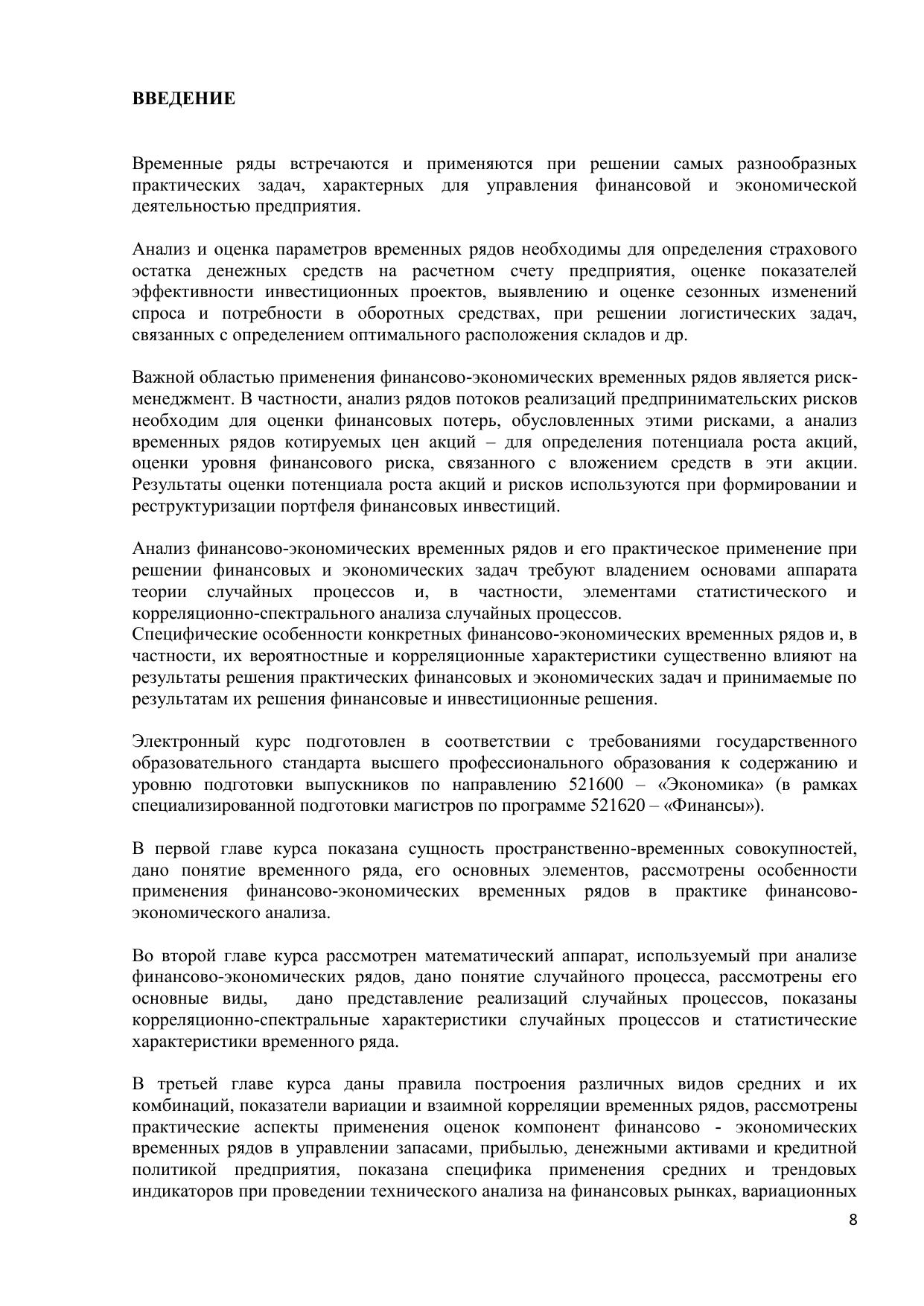 Электронный курс подготовлен в соответствии с требованиями государственного образовательного стандарта высшего профессионального образования к содержанию и уровню подготовки выпускников по направлению 521600 – «Экономика» (в рамках специализированной подготовки магистров по программе 521620 – «Финансы»). Материал хорошо структурирован, дает представление о целях, задачах, назначении и специфике анализа финансово-экономических временных рядов, применении его результатов в ходе осуществления практической деятельности в сфере экономики и финансов. Ряд вопросов посвящен управлению денежными потоками по результатам анализа, особенностям применение методов синхронизации при бизнес-планировании, применение методов анализа временных рядов в задачах обслуживания заявок. Курс предназначен для студентов и преподавателей экономических вузов, научных и практических работников, специализирующихся в сфере экономического и финансового управления, трейдинга, банковской и страховой деятельности. Содержание учебного материала может, включает как обязательные для изучения разделы, так и дополнительные. Курс реализован в HTML, macromedia Dreamweaver 8. Для использования ЭК необходимо: Pentium, ОП 256 Мb, ОС MsWindows XP, браузер Internet Еxplorer.