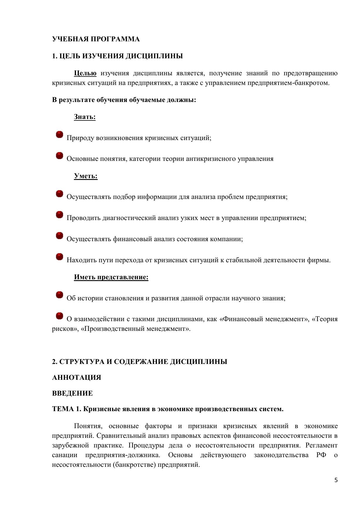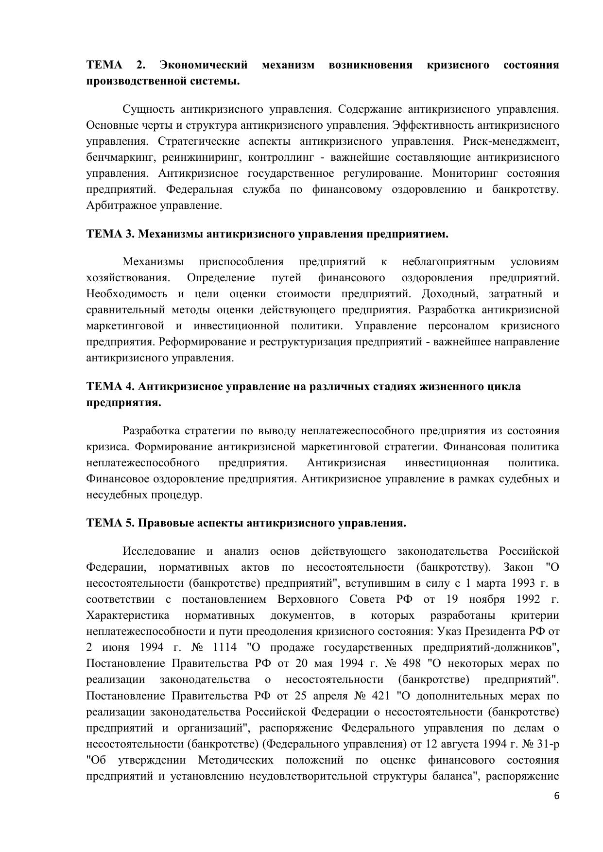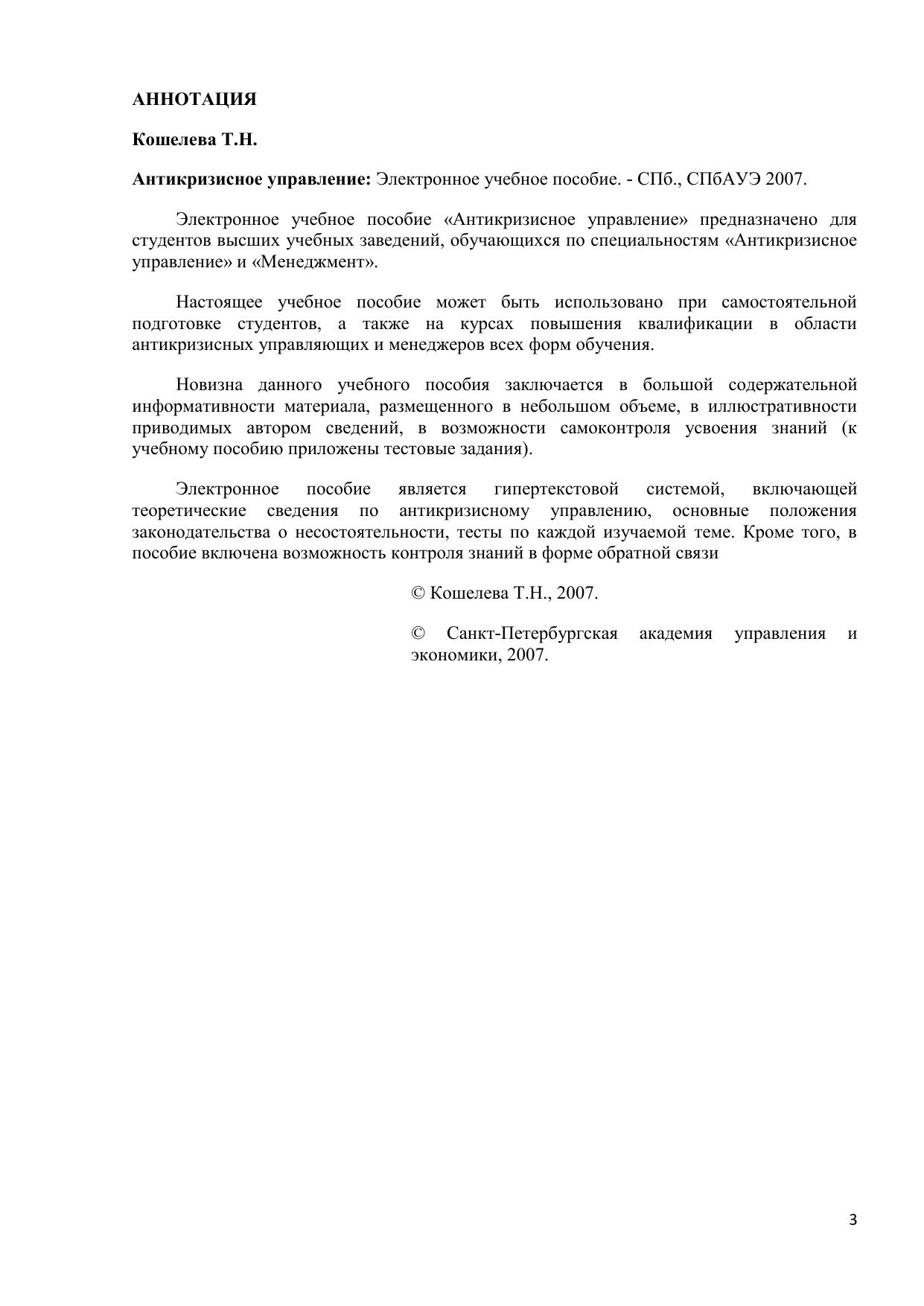 Электронное учебное пособие «Антикризисное управление» предназначено для студентов высших учебных заведений, обучающихся по специальностям «Антикризисное управление» и «Менеджмент». Настоящее учебное пособие может быть использовано при самостоятельной подготовке студентов, а также на курсах повышения квалификации в области антикризисных управляющих и менеджеров всех форм обучения. Новизна данного учебного пособия заключается в большой содержательной информативности материала, размещенного в небольшом объеме, в иллюстративности приводимых автором сведений, в возможности самоконтроля усвоения знаний (к учебному пособию приложены тестовые задания). Электронное пособие является гипертекстовой системой, включающей теоретические сведения по антикризисному управлению, основные положения законодательства о несостоятельности, тесты по каждой изучаемой теме. Кроме того, в пособие включена возможность контроля знаний в форме обратной связи.