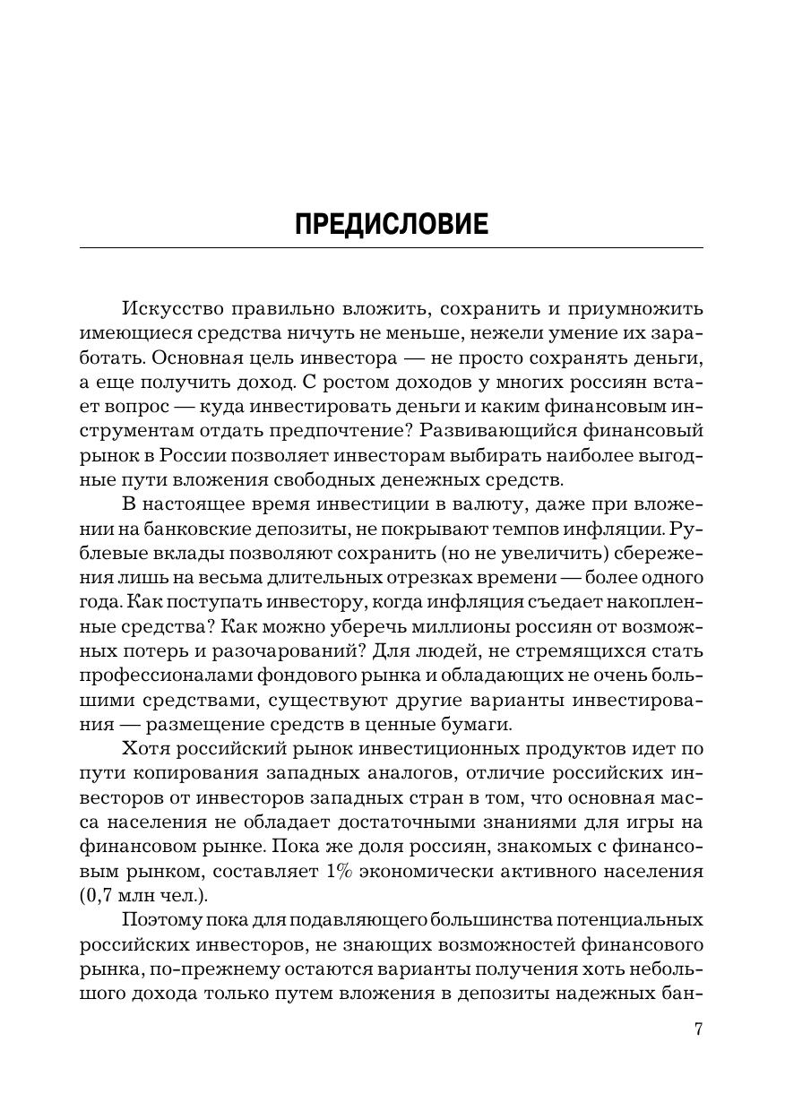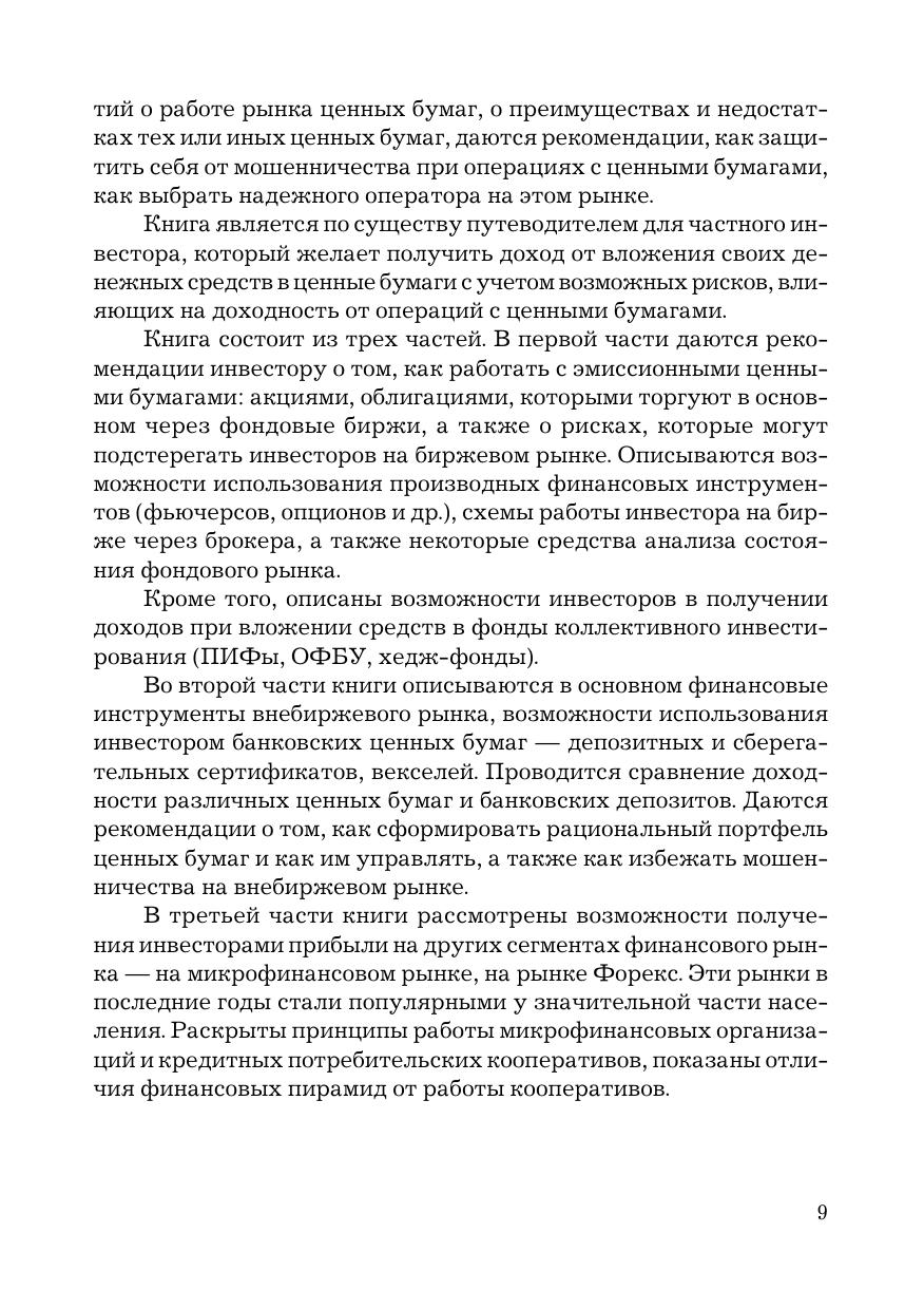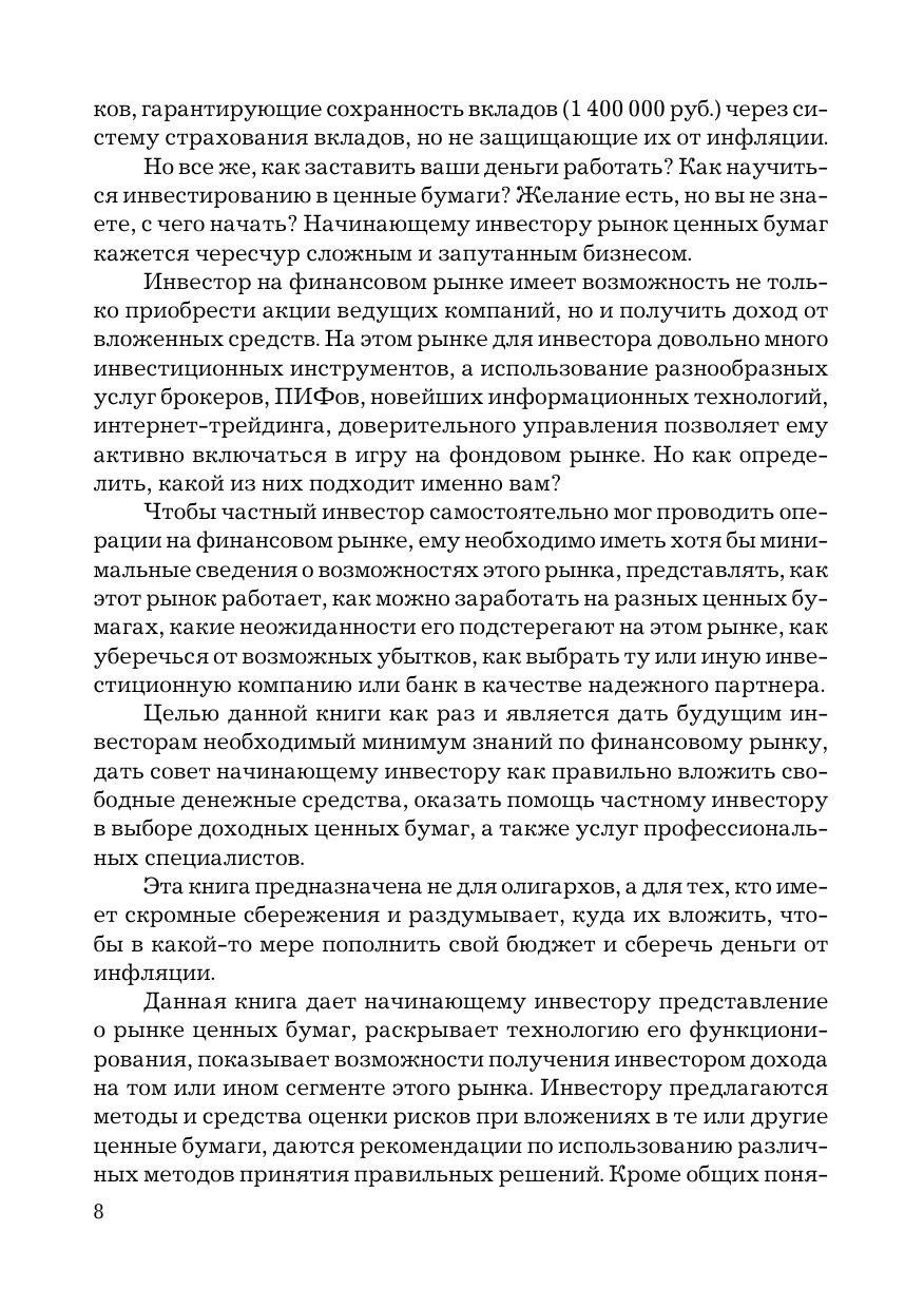 В книге в простой и доступной форме описаны возможности получения дохода частным инвестором от операций с ценными бумагами. Предлагаются методы и средства оценки рисков при вложениях в те или другие ценные бумаги, даются рекомендации, как защитить себя от мошенничества, как выбрать надежного оператора на финансовом рынке. Для частных инвесторов, физических лиц, студентов экономических вузов, специалистов экономических служб предприятий и компаний.