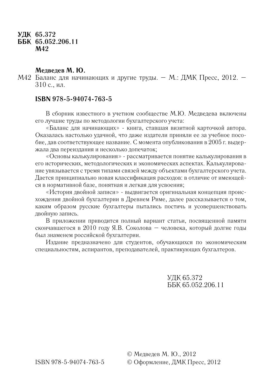 В сборник известного в учетном сообществе М.Ю. Медведева включены его лучшие труды по методологии бухгалтерского учета: «Баланс для начинающих» - книга, ставшая визитной карточкой автора. Оказалась настолько удачной, что даже издатели приняли ее за учебное пособие, дав соответствующее название. С момента опубликования в 2005 г. выдержала два переиздания и несколько допечаток, «Основы калькулирования» - рассматривается понятие калькулирования в его исторических, методологических и экономических аспектах. Калькулирование увязывается с тремя типами связей между объектами бухгалтерского учета. Дается принципиально новая классификация расходов: в отличие от имеющейся в нормативной базе, понятная и легкая для усвоения, «История двойной записи» - выдвигается оригинальная концепция происхождения двойной бухгалтерии в Древнем Риме, далее рассказывается о том, каким образом русские бухгалтеры пытались постичь и усовершенствовать двойную запись. В приложении приводится полный вариант статьи, посвященной памяти скончавшегося в 2010 году Я.В. Соколова – человека, который долгие годы был знаменем российской бухгалтерии. Издание предназначено для студентов, обучающихся по экономическим специальностям, аспирантов, преподавателей, практикующих бухгалтеров.