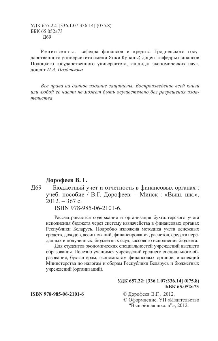 Рассматриваются содержание и организация бухгалтерского учета исполнения бюджета через систему казначейства в финансовых органах Республики Беларусь. Подробно изложена методика учета денежных средств, дохода, ассигнований, финансирования, расчетов, средств переданных и полученных, бюджетных ссуд, кассового исполнения бюджета. Для студентов вузов экономических специальностей. Полезно учащимся ССУЗов, бухгалтерам, экономистам финансовых органов, инспекций Министерства по налогам и сборам Республики Беларусь и бюджетных учреждений (организаций).