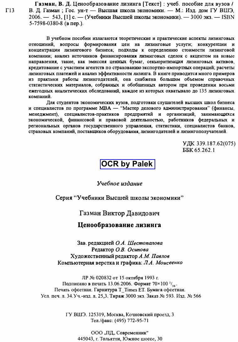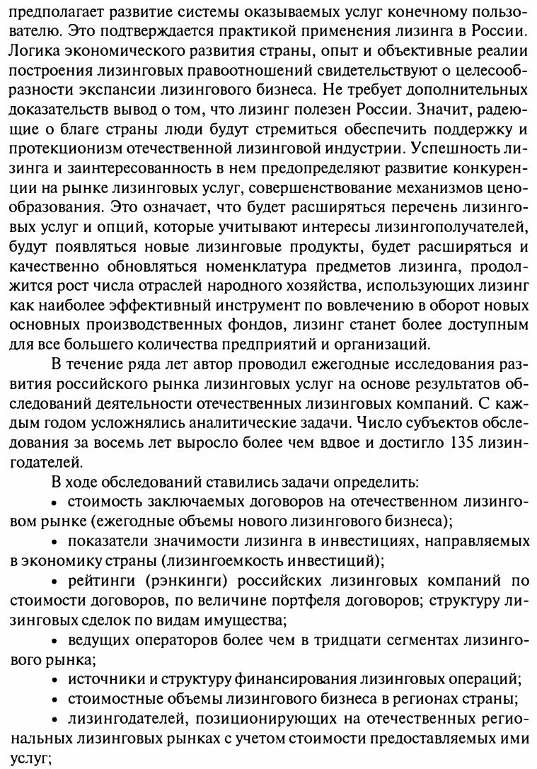 В учебном пособии излагаются теоретические и практические аспекты лизинговых отношений, вопросы формирования цен на лизинговые услуги; конкуренции и концентрации лизингового бизнеса; подходы к определению стоимости лизинговой компании; анализ источников финансирования лизинговых сделок с акцентом на новые направления, такие, как эмиссия ценных бумаг, секьюритизация лизинговых активов, кредитование с участием агентств по страхованию экспортно-импортных операций; расчеты лизинговых платежей и анализ эффективности лизинга. В книге приводится много примеров из практики работы лизингодателей, она снабжена большим объемом справочных статистических материалов, собранных и обобщенных автором при проведении восьми ежегодных аналитических обследований, каждое из которых охватывало до 134 лизинговых компаний. Для студентов экономических вузов, подготовки слушателей высших школ бизнеса и специалистов по программе МВА — "Мастер делового администрирования" (финансы, менеджмент), специалистов-практиков предприятий и организаций, занимающихся экономической, финансовой и правовой деятельностью, работников федеральных и региональных органов государственного управления, статистики, специалистов банков, страховых компаний, поставщиков оборудования, лизингодателей и лизингополучателей.