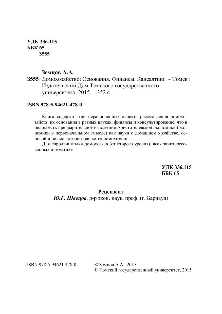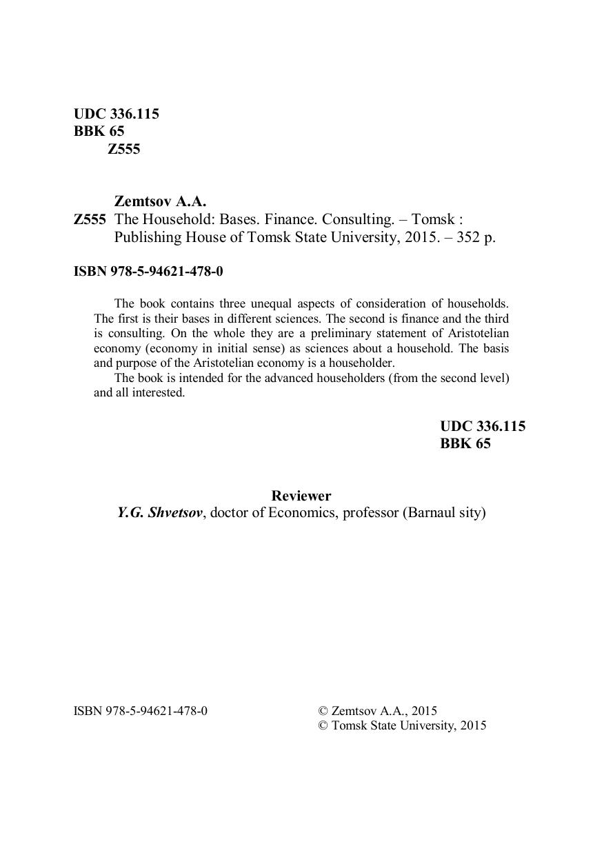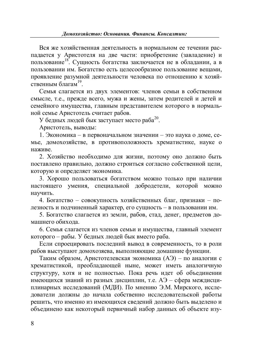 Книга содержит три неравноценных аспекта рассмотрения домохозяйств: их основания в разных науках, финансы и консультирование, что в целом есть предварительное изложение Аристотелевской экономики (экономики в первоначальном смысле) как науки о домашнем хозяйстве, основой и целью которого является домохозяин. Для «продвинутых» домохозяев (от второго уровня), всех заинтересованных в тематике.