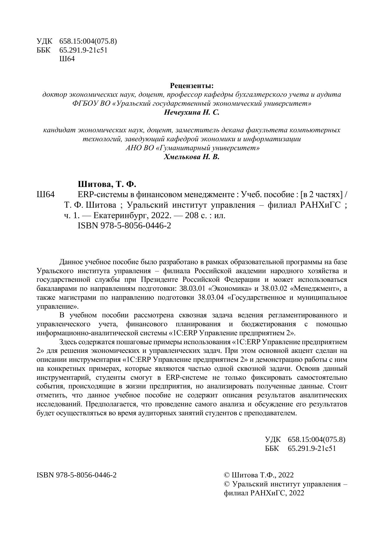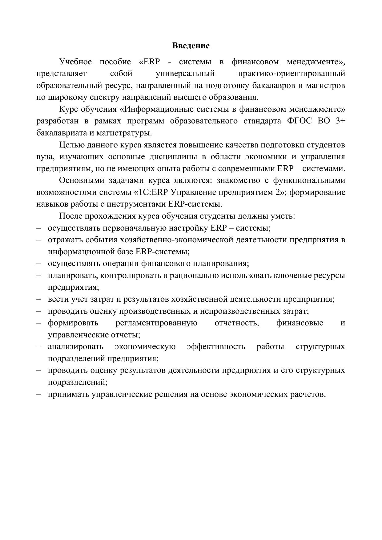 Данное учебное пособие было разработано в рамках образовательной программы на базе Уральского института управления – филиала Российской академии народного хозяйства и государственной службы при Президенте Российской Федерации и может использоваться бакалаврами по направлениям подготовки: 38.03.01 «Экономика» и 38.03.02 «Менеджмент», а также магистрами по направлению подготовки 38.03.04 «Государственное и муниципальное управление». В учебном пособии рассмотрена сквозная задача ведения регламентированного и управленческого учета, финансового планирования и бюджетирования с помощью информационно-аналитической системы «1С:ERP Управление предприятием 2». Здесь содержатся пошаговые примеры использования «1С:ERP Управление предприятием 2» для решения экономических и управленческих задач. При этом основной акцент сделан на описании инструментария «1С:ERP Управление предприятием 2» и демонстрацию работы с ним на конкретных примерах, которые являются частью одной сквозной задачи. Освоив данный инструментарий, студенты смогут в ERP-системе не только фиксировать самостоятельно события, происходящие в жизни предприятия, но анализировать полученные данные. Стоит отметить, что данное учебное пособие не содержит описания результатов аналитических исследований. Предполагается, что проведение самого анализа и обсуждение его результатов будет осуществляться во время аудиторных занятий студентов с преподавателем.