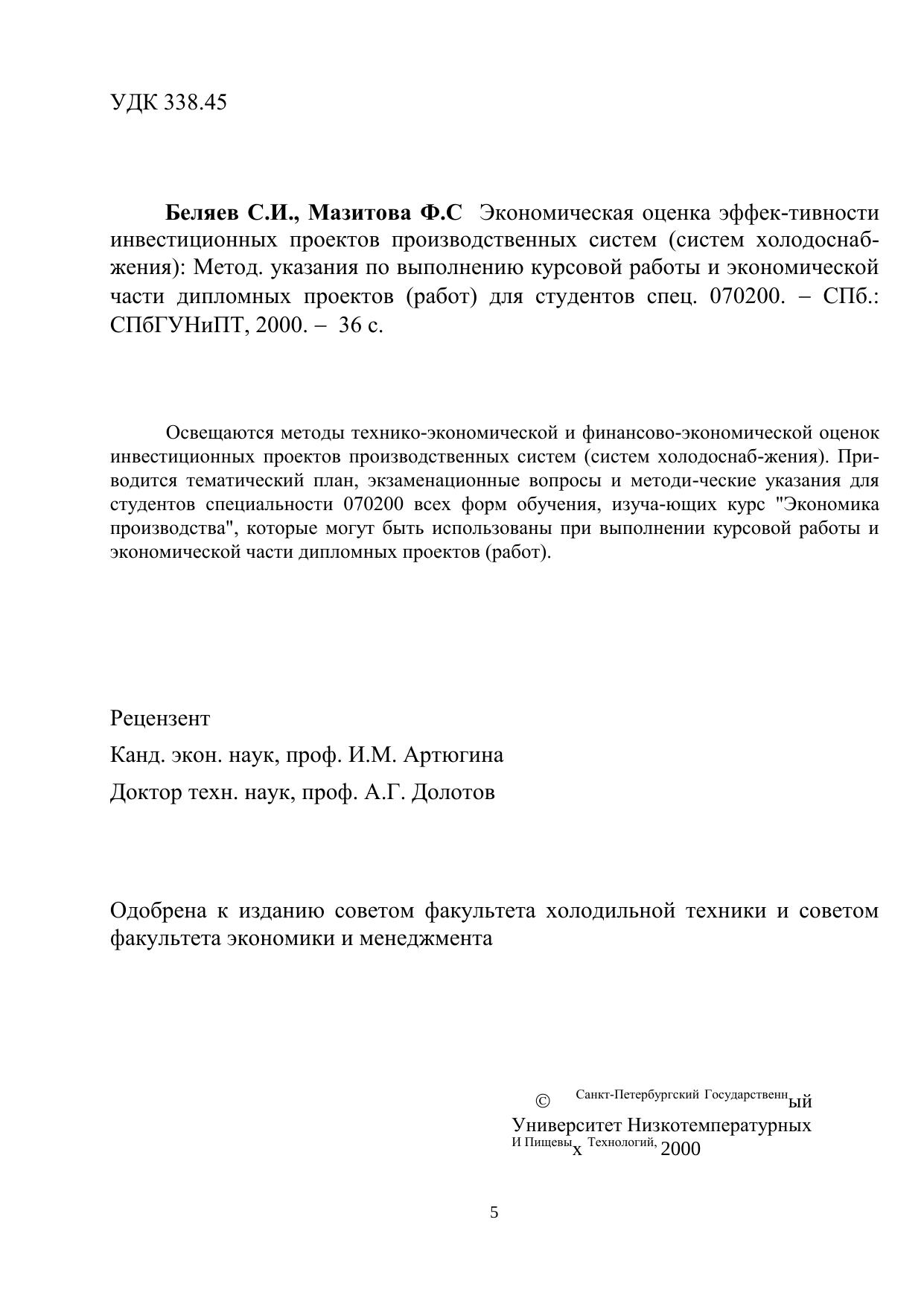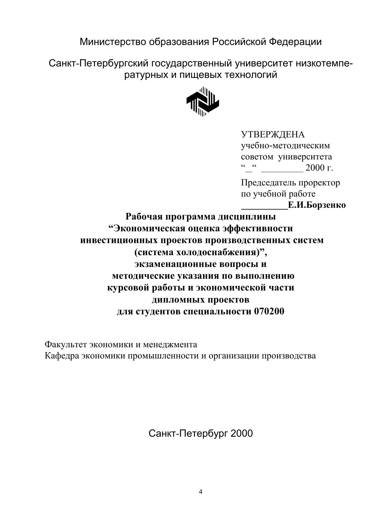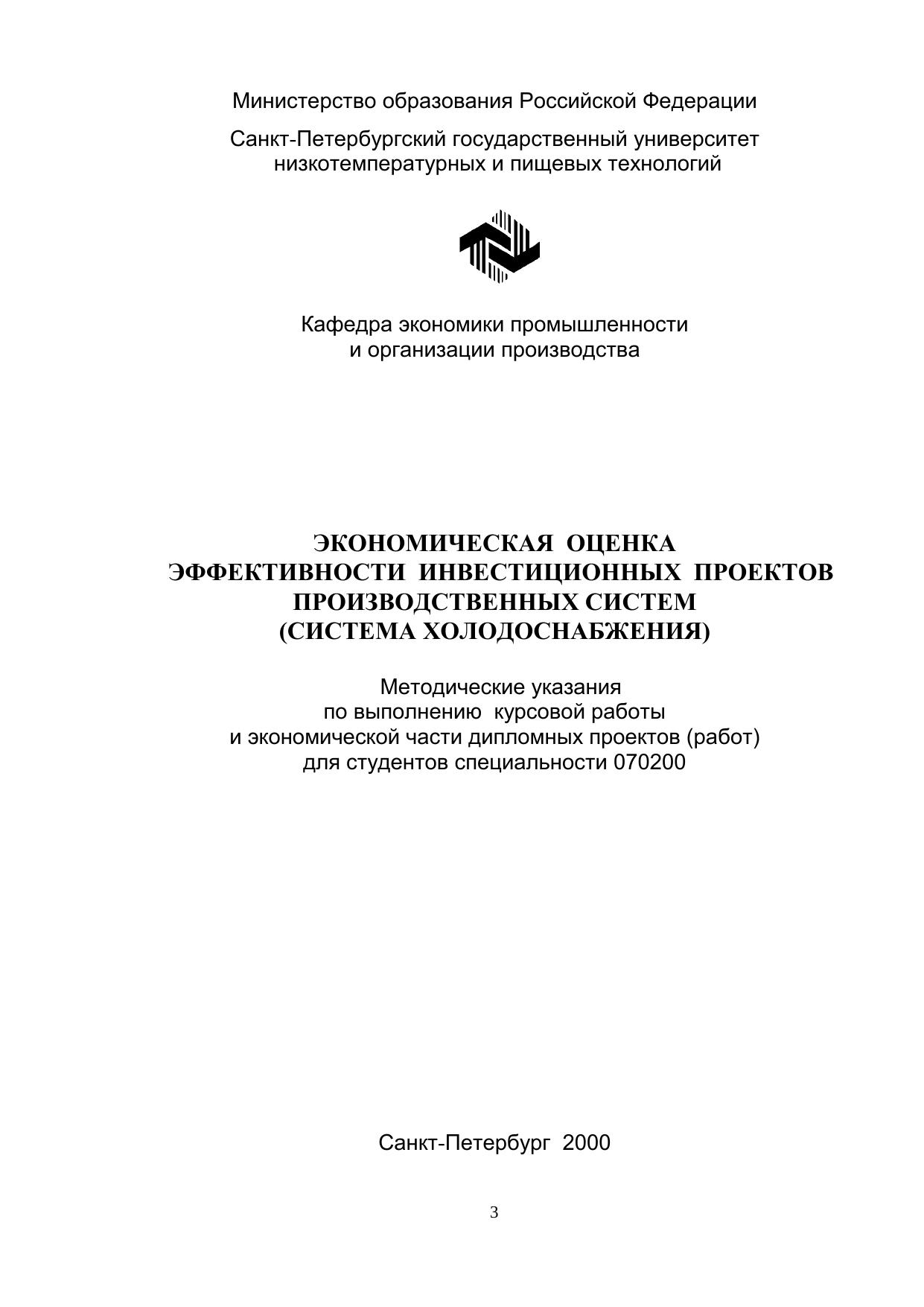 Экономическая оценка эффективности инвестиционных проектов производственных систем (систем холодоснабжения): Метод. указания по выполнению курсовой работы и экономической части дипломных проектов (работ) для студентов спец. 070200