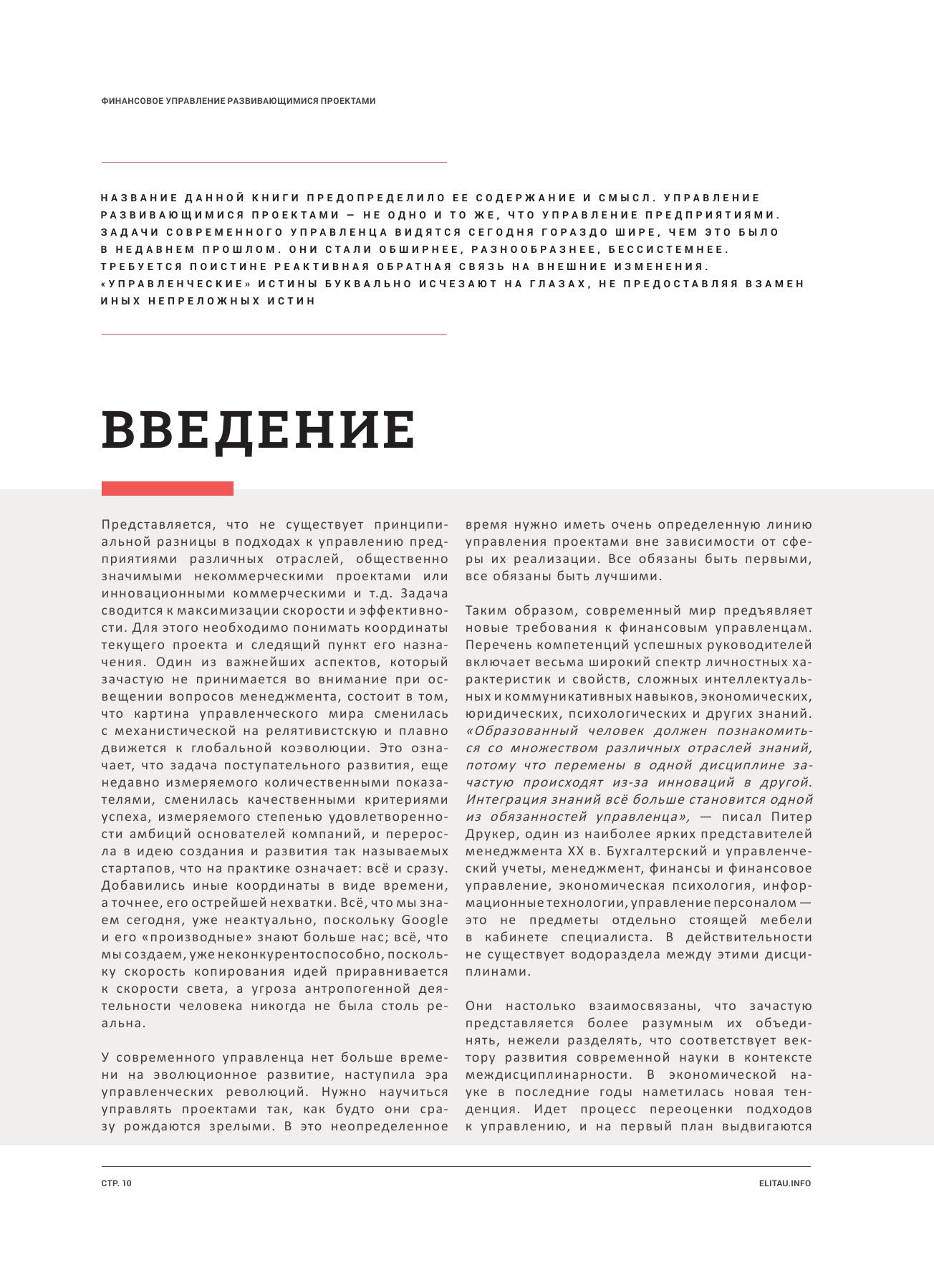 «Образованный человек должен познакомиться с множеством различных отраслей знаний в самых разных дисциплинах, потому что перемены в одной дисциплине зачастую происходят из-за инноваций в другой. Интеграция знаний все больше становится одной из обязанностей управленца...», — писал Питер Друкер, гуманист, один из наиболее ярких представителей менеджмента ХХ века. Данное пособие предлагается читателю как первый этап знакомства с дисциплиной «Финансы». Бухгалтерский и управленческий учеты, менеджмент, финансы и финансовое управление — это не предметы отдельно стоящей мебели в кабинете специалиста. В действительности не существует «водораздела» между этими дисциплинами.